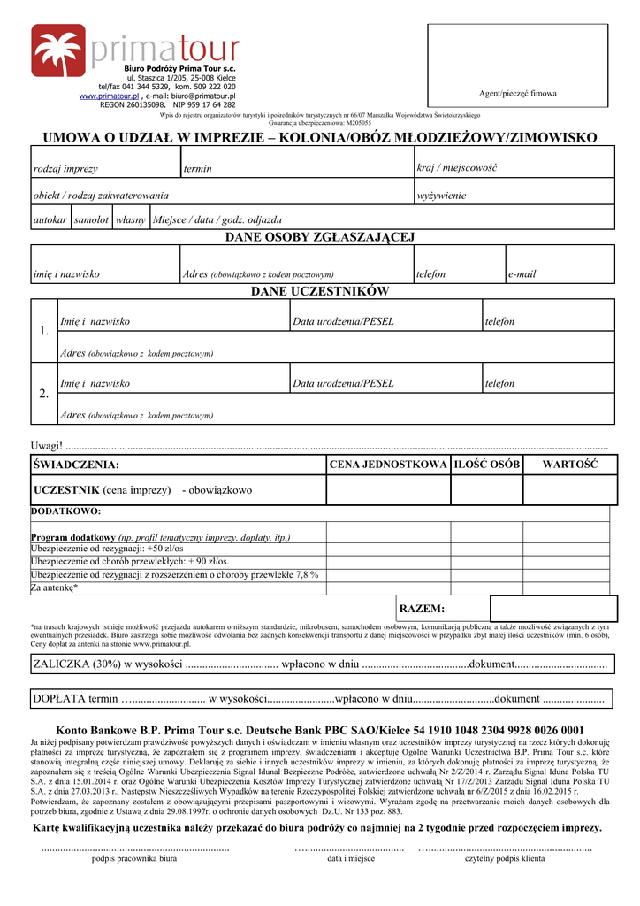 Biuro Podróży Prima Tour s.c. ul. Staszica 1/205, 25-008 Kielce tel/fax 041 344 5329, kom. 509 222 020 www.primatour.pl , e-mail: [email protected] REGON 260135098, NIP 959 17 64 282 Agent/pieczęć fimowa Wpis do rejestru organizatorów turystyki i pośredników turystycznych nr 66/07 Marszałka Województwa Świętokrzyskiego Gwarancja ubezpieczeniowa: M205055 UMOWA O UDZIAŁ W IMPREZIE – KOLONIA/OBÓZ MŁODZIEŻOWY/ZIMOWISKO rodzaj imprezy kraj / miejscowość termin obiekt / rodzaj zakwaterowania wyżywienie autokar samolot własny Miejsce / data / godz. odjazdu DANE OSOBY ZGŁASZAJĄCEJ imię i nazwisko Adres (obowiązkowo z kodem pocztowym) telefon e-mail DANE UCZESTNIKÓW 1. Imię i nazwisko Adres (obowiązkowo z 2. telefon Data urodzenia/PESEL telefon kodem pocztowym) Imię i nazwisko Adres (obowiązkowo z Data urodzenia/PESEL kodem pocztowym) Uwagi! .......................................................................................................................................................................................................... CENA JEDNOSTKOWA ILOŚĆ OSÓB ŚWIADCZENIA: UCZESTNIK (cena imprezy) WARTOŚĆ - obowiązkowo DODATKOWO: Program dodatkowy (np. profil tematyczny imprezy, dopłaty, itp.) Ubezpieczenie od rezygnacji: +50 zł/os Ubezpieczenie od chorób przewlekłych: + 90 zł/os. Ubezpieczenie od rezygnacji z rozszerzeniem o choroby przewlekłe 7,8 % Za antenkę* RAZEM: *na trasach krajowych istnieje możliwość przejazdu autokarem o niższym standardzie, mikrobusem, samochodem osobowym, komunikacją publiczną a także możliwość związanych z tym ewentualnych przesiadek. Biuro zastrzega sobie możliwość odwołania bez żadnych konsekwencji transportu z danej miejscowości w przypadku zbyt małej ilości uczestników (min. 6 osób), Ceny dopłat za antenki na stronie www.primatour.pl. ZALICZKA (30%) w wysokości ................................. wpłacono w dniu ......................................dokument................................. DOPŁATA termin ….......................... w wysokości........................wpłacono w dniu.............................dokument ...................... Konto Bankowe B.P. Prima Tour s.c. Deutsche Bank PBC SAO/Kielce 54 1910 1048 2304 9928 0026 0001 Ja niżej podpisany potwierdzam prawdziwość powyższych danych i oświadczam w imieniu własnym oraz uczestników imprezy turystycznej na rzecz których dokonuję płatności za imprezę turystyczną, że zapoznałem się z programem imprezy, świadczeniami i akceptuje Ogólne Warunki Uczestnictwa B.P. Prima Tour s.c. które stanowią integralną część niniejszej umowy. Deklaruję za siebie i innych uczestników imprezy w imieniu, za których dokonuję płatności za imprezę turystyczną, że zapoznałem się z treścią Ogólne Warunki Ubezpieczenia Signal Idunal Bezpieczne Podróże, zatwierdzone uchwałą Nr 2/Z/2014 r. Zarządu Signal Iduna Polska TU S.A. z dnia 15.01.2014 r. oraz Ogólne Warunki Ubezpieczenia Kosztów Imprezy Turystycznej zatwierdzone uchwałą Nr 17/Z/2013 Zarządu Signal Iduna Polska TU S.A. z dnia 27.03.2013 r., Następstw Nieszczęśliwych Wypadków na terenie Rzeczypospolitej Polskiej zatwierdzone uchwałą nr 6/Z/2015 z dnia 16.02.2015 r. Potwierdzam, że zapoznany zostałem z obowiązującymi przepisami paszportowymi i wizowymi. Wyrażam zgodę na przetwarzanie moich danych osobowych dla potrzeb biura, zgodnie z Ustawą z dnia 29.08.1997r. o ochronie danych osobowych Dz.U. Nr 133 poz. 883. Kartę kwalifikacyjną uczestnika należy przekazać do biura podróży co najmniej na 2 tygodnie przed rozpoczęciem imprezy. ...................................................................... …..................................... …............................................................. podpis pracownika biura data i miejsce czytelny podpis klienta