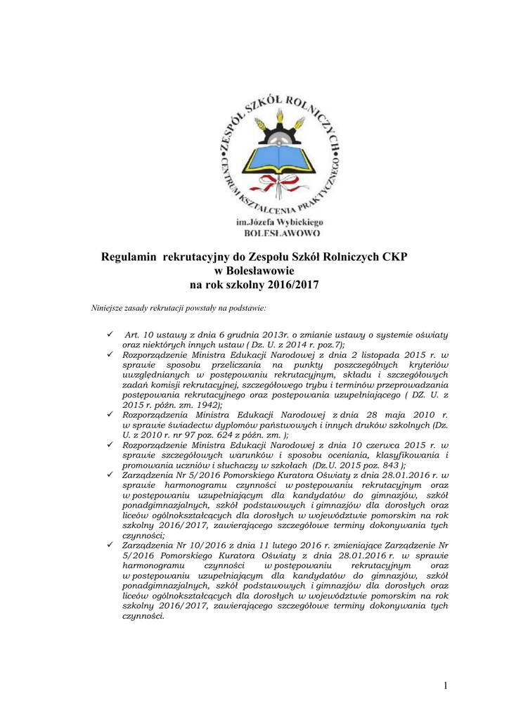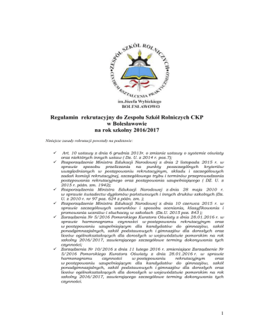 Regulamin rekrutacyjny do Zespołu Szkół Rolniczych CKP w Bolesławowie na rok szkolny 2016/2017 Niniejsze zasady rekrutacji powstały na podstawie: Art. 10 ustawy z dnia 6 grudnia 2013r. o zmianie ustawy o systemie oświaty oraz niektórych innych ustaw ( Dz. U. z 2014 r. poz.7); Rozporządzenie Ministra Edukacji Narodowej z dnia 2 listopada 2015 r. w sprawie sposobu przeliczania na punkty poszczególnych kryteriów uwzględnianych w postępowaniu rekrutacyjnym, składu i szczegółowych zadań komisji rekrutacyjnej, szczegółowego trybu i terminów przeprowadzania postępowania rekrutacyjnego oraz postępowania uzupełniającego ( DZ. U. z 2015 r. późn. zm. 1942); Rozporządzenia Ministra Edukacji Narodowej z dnia 28 maja 2010 r. w sprawie świadectw dyplomów państwowych i innych druków szkolnych (Dz. U. z 2010 r. nr 97 poz. 624 z późn. zm. ); Rozporządzenie Ministra Edukacji Narodowej z dnia 10 czerwca 2015 r. w sprawie szczegółowych warunków i sposobu oceniania, klasyfikowania i promowania uczniów i słuchaczy w szkołach (Dz.U. 2015 poz. 843 ); Zarządzenia Nr 5/2016 Pomorskiego Kuratora Oświaty z dnia 28.01.2016 r. w sprawie harmonogramu czynności w postępowaniu rekrutacyjnym oraz w postępowaniu uzupełniającym dla kandydatów do gimnazjów, szkół ponadgimnazjalnych, szkół podstawowych i gimnazjów dla dorosłych oraz liceów ogólnokształcących dla dorosłych w województwie pomorskim na rok szkolny 2016/2017, zawierającego szczegółowe terminy dokonywania tych czynności; Zarządzenia Nr 10/2016 z dnia 11 lutego 2016 r. zmieniające Zarządzenie Nr 5/2016 Pomorskiego Kuratora Oświaty z dnia 28.01.2016 r. w sprawie harmonogramu czynności w postępowaniu rekrutacyjnym oraz w postępowaniu uzupełniającym dla kandydatów do gimnazjów, szkół ponadgimnazjalnych, szkół podstawowych i gimnazjów dla dorosłych oraz liceów ogólnokształcących dla dorosłych w województwie pomorskim na rok szkolny 2016/2017, zawierającego szczegółowe terminy dokonywania tych czynności. 1 § 1. Przyjmowanie dokumentów od kandydatów 1. W celu przeprowadzenia postępowania rekrutacyjnego na rok szkolny 2016/2017 do szkół ponadgimnazjalnych w powiecie starogardzkim szkoły prowadzą scentralizowany elektroniczny nabór przez Internet: www.powiatstarogard.pl 2. Kandydaci do szkoły mogą rejestrować się w systemie w: a) macierzystym gimnazjum, b) szkole ponadgimnazjalnej pierwszego wyboru, c) punkcie informacyjnym o naborze, tj. w Wydziale Edukacji Starostwa Powiatowego w Starogardzie Gdańskim , ul. Kościuszki 17, d) dowolnym innym miejscu, które dysponuje dostępem do Internetu ( np. w domu, kawiarence internetowej). 3. W celu przeprowadzenia postępowania rekrutacyjnego na rok szkolny 2016/2017 do szkół ponadgimnazjalnych, z dniem 9 maja 2016r. rozpoczynają działalność: 1) Szkolne Punkty Informacyjne, mieszczące się w budynkach szkół, w których można uzyskać informacje związane z rekrutacją, a także składać podania o przyjęcie do szkoły, 2) Powiatowy Punkt Informacyjny z siedzibą w budynku Starostwa Powiatowego w Starogardzie Gd. ul. Kościuszki 17, tel. (058) 76 73 576, koordynujący rekrutację. 4. Aktualne informacje dotyczące terminów składania dokumentów, warunków przyjęć i wyników rekrutacji oraz informacje o wolnych miejscach będą zamieszczane na wyodrębnionych tablicach ogłoszeń w szkołach. 5. Kandydaci, składając podania do szkoły, posługują się trzema kopiami świadectwa ukończenia gimnazjum i trzema kopiami zaświadczenia o szczegółowych wynikach egzaminu gimnazjalnego poświadczonymi przez dyrektora gimnazjum, które kandydat ukończył. Oryginały tych dokumentów kandydat składa w terminie, o którym mowa w § 3 ust. 1 pkt. 2 lub § 3 ust. 1 pkt. 5. 6. W okresie rekrutacji tj. od 9 maja do 22 czerwca 2016 r. kandydaci do szkół ponadgimnazjalnych prowadzonych przez Powiat Starogardzki wybierają na stronie internetowej Systemu Elektronicznego Naboru szkoły i klasy, do których chcą być przyjęci: a) Kandydat może wybrać maksymalnie trzy szkoły, b) Kandydat może wybrać dowolną liczbę klas w każdej z wybranych trzech szkół, c) Kandydat ustala kolejność wybranych klas, klasa wybrana jako pierwsza jest ta, na której kandydatowi najbardziej zależy. Ostatnia z zaznaczonych to ta, na której kandydatowi najmniej zależy. Są to tzw. preferencje kandydata. Szkoła, prowadząca klasę wybraną jako pierwszą jest traktowana jako szkoła pierwszego wyboru. 7. W systemie rekrutacji elektronicznej kandydat posługuje się kopią świadectwa ukończenia gimnazjum i kopią zaświadczenia o szczegółowych wynikach egzaminu gimnazjalnego opatrzonymi numerem "1". Na życzenie ucznia lub jego rodzica (prawnego opiekuna) dyrektor gimnazjum zobowiązany jest wydać pozostałe kopie obu ww. dokumentów opatrzone odpowiednio numerami "2" i "3", które mogą być wykorzystane w rekrutacji poza systemem elektronicznym. 8. Po wyborze szkół Kandydaci ubiegający się o przyjecie do szkół ponadgimnazjalnych, biorących udział w elektronicznym naborze, składają w terminie rekrutacji w pierwszej z wybranych szkół: 2 1) wniosek o przyjęcie do szkoły wydrukowany z Systemu Elektronicznego Naboru podpisane przez rodziców, 2) świadectwo ukończenia gimnazjum lub poświadczoną kopię świadectwa ukończenia gimnazjum opatrzoną nr "1", 3) zaświadczenie o wynikach egzaminu gimnazjalnego lub poświadczoną kopię zaświadczenia o wynikach egzaminu gimnazjalnego opatrzoną nr "1", 4) zaświadczenie o uzyskaniu tytułu laureata lub finalisty olimpiad lub konkursów, o których mowa w § 2 ust 2, pkt 3; 5) opinię wydaną przez publiczną poradnię psychologiczno- pedagogiczną, w tym publiczną poradnię specjalistyczną , w sprawie pierwszeństwa w przyjęciu ucznia z problemami zdrowotnymi , 6) dokumenty potwierdzające spełnienie kryteriów, o których mowa w § 2 ust 5, pkt 1-7 ( jeśli komisja rek