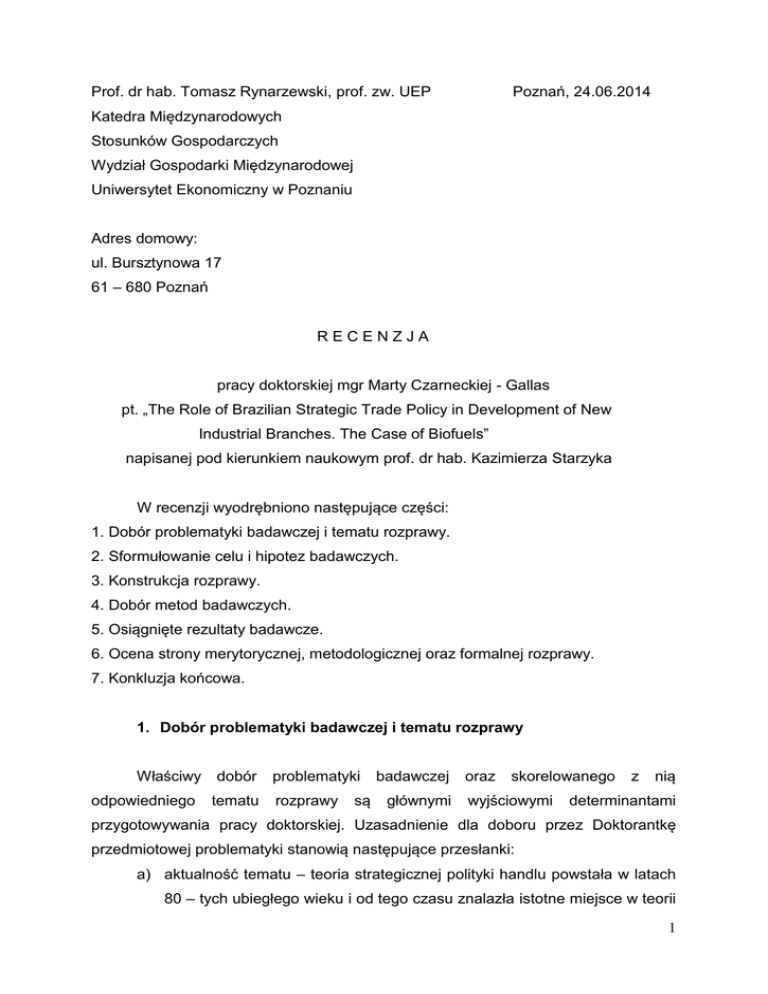 Poznań, 24.06.2014 Prof. dr hab. Tomasz Rynarzewski, prof. zw. UEP Katedra Międzynarodowych Stosunków Gospodarczych Wydział Gospodarki Międzynarodowej Uniwersytet Ekonomiczny w Poznaniu Adres domowy: ul. Bursztynowa 17 61 – 680 Poznań RECENZJA pracy doktorskiej mgr Marty Czarneckiej - Gallas pt. „The Role of Brazilian Strategic Trade Policy in Development of New Industrial Branches. The Case of Biofuels” napisanej pod kierunkiem naukowym prof. dr hab. Kazimierza Starzyka W recenzji wyodrębniono następujące części: 1. Dobór problematyki badawczej i tematu rozprawy. 2. Sformułowanie celu i hipotez badawczych. 3. Konstrukcja rozprawy. 4. Dobór metod badawczych. 5. Osiągnięte rezultaty badawcze. 6. Ocena strony merytorycznej, metodologicznej oraz formalnej rozprawy. 7. Konkluzja końcowa. 1. Dobór problematyki badawczej i tematu rozprawy Właściwy odpowiedniego dobór tematu problematyki rozprawy są badawczej głównymi oraz skorelowanego wyjściowymi z nią determinantami przygotowywania pracy doktorskiej. Uzasadnienie dla doboru przez Doktorantkę przedmiotowej problematyki stanowią następujące przesłanki: a) aktualność tematu – teoria strategicznej polityki handlu powstała w latach 80 – tych ubiegłego wieku i od tego czasu znalazła istotne miejsce w teorii 1 i praktyce polityki handlu międzynarodowego. Jakkolwiek przesłanki teoretyczne koncepcji strategicznej polityki handlu są traktowane jako spójne i przekonujące o tyle kontrowersje wśród badaczy budzi pozytywny wpływ jej praktycznego zastosowania na dobrobyt kraju. W tym sensie praca doktorska magister Marty Czarneckiej-Gallas wpisuje się w nurt ożywionej dyskusji dotyczącej przedmiotowych kwestii wnosząc do niej wartościowe elementy merytoryczne bazujące także na analizie empirycznej. Należy tu również dodać, iż dotąd problematyka strategicznej polityki handlu była głównie utożsamiana z krajami wysokorozwiniętymi. Wprowadzenie do rozważań kraju nowouprzemysłowionego w postaci Brazylii stanowi także o oryginalności prowadzonych przez Doktorantkę rozważań; b) luka poznawcza – problematyka strategicznej polityki handlu nie znajduje ciągle zasługującego jej miejsca w polskim piśmiennictwie ekonomicznym. Dotąd ukazało się jedno kompleksowe opracowanie dotyczące tej problematyki i stosunkowo niewielka liczba artykułów. Z tego punktu widzenia należy uznać, iż praca doktorska magister Czarneckiej-Gallas wypełnia istniejącą lukę poznawczą dotyczącą przedmiotowej problematyki; c) wartość praktyczna – w literaturze światowej poświęconej strategicznej polityce handlu stosunkowo niewiele miejsca poświęca się aspektowi praktycznego zastosowania tej koncepcji. Bardzo często w potocznym ujęciu ma ona przede wszystkim wymiar teoretyczny słabo dający się zweryfikować w praktyce. Wprawdzie istnieje kilka kluczowych przesłanek, których spełnienie według badaczy problemu może stanowić o sukcesie praktycznego zastosowania tej formy polityki, ale spektrum branż w których strategiczna polityka handlu została dotąd zastosowana jest stosunkowo wąskie. Uwzględnienie przykładu branży produkcji biopaliw stanowi niewątpliwe uzupełnienie wymiaru praktycznego przedmiotowego zagadnienia. Powyższe przesłanki cechujące dokonany przez Doktorantkę dobór problematyki badawczej i tematyki rozprawy doktorskiej w pełni uzasadniają poświęcenie zagadnieniom strategicznej polityki handlu pracy doktorskiej. 2 2. Sformułowanie celu i hipotez badawczych Jako główny cel pracy doktorskiej Autorka przyjęła „przedstawienie roli strategicznej polityki handlu w rozwoju nowych branż przemysłowych na podstawie brazylijskiej strategicznej polityki zastosowanej w krajowym sektorze biopaliw” (s. 9). 1 Sformułowanemu w ten sposób celowi towarzyszą teoretyczne i empiryczne zadania badawcze, które Doktorantka określiła w postaci szeregu pytań (s. 9). Wśród nich między innymi: „jak można zdefiniować strategiczną politykę handlu w świetle przemian ekonomicznych XXI wieku…”, „jakie są kluczowe czynniki sukcesu dla wyboru „strategicznego sektora/branży””, „czy strategiczna polityka handlu może być instrumentem rozszerzania procesu industrializacji w krajach rozwijających się”. Treść celu zdefiniowanego przez Autorkę nie budzi wątpliwości oddając znaczenie i oryginalność stawianego problemu badawczego. We Wstępie pracy Doktorantka definiuje tezę główną oraz dwie hipotezy (s. 9 – 10), a także formułuje 11 zadań badawczych, których realizacja w Jej opinii winna umożliwić weryfikację obu hipotez. Rozważania prowadzone w tej części pracy są nie w pełni precyzyjne i budzą pewne wątpliwości interpretacyjne zwłaszcza w kwestii rozróżnienia pomiędzy pojęciem tezy a hipotezy. Przyjmuję, iż Autorka formułując tezę intepretowała ją jako pewne prawdziwe, a stąd nie wymagające udowodnienia stwierdzenie, zaś hipotezy traktuje jako stwierdzenia wymagające weryfikacji. W przyjęciu takiego rozróżnienia pomiędzy obu pojęciami przez Autorkę utwierdza mnie sposób prezentowania stwierdzeń definiowanych jako teza oraz hipotezy. Autorka stwierdza mianowicie, iż główną tezą dysertacji jest „znaczenie strategicznej polityki handlu dla zdolności tworzenia konkurencyjnej produkcji i w konsekwencji dobrobytu krajowego” (s. 9). W pracy przyjmuje się zatem – pisze Habilitantka w uzasadnieniu poprzedniego stwierdzenia – że „strategiczna polityka handlu podnosi konkurencyjność firm krajowych zagranicą i poprzez to pomaga im uzyskać nadzwyczajne zyski na rynkach trzecich” (s. 9). Wymienione dwie już tezy Autorka uzupełnia kolejną w postaci stwierdzenia, iż „strategiczna polityka handlu przyczynia się także do rozwoju nowych branż przemysłowych” (s. 9). Dalej Autorka pisze, iż bazą dla weryfikacji (!) tezy jest analiza sektora energetycznego Brazylii. Wprowadza