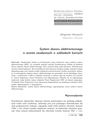 R E S O C J A L I Z A C J A P O L SK A POLISH JOURNAL 10/2015 OF SOCIAL REHABILITATION ISSN 2081-3767 e-ISSN 2392-2656 D O N I E S I E N I A Z B A D A Ń Zbigniew Nowacki Zakład Karny w Pińczowie System dozoru elektronicznego w ocenie osadzonych w zakładach karnych Abstrakt: Przedmiotem badań są formułowane przez skazanych oceny systemu dozoru elektronicznego (SDE). Za narzędzie posłużył autorski Kwestionariusz Ankiety do Badania Oceny Systemu Dozoru Elektronicznego, który zawierał także skalę kłamstwa. Kontrolowano również nastrój badanych. Aby zweryfikować sformułowane hipotezy przyjęto metodę sondażu diagnostycznego oraz metody analizy statystyczno-porównawczej. Analiza czynnikowa wykazała, że postrzeganie systemu dozoru elektronicznego nie sprowadza się do jednolitego stanowiska – przekonania o SDE to niespójny konstrukt, w którym dają się wyróżnić trzy czynniki, tj.: Oceny Negatywne, Oceny Pozytywne oraz Stygmatyzacja. Okazało się, że niegrypsujący więźniowie mają istotnie wyższe natężenie Ocen Negatywnych SDE niż skazani grypsujący. W zakresie Ocen Pozytywnych oraz odczuwanej Stygmatyzacji nie stwierdzono istotnych różnic między niegrypsującymi a grypsującymi. Słowa kluczowe: system dozoru elektronicznego, stygmatyzacja, ocena systemu dozoru elektronicznego. Wprowadzenie Poszukiwanie odpowiedzi, dlaczego systemy penitencjarne nie spełniają pokładanych wobec nich oczekiwań, stanowiąc przy tym poniżające doświadczenie dla osób pozbawionych wolności, zaprzątało myśli wielu badaczy (Eysenck, Eysenck 1998, s. 59). Ponad wszelką wątpliwość ustalono, że środowisko więzienne generuje wiele sytuacji niekorzystnych dla człowieka (Ciosek, Kmiecik 1987, s. 141; (s. 229–244) 229 Zbigniew Nowacki Szaszkiewicz 1997, s. 11). Niekwestionowanym źródłem naukowych danych dotyczących istotnych aspektów funkcjonowania człowieka w więzieniu był rozpoczęty 14 sierpnia 1971 przez Philipa Zimbardo eksperyment więzienny (Zimbardo 1973, s. 243–256). Eksperymentalna symulacja więzienia doprowadziła Zimbardo do odkrycia bodajże najważniejszej przyczyny niedomagania więzienia, a mianowicie nieprawidłowej struktury władzy. W psychologii społecznej władza jest niezwykle ważną, choć trzeba także dodać, zaniedbywaną zmienną (Eysenck, Eysenck 1998, s. 68). Zdaniem Hansa i Michaela Eysenck, personel więzień nie dostrzega i nie nagradza skazanych za poprawne zachowanie, jednocześnie zauważa negatywne zachowanie i za nie karze (Eysenck, Eysenck 1998, s. 68). Rozważając społeczne funkcjonowanie człowieka (zwłaszcza w izolacji więziennej) trudno pominąć ustalenia teorii zachowania (Malewski 1975, s. 372–385). Należy oczekiwać, że ignorowanie mechanizmu uczenia się instrumentalnego oraz mechanizmu klasycznego warunkowania nie pozostanie bez konsekwencji dla skuteczności oddziaływań, ponadto może prowadzić do wyuczonej bezradności skazanych. Hans i Michael Eysenck, upatrując przyczyn słabości systemów penitencjarnych, wskazują trzy ważne obszary poszukiwań: związane z osobami pozbawionymi wolności, personelem więziennym oraz strukturą organizacyjną i warunkami fizycznymi więzienia. Na każdej płaszczyźnie mogą pojawić się zjawiska niekorzystnie wpływające na efektywność oddziaływań penitencjarnych (Eysenck, Eysenck 1998, s. 59). Badacze podkreślają jednak, że skuteczna resocjalizacja jest możliwa. Aby tak się stało, terapia powinna koniecznie uwzględniać osobowość i kategorie przestępców, wiek oraz ich płeć (Eysenck, Eysenck 1998, s. 262). Idea systemu dozoru elektronicznego System dozoru elektronicznego (dalej: SDE) stwarza inne, zgoła odmienne warunki odbywania kary pozbawienia wolności. W przypadku odbywania kary w SDE nie występują problemy związane z personelem więziennym oraz strukturą organizacyjną i warunkami fizycznymi więzienia. Zanika negatywny wpływ społeczny ze strony zdemoralizowanych skazanych. Pojawiają się jednak inne ważne kwestie, jak choćby społeczny odbiór nowego systemu odbywania kary pozbawienia wolności oraz koszty psychologiczne ponoszone przez osoby bliskie skazanemu, natomiast z punktu widzenia skazanego – odczuwana stygmatyzacja oraz wyzwania związane z samokontrolą. Ponieważ zagadnienie czasu jest dla skazanych niezmiernie ważne (Lewandowski 1975, s. 7 i n.), w pracy sformułowano problemy badawcze odnoszące się do zmiennych czasowych (problem drugi oraz trzeci). Odniesienie się do występującego w literaturze przedmiotu samopodziału skazanych (uwzględnienie różnych grup więźniów) generowało postawienie problemu szóstego. Zaś rozpatrywanie wybranych aspektów położenia osoby skazanego, spowodowało sformułowanie problemów pierwszego, czwartego oraz piątego. Okre230 (s. 229–244) System dozoru elektronicznego... ślenie problemów badawczych zostanie poprzedzone podstawowymi informacjami dotyczącymi systemu dozoru elektronicznego. Koncepcję zastosowania elektronicznego monitoringu do kontroli zachowania osób, którymi zainteresowany jest wymiar sprawiedliwości, wprowadził do literatury amerykański psycholog Ralph Schwitzgebel (1967). Choć zarys teoretyczny wykorzystania elektroniki do kontrolowania zachowania osób był gotowy w 1964 roku, eksperyment z jego praktycznym zastosowaniem rozpoczęto dopiero w roku 1983 w stanie Nowy Meksyk. Lata osiemdziesiąte w Stanach Zjednoczonych to czas realizacji pierwszych programów elektronicznego monitoringu. W 1987 roku w tego rodzaju programach uczestniczyło prawie 1000 skazanych w 21 stanach (Sielicki 2005, s. 15). Początkowo opierano się na zwykłych liniach telefonicznych. Z czasem zaczęto wykorzystywać telefonię komórkową GSM. W 1997 roku na Florydzie zastosowano technologię aktywnego GPS, co znacząco zintensyfikowało kontrolę zachowania skazanego, stwarzając m.in. możliwość zaprogramowania obszarów, w których obecnoś