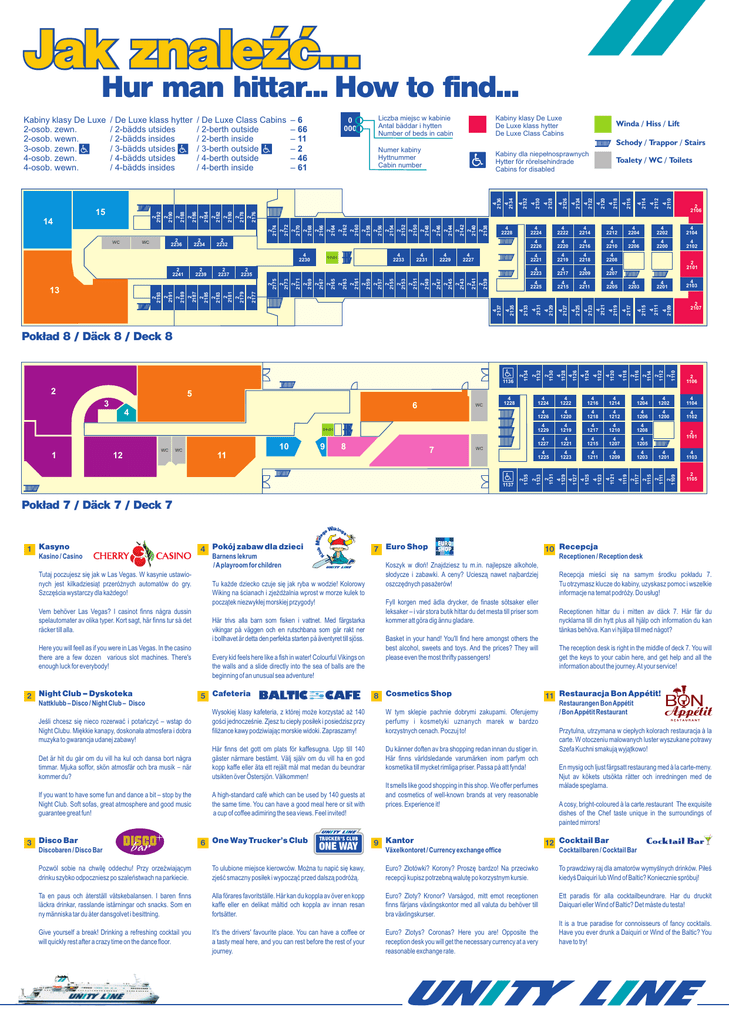 J a k z n a l e źć. . . H u r m a n h i t t a r . . . H o w t o f i n d . . . –6 – 66 – 11 –2 – 46 – 61 0 000 Liczba miejsc w kabinie Antal bäddar i hytten Number of beds in cabin Kabiny klasy De Luxe De Luxe klass hytter De Luxe Class Cabins 4 2110 4 2114 4 2112 4 2118 4 2116 4 2122 T o a l e t y / W C / T o i l e t s 4 2120 4 2124 4 2126 4 2130 Kabiny dla niepełnosprawnych Hytter för rörelsehindrade Cabins for disabled 2 2192 2 2190 2 2188 2 2186 2 2184 2 2182 2 2180 2 2178 2 2176 15 W i n d a / H i s s / L i f t S c h o d y / T r a p p o r / S t a i r s Numer kabiny Hyttnummer Cabin number 4 2128 / De Luxe Class Cabins / 2-berth outside / 2-berth inside / 3-berth outside / 4-berth outside / 4-berth inside 4 2132 / De Luxe klass hytter / 2-bädds utsides / 2-bädds insides / 3-bädds utsides / 4-bädds utsides / 4-bädds insides 4 2136 4 2134 Kabiny klasy De Luxe 2-osob. zewn. 2-osob. wewn. 3-osob. zewn. 4-osob. zewn. 4-osob. wewn. 2 2174 2 2172 2 2170 2 2168 2 2166 2 2164 2 2162 2 2160 2 2158 2 2156 2 2154 2 2152 2 2150 2 2148 2 2146 2 2144 2 2142 2 2140 2 2138 14 WC 2 2236 WC 2 2234 4 2230 2 2239 2 2237 4 2233 WINDA 4 2229 4 2231 4 2227 2 2235 2 2175 2 2173 2 2171 2 2169 2 2167 2 2165 2 2163 2 2161 2 2159 2 2157 2 2155 2 2153 2 2151 2 2149 2 2147 2 2145 2 2143 2 2141 2 2139 2 2241 4 2228 2 2232 4 2224 4 2222 4 2214 4 2212 4 2204 4 2202 4 2104 4 2226 4 2220 4 2216 4 2210 4 2206 4 2200 4 2102 4 2221 4 2219 4 2218 4 2208 4 2223 4 2217 4 2209 4 2207 4 2225 4 2215 4 2211 4 2205 2 2101 4 2203 4 2201 4 2109 4 2111 4 2115 4 2117 4 2119 4 2121 4 2123 4 2129 2 1130 4 2125 4 2131 2 1132 4 2127 4 2133 2 1134 4 2137 4 2135 2 2193 2 2191 2 2189 2 2187 2 2185 2 2183 2 2181 2 2179 2 2177 13 2 2106 4 2103 2 2107 1137 2 1110 2 1112 2 1116 2 1114 4 1118 4 1120 4 1122 4 1124 4 1104 4 1200 4 1102 4 1229 4 1219 4 1217 4 1210 4 1208 4 1227 4 1221 4 1215 4 1207 4 1205 4 1225 4 1223 4 1211 4 1209 4 1203 2 1101 4 1201 2 1109 7 4 1202 4 1206 2 1111 11 4 1204 4 1212 2 1117 WC WC 4 1214 4 1218 2 1115 WC 8 4 1216 4 1220 4 1121 12 9 2 1135 1 10 4 1222 4 1226 4 1119 WINDA 2 1106 4 1224 4 1123 4 1228 4 1125 WC 4 1129 4 1127 6 4 2 1131 5 3 2 1133 1136 2 4 1128 4 1126 P o k ła d 8 / D ä c k 8 / D e c k 8 4 1103 2 1105 P o k ła d 7 / D ä c k 7 / D e c k 7 K a s y n o 1 Kasino / Casino Tutaj poczujesz się jak w Las Vegas. W kasynie ustawionych jest kilkadziesiąt przeróżnych automatów do gry. Szczęścia wystarczy dla każdego! Vem behöver Las Vegas? I casinot finns några dussin spelautomater av olika typer. Kort sagt, här finns tur så det räcker till alla. Here you will feell as if you were in Las Vegas. In the casino there are a few dozen various slot machines. There's enough luck for everybody! N i g h t C l u b –D y s k o t e k a 2 Nattklubb – Disco / Night Club – Disco P o k ó j z a b a w d l a d z i e c i 4 Barnens lekrum / A playroom for children Tu każde dziecko czuje się jak ryba w wodzie! Kolorowy Wiking na ścianach i zjeżdżalnia wprost w morze kulek to początek niezwykłej morskiej przygody! Här trivs alla barn som fisken i vattnet. Med färgstarka vikingar på väggen och en rutschbana som går rakt ner i bollhavet är detta den perfekta starten på äventyret till sjöss. Every kid feels here like a fish in water! Colourful Vikings on the walls and a slide directly into the sea of balls are the beginning of an unusual sea adventure! C a f e t e r i a 5 E u r o S h o p 7 Koszyk w dłoń! Znajdziesz tu m.in. najlepsze alkohole, słodycze i zabawki. A ceny? Ucieszą nawet najbardziej oszczędnych pasażerów! Fyll korgen med ädla drycker, de finaste sötsaker eller leksaker – i vår stora butik hittar du det mesta till priser som kommer att göra dig ännu gladare. Basket in your hand! You'll find here amongst others the best alcohol, sweets and toys. And the prices? They will please even the most thrifty passengers! C o s m e t i c s S h o p 8 Wysokiej klasy kafeteria, z której może korzystać aż 140 gości jednocześnie. Zjesz tu ciepły posiłek i posiedzisz przy filiżance kawy podziwiając morskie widoki. Zapraszamy! W tym sklepie pachnie dobrymi zakupami. Oferujemy perfumy i kosmetyki uznanych marek w bardzo korzystnych cenach. Poczuj to! Det är hit du går om du vill ha kul och dansa bort några timmar. Mjuka soffor, skön atmosfär och bra musik – när kommer du? Här finns det gott om plats för kaffesugna. Upp till 140 gäster närmare bestämt. Välj själv om du vill ha en god kopp kaffe eller äta ett rejält mål mat medan du beundrar utsikten över Östersjön. Välkommen! Du känner doften av bra shopping redan innan du stiger in. Här finns världsledande varumärken inom parfym och kosmetika till mycket rimliga priser. Passa på att fynda! If you want to have some fun and dance a bit – stop by the Night Club. Soft sofas, great atmosphere and good music guarantee great fun! A high-standard café which can be used by 140 guests at the same time. You can have a good meal here or sit with a cup of coffee adimiring the sea views. Feel invited! Jeśli chcesz się nieco rozerwać i potańczyć – wstąp do Night Clubu. Miękkie kanapy, doskonała atmosfera i dobra muzyka to gwarancja udanej zabawy! D i s c o B a r 3 Discobaren / Disco Bar O n e W a y T r u c k e r ’s C l u b 6 It smells like good shopping in this shop. We offer perfumes and cosmetics of well-known brands at very reasonable prices. Experience it! K a n t o r 9 Växelkontoret / Currency exchange office R e c e p c j a 1 0 Receptionen / Reception desk Recepcja mieści się na samym środku pokładu 7. Tu otrzymasz klucze do kabiny, uzyskasz pomoc i wszelkie informacje na temat podróży. Do usług! Receptionen hittar du i mitten av däck 7. Här får du nycklarna till din hytt plus all hjälp och information du kan tänkas behöva. Kan vi hjälpa till med något? The reception desk is right in the middle of deck 7. You will get the keys to your cabin here, and get help and all 