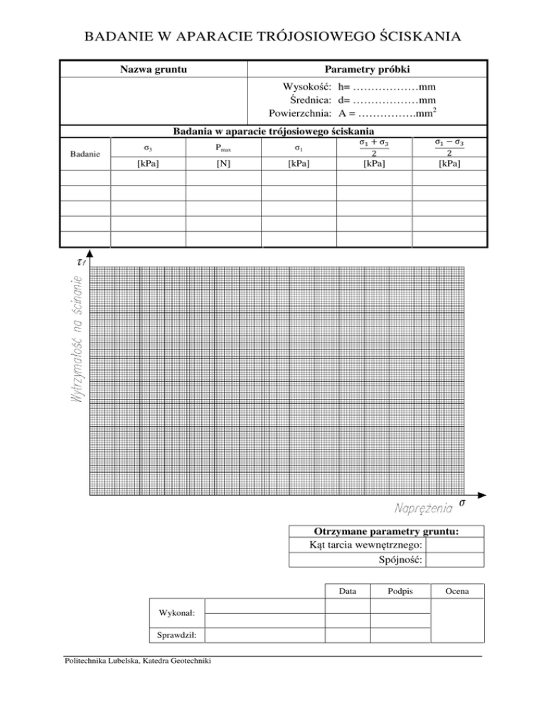 BADANIE W APARACIE TRÓJOSIOWEGO ŚCISKANIA Nazwa gruntu Parametry próbki Wysokość: h= ………………mm Średnica: d= ………………mm Powierzchnia: A = …………….mm2 Badania w aparacie trójosiowego ściskania Badanie σ3 Pmax σ1 σଵ + σଷ 2 σଵ − σଷ 2 [kPa] [N] [kPa] [kPa] [kPa] Otrzymane parametry gruntu: Kąt tarcia wewnętrznego: Spójność: Data Wykonał: Sprawdził: Politechnika Lubelska, Katedra Geotechniki Podpis Ocena