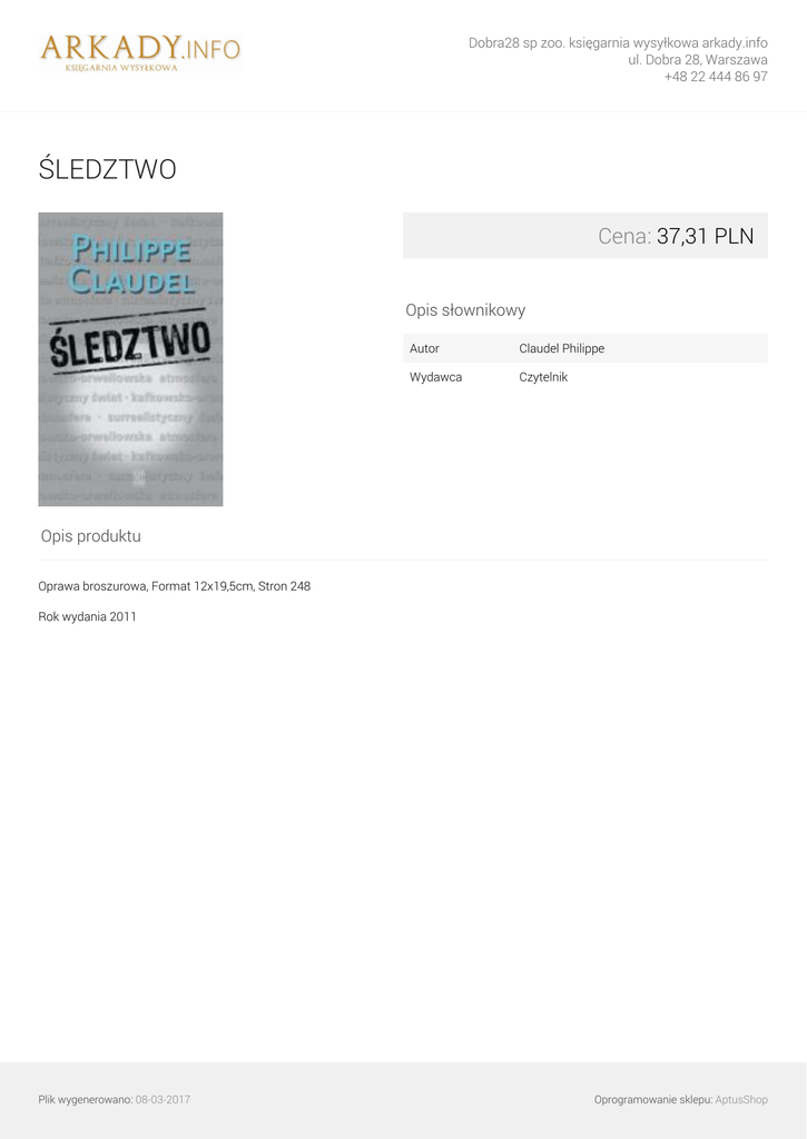 Dobra28 sp zoo. księgarnia wysyłkowa arkady.info ul. Dobra 28, Warszawa +48 22 444 86 97 ŚLEDZTWO Cena: 37,31 PLN Opis słownikowy Autor Claudel Philippe Wydawca Czytelnik Opis produktu Oprawa broszurowa, Format 12x19,5cm, Stron 248 Rok wydania 2011 Plik wygenerowano: 08-03-2017 Powered by TCPDF (www.tcpdf.org) Oprogramowanie sklepu: AptusShop