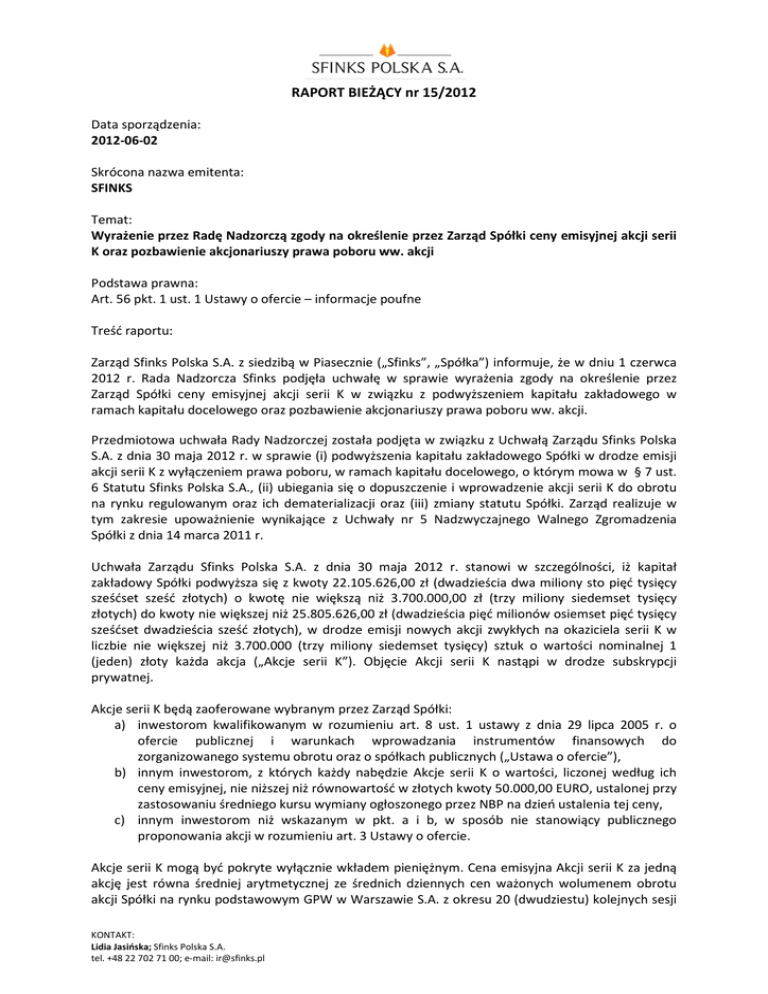 RAPORT BIEŻĄCY nr 15/2012 Data sporządzenia: 2012-06-02 Skrócona nazwa emitenta: SFINKS Temat: Wyrażenie przez Radę Nadzorczą zgody na określenie przez Zarząd Spółki ceny emisyjnej akcji serii K oraz pozbawienie akcjonariuszy prawa poboru ww. akcji Podstawa prawna: Art. 56 pkt. 1 ust. 1 Ustawy o ofercie – informacje poufne Treść raportu: Zarząd Sfinks Polska S.A. z siedzibą w Piasecznie („Sfinks”, „Spółka”) informuje, że w dniu 1 czerwca 2012 r. Rada Nadzorcza Sfinks podjęła uchwałę w sprawie wyrażenia zgody na określenie przez Zarząd Spółki ceny emisyjnej akcji serii K w związku z podwyższeniem kapitału zakładowego w ramach kapitału docelowego oraz pozbawienie akcjonariuszy prawa poboru ww. akcji. Przedmiotowa uchwała Rady Nadzorczej została podjęta w związku z Uchwałą Zarządu Sfinks Polska S.A. z dnia 30 maja 2012 r. w sprawie (i) podwyższenia kapitału zakładowego Spółki w drodze emisji akcji serii K z wyłączeniem prawa poboru, w ramach kapitału docelowego, o którym mowa w § 7 ust. 6 Statutu Sfinks Polska S.A., (ii) ubiegania się o dopuszczenie i wprowadzenie akcji serii K do obrotu na rynku regulowanym oraz ich dematerializacji oraz (iii) zmiany statutu Spółki. Zarząd realizuje w tym zakresie upoważnienie wynikające z Uchwały nr 5 Nadzwyczajnego Walnego Zgromadzenia Spółki z dnia 14 marca 2011 r. Uchwała Zarządu Sfinks Polska S.A. z dnia 30 maja 2012 r. stanowi w szczególności, iż kapitał zakładowy Spółki podwyższa się z kwoty 22.105.626,00 zł (dwadzieścia dwa miliony sto pięć tysięcy sześćset sześć złotych) o kwotę nie większą niż 3.700.000,00 zł (trzy miliony siedemset tysięcy złotych) do kwoty nie większej niż 25.805.626,00 zł (dwadzieścia pięć milionów osiemset pięć tysięcy sześćset dwadzieścia sześć złotych), w drodze emisji nowych akcji zwykłych na okaziciela serii K w liczbie nie większej niż 3.700.000 (trzy miliony siedemset tysięcy) sztuk o wartości nominalnej 1 (jeden) złoty każda akcja („Akcje serii K”). Objęcie Akcji serii K nastąpi w drodze subskrypcji prywatnej. Akcje serii K będą zaoferowane wybranym przez Zarząd Spółki: a) inwestorom kwalifikowanym w rozumieniu art. 8 ust. 1 ustawy z dnia 29 lipca 2005 r. o ofercie publicznej i warunkach wprowadzania instrumentów finansowych do zorganizowanego systemu obrotu oraz o spółkach publicznych („Ustawa o ofercie”), b) innym inwestorom, z których każdy nabędzie Akcje serii K o wartości, liczonej według ich ceny emisyjnej, nie niższej niż równowartość w złotych kwoty 50.000,00 EURO, ustalonej przy zastosowaniu średniego kursu wymiany ogłoszonego przez NBP na dzień ustalenia tej ceny, c) innym inwestorom niż wskazanym w pkt. a i b, w sposób nie stanowiący publicznego proponowania akcji w rozumieniu art. 3 Ustawy o ofercie. Akcje serii K mogą być pokryte wyłącznie wkładem pieniężnym. Cena emisyjna Akcji serii K za jedną akcję jest równa średniej arytmetycznej ze średnich dziennych cen ważonych wolumenem obrotu akcji Spółki na rynku podstawowym GPW w Warszawie S.A. z okresu 20 (dwudziestu) kolejnych sesji KONTAKT: Lidia Jasińska; Sfinks Polska S.A. tel. +48 22 702 71 00; e-mail: [email protected] okresu kończącego się na 10 (dziesięć) dni przed datą złożenia propozycji objęcia akcji, pomniejszona o 10% (dziesięć procent) tej kwoty, zaokrąglona w górę do pełnego grosza. Termin dokonywania wpłat na pokrycie Akcji serii K zostanie odrębnie ustalony przez Zarząd Spółki. Na podstawie art. 433 § 2 Ksh, w interesie Spółki, wyłącza się w całości prawo poboru Akcji serii K przysługujące akcjonariuszom Spółki. Pisemna opinia Zarządu uzasadniająca wyłączenie prawa poboru Akcji serii K stanowi załącznik nr 1 do niniejszego raportu bieżącego. Umowy o objęciu Akcji serii K powinny zostać zawarte w terminie do dnia 31 sierpnia 2012 r. Akcje serii K będą uczestniczyć w dywidendzie począwszy od wypłat z zysku, jaki przeznaczony będzie do podziału za rok obrotowy 2012. Akcje serii K będą przedmiotem ubiegania się o dopuszczenie i wprowadzenie do obrotu na rynku regulowanym prowadzonym przez GPW w Warszawie S.A. Podpisy osób reprezentujących Spółkę: Mariola Krawiec-Rzeszotek Bogdan Bruczko Wiceprezes Zarządu Wiceprezes Zarządu Otrzymują: 1. Giełda Papierów Wartościowych w Warszawie 2. Komisja Nadzoru Finansowego 3. Polska Agencja Prasowa S.A. KONTAKT: Lidia Jasińska; Sfinks Polska S.A. tel. +48 22 702 71 00; e-mail: [email protected] OPINIA ZARZĄDU SPÓŁKI POD FIRMĄ „SFINKS POLSKA ” SPÓŁKA AKCYJNA Z SIEDZIBĄ W PIASECZNIE W PRZEDMIOCIE CELOWOŚCI WYŁĄCZENIA W CAŁOŚCI PRAWA POBORU AKCJI EMITOWANYCH W RAMACH KAPITAŁU DOCELOWEGO, A TAKśE UZASADNIAJĄCA WYSOKOŚĆ CENY EMISYJNEJ WW. AKCJI W ocenie zarządu („Zarząd”) spółki pod firmą „Sfinks Polska” Spółka Akcyjna z siedzibą w Piasecznie („Spółka”), istnieje potrzeba podniesienia wysokości kapitału zakładowego Spółki w drodze emisji, z wyłączeniem w całości prawa poboru przysługującego akcjonariuszom Spółki, w ramach kapitału docelowego na podstawie § 7 ust 6 statutu Spółki oraz uchwały nr 5 Walnego Zgromadzenia Spółki z dnia 14 marca 2011 r., objętej protokołem sporządzonym przez Mariusza Białeckeigo notariusza w Warszawie Rep. A Nr 2307/2011, akcji zwykłych na okaziciela serii K w liczbie nie większej niŜ 3.700.000 ( trzy miliony siedemset tysięcy ) sztuk, o wartości nominalnej 1 (jeden) złoty kaŜda akcja („Nowe Akcje”). Uzasadnienie dla wyłączenia prawa poboru Nowych Akcji stanowi w szczególności: a. skrócenie procedur wiodących do podwyŜszenia kapitału zakładowego Spółki, b. obniŜenie ryzyka niedojścia do skutku emisji Nowych Akcji, c. wsparcie rozwoju Spółki poprzez uzyskanie moŜliwości elastycznego proponowania nabywania akcji Spółki inwestorom, których partycypacja w Spółce b