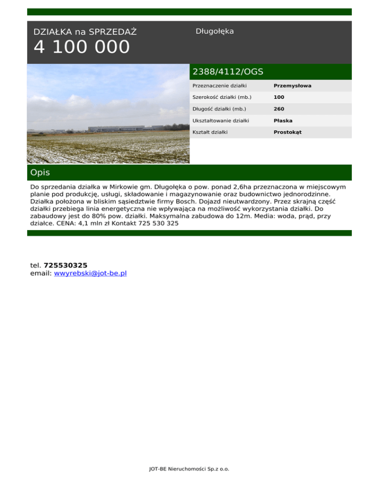 DZIAŁKA na SPRZEDAŻ Długołęka 4 100 000 2388/4112/OGS Przeznaczenie działki Przemysłowa Szerokość działki (mb.) 100 Długość działki (mb.) 260 Ukształtowanie działki Płaska Kształt działki Prostokąt Opis Do sprzedania działka w Mirkowie gm. Długołęka o pow. ponad 2,6ha przeznaczona w miejscowym planie pod produkcję, usługi, składowanie i magazynowanie oraz budownictwo jednorodzinne. Działka położona w bliskim sąsiedztwie firmy Bosch. Dojazd nieutwardzony. Przez skrajną część działki przebiega linia energetyczna nie wpływająca na możliwość wykorzystania działki. Do zabaudowy jest do 80% pow. działki. Maksymalna zabudowa do 12m. Media: woda, prąd, przy działce. CENA: 4,1 mln zł Kontakt 725 530 325 tel. 725530325 email: [email protected] JOT-BE Nieruchomości Sp.z o.o. Powered by TCPDF (www.tcpdf.org)