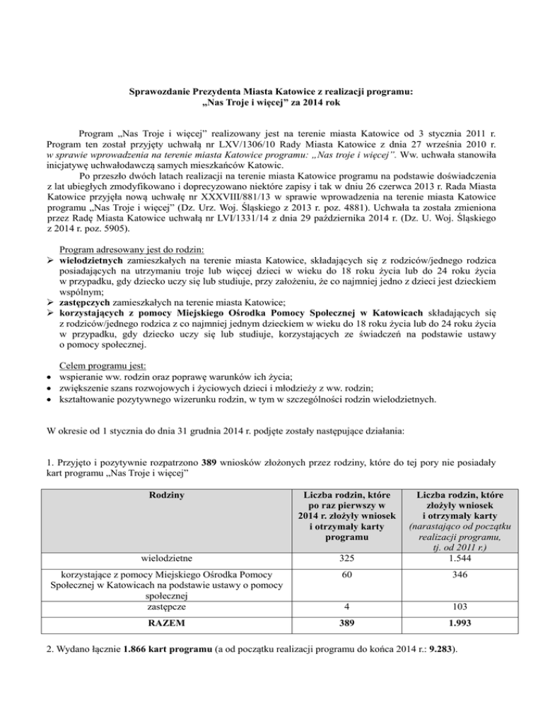 Sprawozdanie Prezydenta Miasta Katowice z realizacji programu: „Nas Troje i więcej” za 2014 rok Program „Nas Troje i więcej” realizowany jest na terenie miasta Katowice od 3 stycznia 2011 r. Program ten został przyjęty uchwałą nr LXV/1306/10 Rady Miasta Katowice z dnia 27 września 2010 r. w sprawie wprowadzenia na terenie miasta Katowice programu: „Nas troje i więcej”. Ww. uchwała stanowiła inicjatywę uchwałodawczą samych mieszkańców Katowic. Po przeszło dwóch latach realizacji na terenie miasta Katowice programu na podstawie doświadczenia z lat ubiegłych zmodyfikowano i doprecyzowano niektóre zapisy i tak w dniu 26 czerwca 2013 r. Rada Miasta Katowice przyjęła nową uchwałę nr XXXVIII/881/13 w sprawie wprowadzenia na terenie miasta Katowice programu „Nas Troje i więcej” (Dz. Urz. Woj. Śląskiego z 2013 r. poz. 4881). Uchwała ta została zmieniona przez Radę Miasta Katowice uchwałą nr LVI/1331/14 z dnia 29 października 2014 r. (Dz. U. Woj. Śląskiego z 2014 r. poz. 5905). Program adresowany jest do rodzin: wielodzietnych zamieszkałych na terenie miasta Katowice, składających się z rodziców/jednego rodzica posiadających na utrzymaniu troje lub więcej dzieci w wieku do 18 roku życia lub do 24 roku życia w przypadku, gdy dziecko uczy się lub studiuje, przy założeniu, że co najmniej jedno z dzieci jest dzieckiem wspólnym; zastępczych zamieszkałych na terenie miasta Katowice; korzystających z pomocy Miejskiego Ośrodka Pomocy Społecznej w Katowicach składających się z rodziców/jednego rodzica z co najmniej jednym dzieckiem w wieku do 18 roku życia lub do 24 roku życia w przypadku, gdy dziecko uczy się lub studiuje, korzystających ze świadczeń na podstawie ustawy o pomocy społecznej. Celem programu jest: wspieranie ww. rodzin oraz poprawę warunków ich życia; zwiększenie szans rozwojowych i życiowych dzieci i młodzieży z ww. rodzin; kształtowanie pozytywnego wizerunku rodzin, w tym w szczególności rodzin wielodzietnych. W okresie od 1 stycznia do dnia 31 grudnia 2014 r. podjęte zostały następujące działania: 1. Przyjęto i pozytywnie rozpatrzono 389 wniosków złożonych przez rodziny, które do tej pory nie posiadały kart programu „Nas Troje i więcej” Rodziny Liczba rodzin, które po raz pierwszy w 2014 r. złożyły wniosek i otrzymały karty programu wielodzietne 325 Liczba rodzin, które złożyły wniosek i otrzymały karty (narastająco od początku realizacji programu, tj. od 2011 r.) 1.544 korzystające z pomocy Miejskiego Ośrodka Pomocy Społecznej w Katowicach na podstawie ustawy o pomocy społecznej zastępcze 60 346 4 103 RAZEM 389 1.993 2. Wydano łącznie 1.866 kart programu (a od początku realizacji programu do końca 2014 r.: 9.283). 3. W programie udział brało 7 jednostek miejskich L.p. Nazwa Adres 1. Galeria Sztuki Współczesnej BWA Muzeum Historii Katowic Aleja Korfantego 6 Katowice ul. ks. J. Szafranka 9 Katowice ul. św. Jana 10 Katowice Aleja Korfantego 35 Katowice 2. 3. 4. 5. 6. 7. 8. 9. 10. 11. 12. 13. 14. Śląski Teatr Lalki i Aktora „Ateneum” Spodek (Miejski Ośrodek Sportu i Rekreacji) Lodowisko „Jantor” (Miejski Ośrodek Sportu i Rekreacji) Ośrodek Rekreacyjno – Wypoczynkowy „Zadole" (Miejski Ośrodek Sportu i Rekreacji) Ośrodek Rekreacyjno Wypoczynkowy „Rolna" (Miejski Ośrodek Sportu i Rekreacji) Ośrodek Rekreacyjno – Wypoczynkowy „Bugla" (Miejski Ośrodek Sportu i Rekreacji) Hala Sportowa „Józefowska” (Miejski Ośrodek Sportu i Rekreacji) Ośrodek Sportowy „Słowian" (Miejski Ośrodek Sportu i Rekreacji) Ośrodek Sportowy „Szopienice" (Miejski Ośrodek Sportu i Rekreacji) Ośrodek Sportowy "HETMAN" (Miejski Ośrodek Sportu i Rekreacji) Ośrodek Sportowy „Podlesianka" (Miejski Ośrodek Sportu i Rekreacji) Miejski Dom Kultury „Bogucice – Zawodzie” ul. Nałkowskiej 11 Katowice Oferowana zniżka 50% rabatu na zakup biletu wstępu 50% rabatu na zakup biletu wstępu na: lodowisko oraz siłownię zima: lodowiska „Jantor”, „Spodek”, ślizgawki na wolnym powietrzu lato: kąpieliska „Bugla”, „Rolna” 50% rabatu na zakup biletu wstępu na lodowisko ul. Wczasowa 8, Katowice 50% rabatu na zakup biletu wstępu na: siłownię i korty tenisowe ul. Nasypowa 65, Katowice 50% rabatu na zakup biletu wstępu na: kąpielisko i siłownię ul. Żeliwna 26 Katowice 50% rabatu na zakup biletu wstępu na kąpielisko ul. Józefowska 40, Katowice 50% rabatu na zakup biletu wstępu na siłownię ul. 1-go Maja 99, Katowice 50% rabatu na zakup biletu wstępu na: siłownię i korty tenisowe ul. 11-Listopada 20, Katowice 50% rabatu na zakup biletu wstępu na: siłownię i korty tenisowe ul. Siwka 6, Katowice 50% rabatu na zakup biletu wstępu na: siłownię i korty tenisowe ul. Sołtysia 25 Katowice 50% rabatu na zakup biletu wstępu na korty tenisowe ul. Markiefki 44a Katowice 50% rabatu na wycieczki i wyjścia w ramach akcji „Ferie i wakacje w Mieście” oraz spektakle teatralne, kabaretowe i muzyczne organizowane przez MDK „Bogucice – Zawodzie” 15. Centrum Kultury Katowice im. Krystyny Bochenek Miejski Dom Kultury „Ligota” 16. Pl. Sejmu Śląskiego 2 Katowice ul. Franciszkańska 33 Katowice 50% rabatu dla 20 pierwszych osób na zakup biletu wstępu na wszystkie imprezy biletowane, których Centrum Kultury będzie organizatorem 50% rabatu na wycieczki i wyjścia w ramach akcji „Ferie oraz wakacje w Mieście” oraz na zajęcia grupowe organizowane przez pracowników – instruktorów MDK „Ligota” 4. W programie udział brało 99 instytucji/prywatnych przedsiębiorców/klubów sportowych, w tym 16 pozyskanych w 2014 r., tj.: L.p. Nazwa Apteki: 1. ATID Sp. z o.o. Spółka komandytowa z siedzibą w Łodzi - Apteka Magiczna w Katowicach 2. Magiczna Sp. z o.o. Spółka komandytowa z siedzibą w Łodzi - Apteka Magiczna w Katowicach Biura podróży: 3. Biuro Podróży i Turystyki „Almatur – Katowice” Adres Oferowana zniżk
