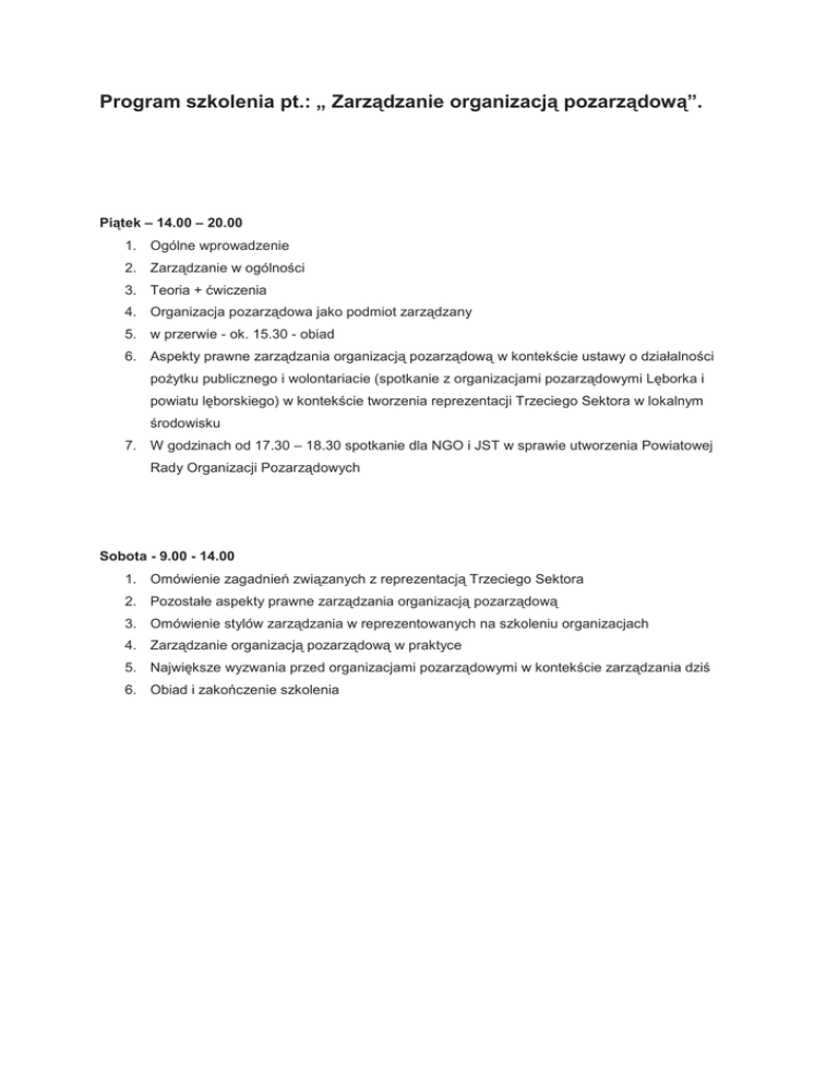 Program szkolenia pt.: „ Zarządzanie organizacją pozarządową”. Piątek – 14.00 – 20.00 1. Ogólne wprowadzenie 2. Zarządzanie w ogólności 3. Teoria + ćwiczenia 4. Organizacja pozarządowa jako podmiot zarządzany 5. w przerwie - ok. 15.30 - obiad 6. Aspekty prawne zarządzania organizacją pozarządową w kontekście ustawy o działalności pożytku publicznego i wolontariacie (spotkanie z organizacjami pozarządowymi Lęborka i powiatu lęborskiego) w kontekście tworzenia reprezentacji Trzeciego Sektora w lokalnym środowisku 7. W godzinach od 17.30 – 18.30 spotkanie dla NGO i JST w sprawie utworzenia Powiatowej Rady Organizacji Pozarządowych Sobota - 9.00 - 14.00 1. Omówienie zagadnień związanych z reprezentacją Trzeciego Sektora 2. Pozostałe aspekty prawne zarządzania organizacją pozarządową 3. Omówienie stylów zarządzania w reprezentowanych na szkoleniu organizacjach 4. Zarządzanie organizacją pozarządową w praktyce 5. Największe wyzwania przed organizacjami pozarządowymi w kontekście zarządzania dziś 6. Obiad i zakończenie szkolenia