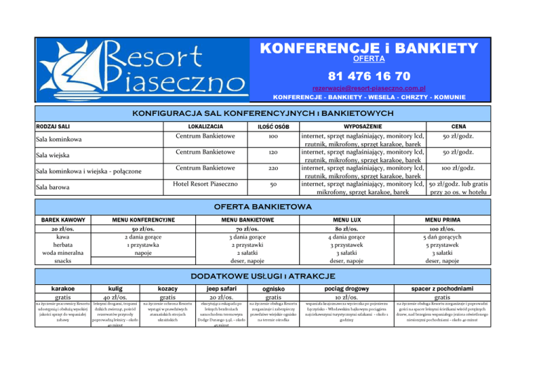 KONFERENCJE i BANKIETY OFERTA 81 476 16 70 [email protected] KONFERENCJE - BANKIETY - WESELA - CHRZTY - KOMUNIE KONFIGURACJA SAL KONFERENCYJNYCH i BANKIETOWYCH RODZAJ SALI LOKALIZACJA ILOŚĆ OSÓB Centrum Bankietowe 100 Centrum Bankietowe 120 Centrum Bankietowe 220 Hotel Resort Piaseczno 50 Sala kominkowa Sala wiejska Sala kominkowa i wiejska - połączone Sala barowa WYPOSAŻENIE CENA internet, sprzęt nagłaśniający, monitory lcd, 50 zł/godz. rzutnik, mikrofony, sprzęt karakoe, barek internet, sprzęt nagłaśniający, monitory lcd, 50 zł/godz. rzutnik, mikrofony, sprzęt karakoe, barek internet, sprzęt nagłaśniający, monitory lcd, 100 zł/godz. rzutnik, mikrofony, sprzęt karakoe, barek internet, sprzęt nagłaśniający, monitory lcd, 50 zł/godz. lub gratis mikrofony, sprzęt karakoe, barek przy 20 os. w hotelu OFERTA BANKIETOWA BAREK KAWOWY MENU KONFERENCYJNE MENU BANKIETOWE MENU LUX MENU PRIMA 20 zł/os. kawa herbata woda mineralna snacks 50 zł/os. 2 dania gorące 1 przystawka napoje 70 zł/os. 3 dania gorące 2 przystawki 2 sałatki deser, napoje 80 zł/os. 4 dania gorące 3 przystawek 3 sałatki deser, napoje 100 zł/os. 5 dań gorących 5 przystawek 3 sałatki deser, napoje DODATKOWE USŁUGI i ATRAKCJE karakoe gratis kulig 40 zł/os. na życzenie pracownicy Resortu leśnymi drogami, tropami udostępnią i obsłużą wysokiej dzikich zwierząt, pośród jakości sprzęt do wspaniałej rezerwatów przyrody zabawy poprowadzą leśnicy - około 40 minut kozacy gratis jeep safari 20 zł/os. ognisko gratis pociąg drogowy 10 zł/os. spacer z pochodniami gratis na życzenie ochrona Resortu wystąpi w prawdziwych atamańskich strojach ukraińskich ekscytująca eskapada po leśnych bezdrożach samochodem terenowym Dodge Durango 5.9L - około 45 minut na życzenie obsługa Resortu zorganizuje i zabezpieczy prawdziwe wiejskie ognisko na terenie ośrodka wspaniała krajoznawcza wycieczka po pojezierzu Łęczyńsko - Włodawskim bajkowym pociągiem najciekawszymi turystycznymi szlakami - około 1 godziny na życzenie obsługa Resortu zorganizuje i poprowadzi gości na spacer leśnymi ścieżkami wśród potężnych drzew, nad brzegiem wspaniałego jeziora oświetlonego niesionymi pochodniami - około 40 minut