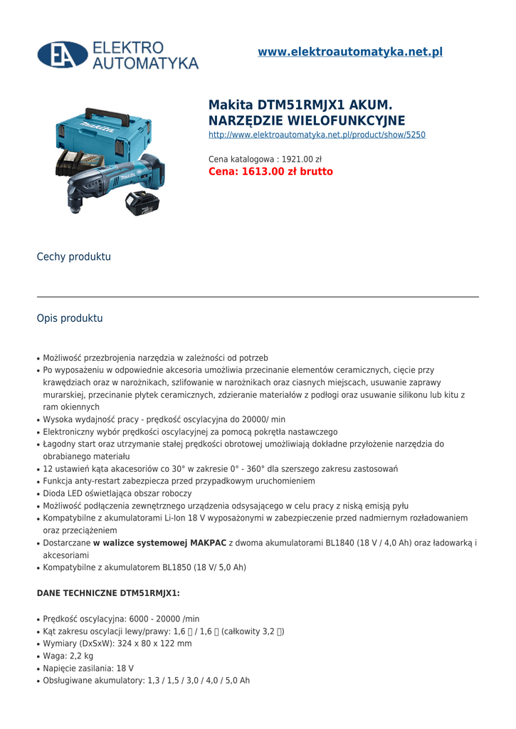 www.elektroautomatyka.net.pl Makita DTM51RMJX1 AKUM. NARZĘDZIE WIELOFUNKCYJNE http://www.elektroautomatyka.net.pl/product/show/5250 Cena katalogowa : 1921.00 zł Cena: 1613.00 zł brutto Cechy produktu Opis produktu ● ● ● ● ● ● ● ● ● ● ● ● Możliwość przezbrojenia narzędzia w zależności od potrzeb Po wyposażeniu w odpowiednie akcesoria umożliwia przecinanie elementów ceramicznych, cięcie przy krawędziach oraz w narożnikach, szlifowanie w narożnikach oraz ciasnych miejscach, usuwanie zaprawy murarskiej, przecinanie płytek ceramicznych, zdzieranie materiałów z podłogi oraz usuwanie silikonu lub kitu z ram okiennych Wysoka wydajność pracy - prędkość oscylacyjna do 20000/ min Elektroniczny wybór prędkości oscylacyjnej za pomocą pokrętła nastawczego Łagodny start oraz utrzymanie stałej prędkości obrotowej umożliwiają dokładne przyłożenie narzędzia do obrabianego materiału 12 ustawień kąta akacesoriów co 30° w zakresie 0° - 360° dla szerszego zakresu zastosowań Funkcja anty-restart zabezpiecza przed przypadkowym uruchomieniem Dioda LED oświetlająca obszar roboczy Możliwość podłączenia zewnętrznego urządzenia odsysającego w celu pracy z niską emisją pyłu Kompatybilne z akumulatorami Li-Ion 18 V wyposażonymi w zabezpieczenie przed nadmiernym rozładowaniem oraz przeciążeniem Dostarczane w walizce systemowej MAKPAC z dwoma akumulatorami BL1840 (18 V / 4,0 Ah) oraz ładowarką i akcesoriami Kompatybilne z akumulatorem BL1850 (18 V/ 5,0 Ah) DANE TECHNICZNE DTM51RMJX1: ● ● ● ● ● ● Prędkość oscylacyjna: 6000 - 20000 /min Kąt zakresu oscylacji lewy/prawy: 1,6 ゚ / 1,6 ゚ (całkowity 3,2 ゚) Wymiary (DxSxW): 324 x 80 x 122 mm Waga: 2,2 kg Napięcie zasilania: 18 V Obsługiwane akumulatory: 1,3 / 1,5 / 3,0 / 4,0 / 5,0 Ah DOSTARCZONE WYPOSAŻENIE: ● ● ● ● ● ● ● ● ● ● Walizka systemowa MAKPACK typ 1 Wkład do walizki MAKPAC 2 akumulatory BL1840 Ładowarka DC18RC Klucz imbusowy 5 Piła segmentowa BiM do drewna i metalu 85mm Piła do cięcia wgłębnego BiM do drewna i metalu 28mm Podkładka papieru ściernego DELTA Adapter urządzenia odsysającego Adapter uniwersalny ELEKTRO-AUTOMATYKA Sprzedaż elektronarzędzi, urządzeń spawalniczych, maszyn budowlanych, pneumatyki, narzędzi warsztatowych, firmowych ubrań roboczych oraz maszyn ogrodowo leśnych. Sklep Bochnia ul. Brzeska 50 32-700 Bochnia Sklep Brzesko ul. Szarych Szeregów 23 32-800 Brzesko Serwis, Magazyn ul. Św. Brata Alberta 4 32-800 Brzesko tel. 691 572 333 e-mail: [email protected] tel. 609 523 230 e-mail: [email protected] tel. 609 523 645 e-mail: [email protected]