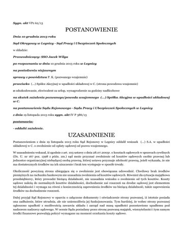 Sygn. akt VPz 62/13 POSTANOWIENIE Dnia 10 grudnia 2013 roku Sąd Okręgowy w Legnicy - Sąd Pracy i Ubezpieczeń Społecznych w składzie: Przewodniczący: SSO Jacek Wilga po rozpoznaniu w dniu 10 grudnia 2013 roku w Legnicy na posiedzeniu niejawnym sprawy z powództwa P. K. (pozwanego wzajemnie) przeciwko (...) Spółce Akcyjnej w upadłości układowej w C. (strona powodowa wzajemnie) o odszkodowanie, ekwiwalent za urlop, wynagrodzenie za godziny nadliczbowe na skutek zażalenia pozwanego/powoda wzajemnego (...) Spółka Akcyjna w upadłości układowej w C. na postanowienie Sądu Rejonowego - Sądu Pracy i Ubezpieczeń Społecznych w Legnicy z dnia 19 listopada 2013 roku sygn. akt IV P 386/13 postanawia: - oddalić zażalenie. UZASADNIENIE Postanowieniem z dnia 19 listopada 2013 roku Sąd Rejonowy w Legnicy oddalił wniosek (...) S.A. w upadłości układowej w C. o zwolnienie od opłaty sądowej od pozwu wzajemnego. W uzasadnieniu wskazał, iż zgodnie z art. 103 ustawy z dnia 28.07.2005r. o kosztach sądowych w sprawach cywilnych (Dz. U. nr 167 poz. 1398 z późn. zm.) sąd może przyznać zwolnienie od kosztów sądowych osobie prawnej lub jednostce organizacyjnej niebędącej osobą prawną, której ustawa przyznaje zdolność prawną, jeżeli wykazała, że nie ma dostatecznych środków na ich uiszczenie i brak ten występuje w sposób trwały. Okoliczność powyższą strona ubiegająca się o zwolnienie jest obowiązana udowodnić. Chwilowy brak środków pieniężnych na rachunku bankowym nie uzasadnia zwolnienia od kosztów sądowych. Również zła sytuacja majątkowa przedsiębiorcy, który prowadzi bieżącą działalność, nie uzasadnia wniosku o zwolnienie od tych kosztów. Koszty sądowe należą do normalnych kosztów działalności, dochodzenie zaś roszczeń na drodze sądowej jest elementem tej działalności i wymaga na równi z koniecznością zapewnienia środków na bieżącą działalność, także zapewnienia środków na dochodzenie roszczeń. Dalej przyjął Sąd Rejonowy w oparciu o załączone dokumenty i oświadczenie strony pozwanej, iż istotnie posiada ona zadłużenie, które utrudnia, ale nie uniemożliwia jej funkcjonowania. Tym bardziej, że wobec strony pozwanej ogłoszono upadłość z możliwością zawarcia układu i zarząd nad masą upadłości pozostawiono upadłemu pod nadzorem nadzorcy sądowego. W ocenie Sądu posiadany przez stronę pozwaną majątek, wierzytelności i tym samym środki finansowe pozwalają pokryć wymagane na moment orzekania koszty sądowe. Postanowienie powyższe zaskarżyła zażaleniem strona pozwana wnosząc o jego zmianę poprzez zwolnienie jej od kosztów sądowych. Zarzuciła naruszenie art. 103 ustawy o kosztach sądowych w sprawach cywilnych. Twierdziła, iż ogłoszenie upadłości strony pozwanej będące następstwem stwierdzenia niewypłacalności pozwu spółki winno być uznane za dostateczny argument przemawiający za stwierdzeniem, iż pozwana spółka nie jest w stanie w chwili obecnej ponieść kosztów sądowych. Świadczy bowiem o tym, iż utraciła ona zdolność finansowania swojej działalności, w tym także ponoszenia kosztów sądowych stanowiących wg Sądu I instancji integralną jej część. Pozostawienie upadłej zarządu nad masą upadłości wiąże się z koniecznością ciągłej kontroli ponoszonych wydatków a zarząd jest zobowiązany dokładać wszelkich starań, aby regulować koszty bieżącej działalności i nie powiększać istniejących zobowiązań. W dalszej kolejności podnosiła strona pozwana i przedłożyła dokumenty potwierdzające jej złą kondycję finansową, z których wynika, że znajduje się w ciężkiej sytuacji finansowej i nie posiada środków na pokrycie kosztów sądowych w sprawie. Sąd Okręgowy zważył: Zażalenie nie jest zasadne. Sąd Okręgowy podziela w pełni dokonaną przez Sąd I instancji ocenę charakteru kosztów sądowych jako kosztów związanych z prowadzoną działalnością gospodarczą. Trafne jest również stanowisko tego sądu co do konieczności udowodnienia przez stroną ubiegającą się o zwolnienie faktu nieposiadania środków na ich uiszczenie. Nadto również trafnie orzekł Sąd Rejonowy, iż strona pozwana w takiej sytuacji się nie znajduje. We wniesionym zażaleniu strona pozwana nie zawarła argumentów pozwalających na odmienną ocenę. Sam fakt ogłoszenia upadłości układowej strony nie przesądza o braku środków na uiszczenie kosztów sądowych. Wskazuje jedynie na brak dostatecznych środków na pokrycie występujących zobowiązań finansowych. Nie może więc być utożsamiany z brakiem jakichkolwiek środków. W treści zażalenia wskazano, iż zarząd strony pozwanej podejmuje starania, aby regulować koszty bieżącej działalności i nie powiększać istniejących zobowiązań. Wynika z tego, iż niektóre należności reguluje. W postanowieniu z dnia 2005.02.18, VCz 8/05 Sąd Najwyższy uznał, a pogląd ten Sąd II instancji w pełni aprobuje, iż koszty dochodzenia przed sądem roszczeń związanych z prowadzeniem działalności gospodarczej stanowią dla strony ją prowadzącej koszty tej działalności, które musi ona uwzględniać w racjonalnym planowaniu wydatków. Nie ma przy tym uzasadnionych podstaw, by co do zasady uznać preferencję dla innych wydatków, w tym związanych z pokryciem bieżących kosztów jej funkcjonowania jako przedsiębiorstwa w stosunku do należnych od niej kosztów sądowych. Regulowanie przez stronę pozwaną innych należności oznacza w takim przypadku, iż strona pozwana dysponuje również środkami na pokrycie kosztów procesu związanych z wniesionym przez nią pozwem wzajemnym. Jeżeli zaś tych środków brakuje na pokrycie wszystkich należności winna oceniać, które z nich mają dla niej priorytetowe znaczenie. W takiej sytuacji jednak nie zachodzą podstawy do zwolnienia jej od ponoszenia kosztów sądowych przewidziane w art. 103 ustawy o kosztach s
