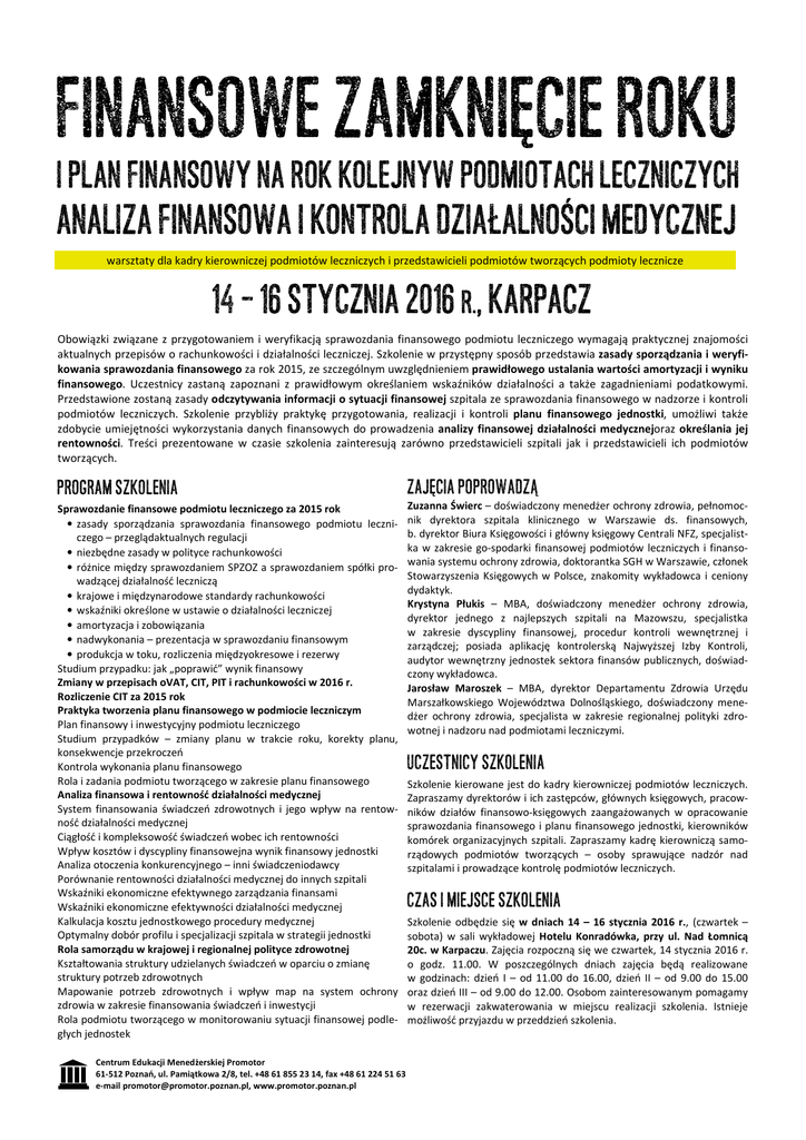 FINANSOWE ZAMKNIĘCIE ROKU I PLAN FINANSOWY NA ROK KOLEJNYW PODMIOTACH LECZNICZYCH ANALIZA FINANSOWA I KONTROLA DZIAŁALNOŚCI MEDYCZNEJ warsztaty dla kadry kierowniczej podmiotów leczniczych i przedstawicieli podmiotów tworzących podmioty lecznicze 14 – 16 STYCZNIA 2016 r., KARPACZ Obowiązki związane z przygotowaniem i weryfikacją sprawozdania finansowego podmiotu leczniczego wymagają praktycznej znajomości aktualnych przepisów o rachunkowości i działalności leczniczej. Szkolenie w przystępny sposób przedstawia zasady sporządzania i weryfikowania sprawozdania finansowego za rok 2015, ze szczególnym uwzględnieniem prawidłowego ustalania wartości amortyzacji i wyniku finansowego. Uczestnicy zastaną zapoznani z prawidłowym określaniem wskaźników działalności a także zagadnieniami podatkowymi. Przedstawione zostaną zasady odczytywania informacji o sytuacji finansowej szpitala ze sprawozdania finansowego w nadzorze i kontroli podmiotów leczniczych. Szkolenie przybliży praktykę przygotowania, realizacji i kontroli planu finansowego jednostki, umożliwi także zdobycie umiejętności wykorzystania danych finansowych do prowadzenia analizy finansowej działalności medycznejoraz określania jej rentowności. Treści prezentowane w czasie szkolenia zainteresują zarówno przedstawicieli szpitali jak i przedstawicieli ich podmiotów tworzących. PROGRAM SZKOLENIA ZAJĘCIA POPROWADZĄ Sprawozdanie finansowe podmiotu leczniczego za 2015 rok • zasady sporządzania sprawozdania finansowego podmiotu leczniczego – przeglądaktualnych regulacji • niezbędne zasady w polityce rachunkowości • różnice między sprawozdaniem SPZOZ a sprawozdaniem spółki prowadzącej działalność leczniczą • krajowe i międzynarodowe standardy rachunkowości • wskaźniki określone w ustawie o działalności leczniczej • amortyzacja i zobowiązania • nadwykonania – prezentacja w sprawozdaniu finansowym • produkcja w toku, rozliczenia międzyokresowe i rezerwy Studium przypadku: jak „poprawić” wynik finansowy Zmiany w przepisach oVAT, CIT, PIT i rachunkowości w 2016 r. Rozliczenie CIT za 2015 rok Praktyka tworzenia planu finansowego w podmiocie leczniczym Plan finansowy i inwestycyjny podmiotu leczniczego Studium przypadków – zmiany planu w trakcie roku, korekty planu, konsekwencje przekroczeń Kontrola wykonania planu finansowego Rola i zadania podmiotu tworzącego w zakresie planu finansowego Analiza finansowa i rentowność działalności medycznej System finansowania świadczeń zdrowotnych i jego wpływ na rentowność działalności medycznej Ciągłość i kompleksowość świadczeń wobec ich rentowności Wpływ kosztów i dyscypliny finansowejna wynik finansowy jednostki Analiza otoczenia konkurencyjnego – inni świadczeniodawcy Porównanie rentowności działalności medycznej do innych szpitali Wskaźniki ekonomiczne efektywnego zarządzania finansami Wskaźniki ekonomiczne efektywności działalności medycznej Kalkulacja kosztu jednostkowego procedury medycznej Optymalny dobór profilu i specjalizacji szpitala w strategii jednostki Rola samorządu w krajowej i regionalnej polityce zdrowotnej Kształtowania struktury udzielanych świadczeń w oparciu o zmianę struktury potrzeb zdrowotnych Mapowanie potrzeb zdrowotnych i wpływ map na system ochrony zdrowia w zakresie finansowania świadczeń i inwestycji Rola podmiotu tworzącego w monitorowaniu sytuacji finansowej podległych jednostek Zuzanna Świerc – doświadczony menedżer ochrony zdrowia, pełnomocnik dyrektora szpitala klinicznego w Warszawie ds. finansowych, b. dyrektor Biura Księgowości i główny księgowy Centrali NFZ, specjalistka w zakresie go-spodarki finansowej podmiotów leczniczych i finansowania systemu ochrony zdrowia, doktorantka SGH w Warszawie, członek Stowarzyszenia Księgowych w Polsce, znakomity wykładowca i ceniony dydaktyk. Krystyna Płukis – MBA, doświadczony menedżer ochrony zdrowia, dyrektor jednego z najlepszych szpitali na Mazowszu, specjalistka w zakresie dyscypliny finansowej, procedur kontroli wewnętrznej i zarządczej; posiada aplikację kontrolerską Najwyższej Izby Kontroli, audytor wewnętrzny jednostek sektora finansów publicznych, doświadczony wykładowca. Jarosław Maroszek – MBA, dyrektor Departamentu Zdrowia Urzędu Marszałkowskiego Województwa Dolnośląskiego, doświadczony menedżer ochrony zdrowia, specjalista w zakresie regionalnej polityki zdrowotnej i nadzoru nad podmiotami leczniczymi. Centrum Edukacji Menedżerskiej Promotor 61-512 Poznań, ul. Pamiątkowa 2/8, tel. +48 61 855 23 14, fax +48 61 224 51 63 e-mail [email protected], www.promotor.poznan.pl UCZESTNICY SZKOLENIA Szkolenie kierowane jest do kadry kierowniczej podmiotów leczniczych. Zapraszamy dyrektorów i ich zastępców, głównych księgowych, pracowników działów finansowo-księgowych zaangażowanych w opracowanie sprawozdania finansowego i planu finansowego jednostki, kierowników komórek organizacyjnych szpitali. Zapraszamy kadrę kierowniczą samorządowych podmiotów tworzących – osoby sprawujące nadzór nad szpitalami i prowadzące kontrolę podmiotów leczniczych. CZAS I MIEJSCE SZKOLENIA Szkolenie odbędzie się w dniach 14 – 16 stycznia 2016 r., (czwartek – sobota) w sali wykładowej Hotelu Konradówka, przy ul. Nad Łomnicą 20c. w Karpaczu. Zajęcia rozpoczną się we czwartek, 14 stycznia 2016 r. o godz. 11.00. W poszczególnych dniach zajęcia będą realizowane w godzinach: dzień I – od 11.00 do 16.00, dzień II – od 9.00 do 15.00 oraz dzień III – od 9.00 do 12.00. Osobom zainteresowanym pomagamy w rezerwacji zakwaterowania w miejscu realizacji szkolenia. Istnieje możliwość przyjazdu w przeddzień szkolenia. FINANSOWE ZAMKNIĘCIE ROKU I PLAN FINANSOWY na rok kolejny 14 – 16 stycznia 2016 r., karpacz warsztaty dla kadry kierowniczej podmiotów leczniczych WARUNKI UCZESTNICTWA Cena uczestnictwa jednej osoby w szkoleniu wynos