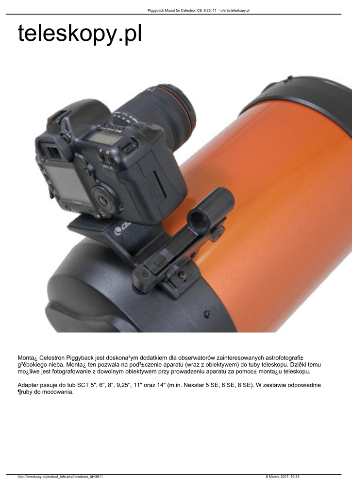 Piggyback Mount for Celestron C8, 9,25, 11 - oferta teleskopy.pl teleskopy.pl Monta¿ Celestron Piggyback jest doskona³ym dodatkiem dla obserwatorów zainteresowanych astrofotografi± g³êbokiego nieba. Monta¿ ten pozwala na pod³±czenie aparatu (wraz z obiektywem) do tuby teleskopu. Dziêki temu mo¿liwe jest fotografowanie z dowolnym obiektywem przy prowadzeniu aparatu za pomoc± monta¿u teleskopu. Adapter pasuje do tub SCT 5", 6", 8", 9,25", 11" oraz 14" (m.in. Nexstar 5 SE, 6 SE, 8 SE). W zestawie odpowiednie ¶ruby do mocowania. http://teleskopy.pl/product_info.php?products_id=3611 8 March, 2017, 16:33 Piggyback Mount for Celestron C8, 9,25, 11 - oferta teleskopy.pl http://teleskopy.pl/product_info.php?products_id=3611 8 March, 2017, 16:33