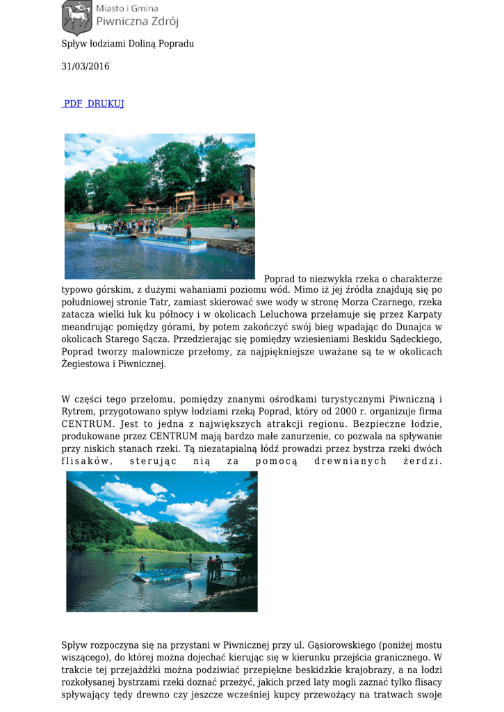 Spływ łodziami Doliną Popradu 31/03/2016 PDF DRUKUJ Poprad to niezwykła rzeka o charakterze typowo górskim, z dużymi wahaniami poziomu wód. Mimo iż jej źródła znajdują się po południowej stronie Tatr, zamiast skierować swe wody w stronę Morza Czarnego, rzeka zatacza wielki łuk ku północy i w okolicach Leluchowa przełamuje się przez Karpaty meandrując pomiędzy górami, by potem zakończyć swój bieg wpadając do Dunajca w okolicach Starego Sącza. Przedzierając się pomiędzy wziesieniami Beskidu Sądeckiego, Poprad tworzy malownicze przełomy, za najpiękniejsze uważane są te w okolicach Żegiestowa i Piwnicznej. W części tego przełomu, pomiędzy znanymi ośrodkami turystycznymi Piwniczną i Rytrem, przygotowano spływ łodziami rzeką Poprad, który od 2000 r. organizuje firma CENTRUM. Jest to jedna z największych atrakcji regionu. Bezpieczne łodzie, produkowane przez CENTRUM mają bardzo małe zanurzenie, co pozwala na spływanie przy niskich stanach rzeki. Tą niezatapialną łódź prowadzi przez bystrza rzeki dwóch flisaków, sterując nią za pomocą drewnianych żerdzi. Spływ rozpoczyna się na przystani w Piwnicznej przy ul. Gąsiorowskiego (poniżej mostu wiszącego), do której można dojechać kierując się w kierunku przejścia granicznego. W trakcie tej przejażdżki można podziwiać przepiękne beskidzkie krajobrazy, a na łodzi rozkołysanej bystrzami rzeki doznać przeżyć, jakich przed laty mogli zaznać tylko flisacy spływający tędy drewno czy jeszcze wcześniej kupcy przewożący na tratwach swoje towary z Węgier. Po około 10 km łodzie dobijają do przystani w Rytrze, zlokalizowanej koło pola kempingowego nieopodal ruin zamku. Jeżeli planujecie Państwo wycieczki po pięknej Ziemi Sądeckiej, zapraszamy do skorzystania z Spływu Łodziami Doliną Popradu z Piwnicznej do Rytra. Gwarantujemy wspaniałe widoki i niezapomniane wrażenia w czasie dwugodzinnej podróży łodzią, spełniającą najnowsze normy bezpieczeństwa, pośród przyrody obfitującej w wyjątkowe okazy flory i fauny charakterystyczne dla terenów Beskidu Sądeckiego. Dla grup zorganizowanych proponujemy rabaty cenowe oraz oferujemy dodatkowe atrakcje: ogniska, przejazdy bryczkami na Suchą Dolinę, zwiedzanie ruin zamku w Rytrze, spotkania okolicznościowe, noclegi itp. Informacje o trasie spływu: Długość trasy spływu od miejscowości Piwniczna do miejscowości Rytro -10 km. Czas przepływu 1,5-2,5 godziny, w zależności od stanu wody na rzece. Przewidywany czas trwania sezonu od 01 kwietnia do 31 października, może on ulec zmianie ze względu na warunki atmosferyczne (czas zalegania pokrywy śnieżnej - temperatura, intensywność odpadów - wysokość stanu wody na rzece) Informacja i rezerwacje: tel. 018 / 446-84-49 fax 018 / 442-05-63 kom. 0605 74-25-51 [email protected] [email protected] Rodzaj biletu normalny ulgowy (dzieci do lat 10) Cena 45 zł 30 zł grupy zorganizowane (powyżej 48 osób) rabaty cenowe Organizujemy imprezy, spotkania okolicznościowe. (ogniska, przejazdy bryczkami, noclegi, itp.) Przystań początkowa: Piwniczna, ul. Gąsiorowskiego, Przystań końcowa: Rytro stadion sportowy / pole kempingowe Długość trasy spływu: 10 km Parametry łodzi: - długość: 6,60 m, - szerokość: 2,40 m, - wysokość: 0,50 m, - ilość przewożonych osób: 12 + 2 osoby obsługi łodzi OPIS ŁODZI POPRADZKICH Łodzie popradzkie wykonane są wg najnowszych technologii, z kompozytów poliestrowoszklanych zbrojonych włóknem szklanym, diolenem i kevlarem. Spełniają one najnowsze normy bezpieczeństwa (dopuszczone do eksploatacji przez Inspektorat Żeglugi Śródlądowej w Krakowie). Posiadają komory wypornościowe, dzięki czemu są całkowicie niezatapialne. Podwójne dno stanowi zabezpieczenie przed uszkodzeniami, które eliminowałyby łódź z dalszej eksploatacji. Nowoczesna konstrukcja zapewnia bardzo małe zanurzenie - przy obciążeniu maksymalnym (14 osób) wynosi mniej niż 12 cm Na podstawie materiałów ze stron internetowych firmy Centrum