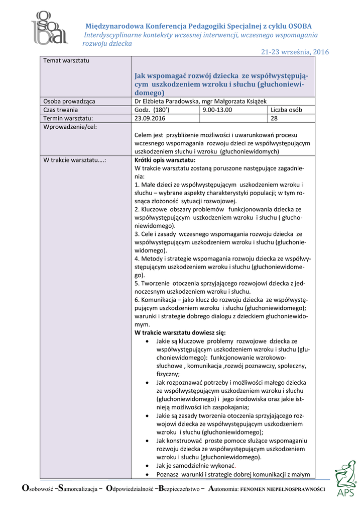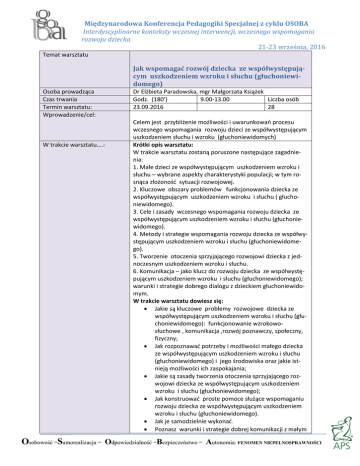 Międzynarodowa Konferencja Pedagogiki Specjalnej z cyklu OSOBA Interdyscyplinarne konteksty wczesnej interwencji, wczesnego wspomagania rozwoju dziecka 21-23 września, 2016 Temat warsztatu Jak wspomagać rozwój dziecka ze współwystępującym uszkodzeniem wzroku i słuchu (głuchoniewidomego) Osoba prowadząca Czas trwania Termin warsztatu: Wprowadzenie/cel: W trakcie warsztatu….: Dr Elżbieta Paradowska, mgr Małgorzata Książek Godz. (180’) 9.00-13.00 Liczba osób 23.09.2016 28 Celem jest przybliżenie możliwości i uwarunkowań procesu wczesnego wspomagania rozwoju dzieci ze współwystępującym uszkodzeniem słuchu i wzroku (głuchoniewidomych) Krótki opis warsztatu: W trakcie warsztatu zostaną poruszone następujące zagadnienia: 1. Małe dzieci ze współwystępującym uszkodzeniem wzroku i słuchu – wybrane aspekty charakterystyki populacji; w tym rosnąca złożoność sytuacji rozwojowej. 2. Kluczowe obszary problemów funkcjonowania dziecka ze współwystępującym uszkodzeniem wzroku i słuchu ( głuchoniewidomego). 3. Cele i zasady wczesnego wspomagania rozwoju dziecka ze współwystępującym uszkodzeniem wzroku i słuchu (głuchoniewidomego). 4. Metody i strategie wspomagania rozwoju dziecka ze współwystępującym uszkodzeniem wzroku i słuchu (głuchoniewidomego). 5. Tworzenie otoczenia sprzyjającego rozwojowi dziecka z jednoczesnym uszkodzeniem wzroku i słuchu. 6. Komunikacja – jako klucz do rozwoju dziecka ze współwystępującym uszkodzeniem wzroku i słuchu (głuchoniewidomego); warunki i strategie dobrego dialogu z dzieckiem głuchoniewidomym. W trakcie warsztatu dowiesz się: Jakie są kluczowe problemy rozwojowe dziecka ze współwystępującym uszkodzeniem wzroku i słuchu (głuchoniewidomego): funkcjonowanie wzrokowosłuchowe , komunikacja ,rozwój poznawczy, społeczny, fizyczny; Jak rozpoznawać potrzeby i możliwości małego dziecka ze współwystępującym uszkodzeniem wzroku i słuchu (głuchoniewidomego) i jego środowiska oraz jakie istnieją możliwości ich zaspokajania; Jakie są zasady tworzenia otoczenia sprzyjającego rozwojowi dziecka ze współwystępującym uszkodzeniem wzroku i słuchu (głuchoniewidomego); Jak konstruować proste pomoce służące wspomaganiu rozwoju dziecka ze współwystępującym uszkodzeniem wzroku i słuchu (głuchoniewidomego). Jak je samodzielnie wykonać. Poznasz warunki i strategie dobrej komunikacji z małym Osobowość –Samorealizacja – Odpowiedzialność –Bezpieczeństwo – Autonomia: FENOMEN NIEPEŁNOSPRAWNOŚCI Międzynarodowa Konferencja Pedagogiki Specjalnej z cyklu OSOBA Interdyscyplinarne konteksty wczesnej interwencji, wczesnego wspomagania rozwoju dziecka 21-23 września, 2016 dzieckiem ze współwystępującym uszkodzeniem wzroku i słuchu. Poznasz cechy dobrego partnera komunikacji z dzieckiem , z uszkodzeniem wzroku i słuchu na wczesnych etapach rozwoju komunikacji. W trakcie analiz video będziesz mógł zweryfikować znaczenie poznanych zasad dobrego dialogu z dzieckiem z uszkodzeniem wzroku i słuchu. Otrzymasz proste narzędzie służące ocenie jakości komunikacji z dzieckiem - do wykorzystania w analizach video i we własnej praktyce. Opanujesz umiejętności: Organizowania środowiska sprzyjającego rozwojowi małego dziecka z uszkodzeniem wzroku i słuchu; Tworzenia prostych pomocy służących wspomaganiu rozwoju dziecka z uszkodzeniem wzroku i słuchu; Posługiwania się strategiami wspomagania i podtrzymywania interakcji z dzieckiem z tym rodzajem niepełnosprawności (głuchoniewidomym); Posługiwania się prostym narzędziem do analizy materiału video/ analizy przebiegu interakcji z dzieckiem, z uszkodzeniem wzroku i słuchu, na wczesnych etapach rozwoju komunikacji. Oceny jakości interakcji komunikacyjnej z dzieckiem, z uszkodzeniem wzroku i słuchu. Monitorować jakość własnych interakcji komunikacyjnych z dzieckiem. Wskazane umiejętności będziesz mógł wykorzystać również w pracy z dziećmi, z uszkodzeniem wzroku i innymi, dodatkowymi zaburzeniami. Dr Elżbieta Paradowska jest pracownikiem APS w Katedrze Podstaw Pedagogiki Specjalnej. Ukończyła w roku 1987 WSPS – specjalność: rewalidacja niewidomych i niedowidzących. Początkowo pracowała w ZG PZN w Dziale Małego Dziecka i Współpracy z Rodziną, gdzie współorganizowała ogólnopolskie turnusy dla małych dzieci niewidomych z rodzicami (w których uczestniczyły też dzieci głuchoniewidome); prowadziła na nich zajęcia ogólnorozwojowe. Dodatkowo kierowała Punktem Konsultacyjnym dla Rodziców. W roku 1997 ukończyła podyplomowe studium Wczesnej rehabilitacji dzieci słabowidzących i niewidomych. Przez pewien czas pracowała jako specjalista wczesnej interwencji z dziećmi z uszkodzonym wzrokiem(najczęściej z dodatkowymi zaburzeniami) i z ich rodzicami w środowisku domowym. Interesuje się problematyką dotyczącą rodziny dziecka głuchoniewidomego. Napisała pracę doktorską nt. Funkcjonowanie psychospołeczne matek dzieci głuchoniewidomych. Jest członkiem Towarzystwa Pomocy Głuchoniewidomym (TPG), z którym współpracuje. Osobowość –Samorealizacja – Odpowiedzialność –Bezpieczeństwo – Autonomia: FENOMEN NIEPEŁNOSPRAWNOŚCI Międzynarodowa Konferencja Pedagogiki Specjalnej z cyklu OSOBA Interdyscyplinarne konteksty wczesnej interwencji, wczesnego wspomagania rozwoju dziecka 21-23 września, 2016 Małgorzata Książek e-mail: [email protected] Tyflopedagog i surdopedagog. Ukończyła Wyższą Szkołę Pedagogiki Specjalnej w Warszawie. Pracuje w Towarzystwie Pomocy Głuchoniewidomym. Od niemal 30 lat pracuje na rzecz i z osobami głuchoniewidomymi (OGN) – dorosłymi i dziećmi; w tym również małymi. Organizuje i realizuję wsparcie dla rodziców dzieci głuchoniewidomych i szkolenia dla pracujących z nimi specjalistów. Od ok. 20 lat współpracuje z Akademią Pedagogiki Specjalnej, prowadząc zajęcia dydaktyczne z zakresu wspomagania rozwoju dzieci głu