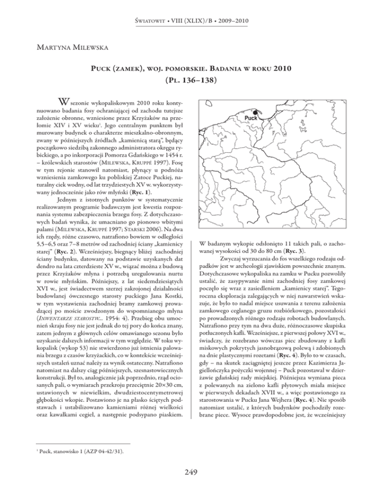śWIAToWIT • VIII (XLIX)/B • 2009–2010 MARTyNA MILEWSKA PuCK ( ZAMEK), WoJ. PoMoRSKiE. BADANiA W RoKu 2010 (PL. 136–138) W sezonie wykopaliskowym 2010 roku kontynuowano badania fosy ochraniającej od zachodu tutejsze założenie obronne, wzniesione przez Krzyżaków na przełomie XIV i XV wieku1. Jego centralnym punktem był murowany budynek o charakterze mieszkalno-obronnym, zwany w późniejszych źródłach „kamienicą starą”, będący początkowo siedzibą zakonnego administratora okręgu rybickiego, a po inkorporacji Pomorza Gdańskiego w 1454 r. – królewskich starostów (MILEWSKA, KRUPPé 1997). Fosę w tym rejonie stanowił natomiast, płynący u podnóża wzniesienia zamkowego ku pobliskiej Zatoce Puckiej, naturalny ciek wodny, od lat trzydziestych XV w. wykorzystywany jednocześnie jako rów młyński (Ryc. 1). Jednym z istotnych punktów w systematycznie realizowanym programie badawczym jest kwestia rozpoznania systemu zabezpieczenia brzegu fosy. Z dotychczasowych badań wynika, że umacniano go pionowo wbitymi palami (MILEWSKA, KRUPPé 1997; STARSKI 2006). Na dwa ich rzędy, różne czasowo, natrafiono bowiem w odległości 5,5–6,5 oraz 7–8 metrów od zachodniej ściany „kamienicy starej” (Ryc. 2). Wcześniejszy, biegnący bliżej zachodniej ściany budynku, datowany na podstawie uzyskanych dat dendro na lata czterdzieste XV w., wiązać można z budową przez Krzyżaków młyna i potrzebą uregulowania nurtu w rowie młyńskim. Późniejszy, z lat siedemdziesiątych XVI w., jest świadectwem szerzej zakrojonej działalności budowlanej ówczesnego starosty puckiego Jana Kostki, w tym wystawienia zachodniej bramy zamkowej prowadzącej po moście zwodzonym do wspomnianego młyna (inwentarze starostw... 1954: 4). Przebieg obu umocnień skraju fosy nie jest jednak do tej pory do końca znany, zatem jednym z głównych celów omawianego sezonu było uzyskanie dalszych informacji w tym względzie. W toku wykopalisk (wykop 53) nie stwierdzono już istnienia palowania brzegu z czasów krzyżackich, co w kontekście wcześniejszych ustaleń uznać należy za wynik ostateczny. Natrafiono natomiast na dalszy ciąg późniejszych, szesnastowiecznych konstrukcji. Był to, analogicznie jak poprzednio, rząd ociosanych pali, o wymiarach przekroju przeciętnie 20×30 cm, ustawionych w niewielkim, dwudziestocentymetrowej głębokości wkopie. Postawiono je na płasko ściętych podstawach i ustabilizowano kamieniami różnej wielkości oraz kawałkami cegieł, a następnie podsypano piaskiem. 1 W badanym wykopie odsłonięto 11 takich pali, o zachowanej wysokości od 30 do 80 cm (Ryc. 3). Zwyczaj wyrzucania do fos wszelkiego rodzaju odpadków jest w archeologii zjawiskiem powszechnie znanym. Dotychczasowe wykopaliska na zamku w Pucku pozwoliły ustalić, że zasypywanie nimi zachodniej fosy zamkowej poczęło się wraz z zasiedleniem „kamienicy starej”. Tegoroczna eksploracja zalegających w niej nawarstwień wskazuje, że było to nadal miejsce usuwania z terenu założenia zamkowego ceglanego gruzu rozbiórkowego, pozostałości po prowadzonych różnego rodzaju robotach budowlanych. Natrafiono przy tym na dwa duże, różnoczasowe skupiska potłuczonych kafli. Wcześniejsze, z pierwszej połowy XVI w., świadczy, że rozebrano wówczas piec zbudowany z kafli miskowych pokrytych jasnobrązową polewą i zdobionych na dnie plastycznymi rozetami (Ryc. 4). Było to w czasach, gdy – na skutek zaciągniętej jeszcze przez Kazimierza Jagiellończyka pożyczki wojennej – Puck pozostawał w dzierżawie gdańskiej rady miejskiej. Późniejsza wymiana pieca z polewanych na zielono kafli płytowych miała miejsce w pierwszych dekadach XVII w., a więc postawionego za starostowania w Pucku Jana Wejhera (Ryc. 4). Nie sposób natomiast ustalić, z których budynków pochodziły rozebrane piece. Wysoce prawdopodobne jest, że wcześniejszy Puck, stanowisko 1 (AZP 04-42/31). 249 MARTyNA MILEWSKA z kafli miskowych ogrzewał któreś z pomieszczeń „kamienicy starej”, gdyż był to wówczas na zamku jedyny budynek mieszkalny. W odniesieniu do późniejszego, to stać on mógł również w „kamienicy nowej”, wybudowanej u schyłku XVI w. przez Ernesta Wejhera. W inwentarzach zamku z 1627 i 1628 roku, a więc sporządzonych po odzyskaniu zajętego w 1626 roku przez Szwedów Pucka, w obu budynkach odnotowano pięć „pieców zielonych”, z czego aż trzy z uwagą „piec niedobry” lub „piec zielony poprawy potrzebuje” (inwentarze starostw... 1954: 3–5). Przypuszczać więc można, że znalezione w zasypisku fosy kafle pochodzą z pieca rozebranego w czasie prac remontowych prowadzonych po opuszczeniu zamku przez załogę szwedzką. Do znalezisk niespotykanych dotychczas w ciągu wieloletnich wykopalisk w Pucku zaliczyć należy pozostałości potłuczonej ceramicznej flaszy podróżnej z początku XVII w., zwanej w terminologii archeologicznej pielgrzymią. W dużej części zrekonstruowana z fragmentów, ma 21 cm średnicy, a maksymalną wydętość 11 cm. Na spodzie flaszy znajduje się dolepiona stopka, a z boków – dwa małe uszka z otworami do przeciągnięcia sznura lub rzemienia służącego do noszenia. U góry znajdował się niezachowany niestety dziobek (Ryc. 5). Wykonana z silnie wypalonej gliny o powierzchni pokrytej oliwkową polewą, kształtem wyraźnie naśladowała znane z tego czasu wyroby z metalu – cyny lub mosiądzu (Ryc. 6). Prosty motyw zdobniczy na obu powierzchniach, nie nawiązujący do tematyki religijnej, zdaje się wykluczać zakwalifikowanie jej do kategorii pojemników używanych w czasie wędrówek pielgrzymich. Trudno jednak wskazać, kto mógłby być użytkownikiem flaszy znalezionej w zasypisku fosy puckiej, czy był nim stały mieszkaniec zamku, czy też osoba która zatrzymała się tu w czasie podróży. Do tej pierwszej kategorii zaliczyć by można kogoś z tzw. czeladzi zamkowej, na przykład leśnego, strażnika na