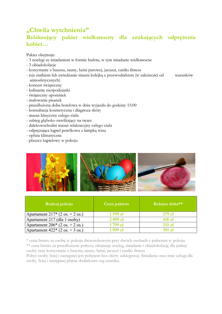 „Chwila wytchnienia” Relaksujący pakiet wielkanocny dla szukających odpręŜenia kobiet… Pakiet obejmuje: - 3 noclegi ze śniadaniem w formie bufetu, w tym śniadanie wielkanocne - 3 obiadokolacje - korzystanie z basenu, sauny, łaźni parowej, jacuzzi, cardio fitness - rejs statkiem lub zwiedzanie miasta kolejką z przewodnikiem (w zaleŜności od atmosferycznych) - koncert świąteczny - kulinarne niespodzianki - świąteczny upominek - malowanie pisanek - przedłuŜona doba hotelowa w dniu wyjazdu do godziny 15:00 - konsultacja kosmetyczna i diagnoza skóry - masaŜ klasyczny całego ciała - zabieg głęboko nawilŜający na twarz - dalekowschodni masaŜ relaksacyjny całego ciała - odpręŜająca kąpiel perełkowa z lampką wina - opłata klimatyczna - płaszcz kąpielowy w pokoju Rodzaj pokoju Apartament 217* (2 os. + 2 os.) Apartament 217 (dla 1 osoby) Apartament 206* (2 os. + 2 os.) Apartament 422* (2 os. + 3 os.) warunków Cena pakietu Kolejna doba** 1 599 zł 2 099 zł 1 799 zł 1 999 zł 279 zł 418 zł 335 zł 391 zł * cena brutto za osobę w pokoju dwuosobowym przy dwóch osobach z pakietem w pokoju ** cena brutto za przedłuŜenie pobytu; obejmuje nocleg, śniadanie i obiadokolację dla jednej osoby oraz korzystanie z basenu, sauny, łaźni, jacuzzi i cardio fitness Pobyt osoby 3ciej i następnej jest pobytem bez oferty zabiegowej. Śniadania oraz inne usługi dla osoby 3ciej i następnej płatne dodatkowo wg cennika.