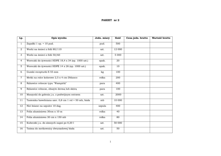 PAKIET nr 2 Lp. Opis wyrobu Jedn. miary Ilość 1 Zapałki 1 op. = 10 pud. pud. 500 2 Worki na śmieci z folii 80/110 szt. 12 000 3 Worki na śmieci z folii 50/60 szt. 5 000 4 Woreczki do żywności HDPE 18,4 x 34 (op. 1000 szt.) opak. 20 5 Woreczki do żywności HDPE 14 x 26 (op. 1000 szt.) opak. 10 6 Gumki recepturki fi 55 mm kg 100 7 Metki na rolce kolorowe 2,5 x 4 cm Dblanco rolka 200 8 Rękawice robocze typu "Wampirki" para 400 9 Rękawice robocze, obszyte dermą lub skórą para 100 10 Maszynki do golenia j.u. z podwójnym ostrzem szt. 2000 11 Tasiemka bawełniana szer. 0,8 cm 1 rol = 50 mb, biała mb 10 000 12 Nici lniane na szpulce 10 dag. szpula 400 13 Folia aluminiowa 30cm x 10 m rolka 40 14 Folia aluminiowa 30 cm x 150 mb rolka 80 15 Kubeczki j.u. do zimnych napoi po 0,20 l szt. 50 000 16 Taśma do metkownicy dwurzędowej biała szt. 50 1 Cena jedn. brutto Wartość brutto 17 Rolki termiczne do kas fiskalnych 28mmx30mb szt. 500 szt. 300 Rolki termiczne do parkomatów 57/150m.gilza 25 mm 18 gramatura ok. 62g/m2 19 Łyżka plastikowa szt. 10 000 20 Widelec plastikowy szt. 10 000 21 Nóż plastikowy szt. 5 000 22 Pojemnik plastikowy 0,5 l „flaczarka” szt. 10 000 23 Talerze plastikowe szt. 10 000 24 Folia stretch 3 kg szt. 10 25 Cerata 1,20 m. X 20 mb. rolka 5 Wartość brutto pakietu: ..................................... zł Zastosowano stawkę VAT: ............ % Słownie: ...................................................................................................................................................... ..................................... ............................... / miejscowość/ /data/ ............................................................... / podpis i pieczątka upoważnionego przedstawiciela / 2
