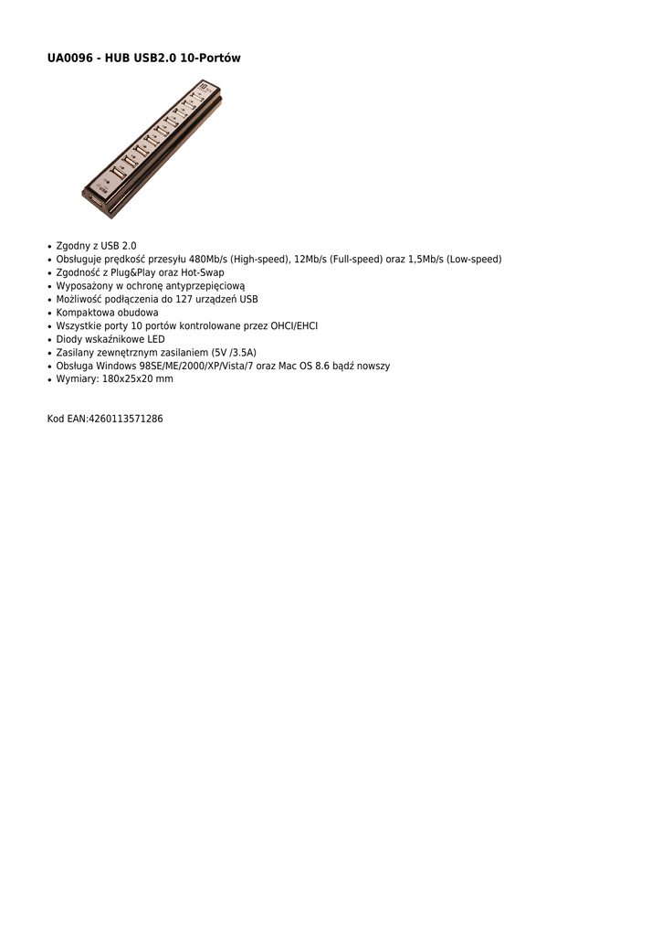 UA0096 - HUB USB2.0 10-Portów ● ● ● ● ● ● ● ● ● ● ● Zgodny z USB 2.0 Obsługuje prędkość przesyłu 480Mb/s (High-speed), 12Mb/s (Full-speed) oraz 1,5Mb/s (Low-speed) Zgodność z Plug&Play oraz Hot-Swap Wyposażony w ochronę antyprzepięciową Możliwość podłączenia do 127 urządzeń USB Kompaktowa obudowa Wszystkie porty 10 portów kontrolowane przez OHCI/EHCI Diody wskaźnikowe LED Zasilany zewnętrznym zasilaniem (5V /3.5A) Obsługa Windows 98SE/ME/2000/XP/Vista/7 oraz Mac OS 8.6 bądź nowszy Wymiary: 180x25x20 mm Kod EAN:4260113571286