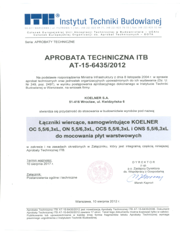 AT-15-6435/2012 2/17 ZAŁĄCZNIK POSTANOWIENIA OGÓLNE I TECHNICZNE Spis treści 1. PRZEDMIOT APROBATY .................................................................................................. 3 2. PRZEZNACZENIE, ZAKRES I WARUNKI STOSOWANIA ................................................ 3 3. WŁAŚCIWOŚCI TECHNICZNE. WYMAGANIA ................................................................ 4 3.1. Materiały ..................................................................................................................... 4 3.2. Łączniki ...................................................................................................................... 4 4. PAKOWANIE, PRZECHOWYWANIE I TRANSPORT...................................................... 10 5. OCENA ZGODNOŚCI ...................................................................................................... 10 5.1. Zasady ogólne .......................................................................................................... 10 5.2. Wstępne badanie typu .............................................................................................. 11 5.3. Zakładowa kontrola produkcji ................................................................................... 11 5.4. Badania gotowych wyrobów...................................................................................... 12 5.5. Częstotliwość badań ................................................................................................. 12 5.6. Metody badań ........................................................................................................... 12 5.7. Pobieranie próbek do badań ..................................................................................... 13 5.8. Ocena wyników badań .............................................................................................. 13 6. USTALENIA FORMALNO-PRAWNE ............................................................................... 13 7. TERMIN WAŻNOŚCI ....................................................................................................... 14 INFORMACJE DODATKOWE...... ................................................................................... ....15 RYSUNKI...... ................................................................................................................... ....16 AT-15-6435/2012 3/17 1. PRZEDMIOT APROBATY Przedmiotem niniejszej Aprobaty Technicznej ITB są łączniki wiercące, samogwintujące KOELNER OC 5,5/6,3xL, ON 5,5/6,3xL, OCS 5,5/6,3xL i ONS 5,5/6,3xL do mocowania płyt warstwowych. Producentem wyrobów objętych Aprobatą jest firma KOELNER S.A., 51-416 Wrocław, ul. Kwidzyńska 6. Łączniki wiercące, samogwintujące KOELNER OC 5,5/6,3xL, ON 5,5/6,3xL, OCS 5,5/6,3xL i ONS 5,5/6,3xL (rys. 1) mają postać trzpienia stalowego, nagwintowanego na dwóch odcinkach swojej długości, zakończonego z jednej strony wiertłem, a z drugiej łbem sześciokątnym i podkładką. Do podkładki nawulkanizowana jest uszczelka z EPDM. Łączniki oznaczone OC i ON są wykonane ze stali zwykłej, węglowej i pokrywane warstwą cynku o grubości nie mniejszej niż 12 µm, natomiast łączniki OCS i ONS – ze stali odpornej na korozję (stali nierdzewnej). Podkładki z ocynkowanej stali zwykłej, węglowej (oznaczenie T) są stosowane z łącznikami OC i ON, a ze stali odpornej na korozję (oznaczenie S) – stosowane z łącznikami OCS i ONS. Wymiary łączników objętych Aprobatą podano na rys. 2. Wymagane właściwości techniczne łączników wiercących, samogwintujących KOELNER OC 5,5/6,3xL, ON 5,5/6,3xL, OCS 5,5/6,3xL i ONS 5,5/6,3xL podano w p. 3. 2. PRZEZNACZENIE, ZAKRES I WARUNKI STOSOWANIA Łączniki wiercące, samogwintujące KOELNER OC 5,5/6,3xL, ON 5,5/6,3xL, OCS 5,5/6,3xL i ONS 5,5/6,3xL są przeznaczone do mocowania płyt warstwowych do podłoży z blachy stalowej o właściwościach mechanicznych nie niższych niż określonych dla gatunku S280GD według normy PN-EN 10346:2011. Ze względu na agresywność korozyjną środowiska, łączniki ze stali ocynowanej, objęte Aprobatą, mogą być stosowane zgodnie z normami PN-EN ISO 2081:2011 i PN-EN ISO 129442:2001, przy uwzględnieniu grubości powłoki cynkowej według p. 3.1. Ze względu na agresywność korozyjną środowiska, łączniki ze stali nierdzewnej, objęte Aprobatą, mogą być stosowane zgodnie z normą PN-71/H-86020 oraz w środowiskach o kategorii korozyjności atmosfery C1, C2 i C3 według normy PN-EN ISO 12944-2:2001. AT-15-6435/2012 4/17 Charakterystyczne i obliczeniowe nośności zamocowań łączników objętych Aprobatą podano w tablicach 1 ÷ 22. Do wkręcania łączników objętych Aprobatą należy używać elektronarzędzi mechanicznych z końcówkami dostosowanymi do typu łba. Łączniki objęte Aprobatą powinny być stosowane zgodnie z projektem technicznym, opracowanym dla określonego obiektu budowlanego, z uwzględnieniem obowiązujących norm i przepisów, postanowień niniejszej Aprobaty Technicznej oraz instrukcji stosowania opracowanej przez Producenta wyrobu. 3. WŁAŚCIWOŚCI TECHNICZNE. WYMAGANIA 3.1. Materiały Łączniki KOELNER OC 5,5/6,3xL i ON 5,5/6,3xL powinny być wykonane ze stali zwykłej, węglowej gatunku SAE 1022 według amerykańskiej normy AMS 5070:1994/RG i pokryte warstwą cynku o grubości nie mniejszej niż 12 µm. Powłoka cynkowa powinna spełniać wymagania normy PN-EN ISO 4042:2001. Łączniki KOELNER OCS 5,5/6,3xL i ONS 5,5/6,3xL powinny być wykonane ze stali odpornej na korozję, gatunku X5CrNi18-10 (1.4301) według normy PN-EN 10088-1:2005 (odpowiednik stali nierdzewnej i kwasoodpornej gatunku 0H18N9 według normy PN-71/H86020). Twardość powierzchni łączników objętych Aprobatą powinna być większa niż 530 HV, a twardość rdzenia łączników powinna być nie mniejsza niż 320 HV (według skali Vickersa). 3.2. Łączniki 3.2.1. Wygląd zewnętrzny, kształ