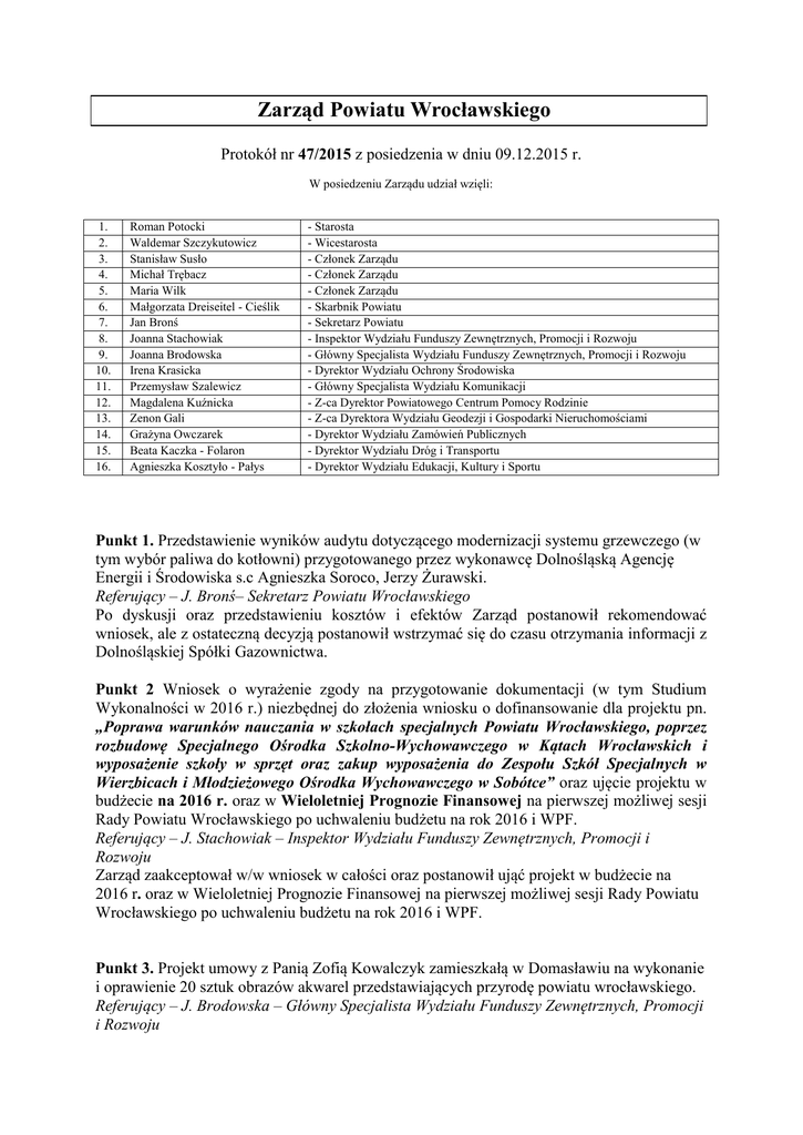Zarząd Powiatu Wrocławskiego Protokół nr 47/2015 z posiedzenia w dniu 09.12.2015 r. W posiedzeniu Zarządu udział wzięli: 1. 2. 3. 4. 5. 6. 7. 8. 9. 10. 11. 12. 13. 14. 15. 16. Roman Potocki Waldemar Szczykutowicz Stanisław Susło Michał Trębacz Maria Wilk Małgorzata Dreiseitel - Cieślik Jan Bronś Joanna Stachowiak Joanna Brodowska Irena Krasicka Przemysław Szalewicz Magdalena Kuźnicka Zenon Gali Grażyna Owczarek Beata Kaczka - Folaron Agnieszka Kosztyło - Pałys - Starosta - Wicestarosta - Członek Zarządu - Członek Zarządu - Członek Zarządu - Skarbnik Powiatu - Sekretarz Powiatu - Inspektor Wydziału Funduszy Zewnętrznych, Promocji i Rozwoju - Główny Specjalista Wydziału Funduszy Zewnętrznych, Promocji i Rozwoju - Dyrektor Wydziału Ochrony Środowiska - Główny Specjalista Wydziału Komunikacji - Z-ca Dyrektor Powiatowego Centrum Pomocy Rodzinie - Z-ca Dyrektora Wydziału Geodezji i Gospodarki Nieruchomościami - Dyrektor Wydziału Zamówień Publicznych - Dyrektor Wydziału Dróg i Transportu - Dyrektor Wydziału Edukacji, Kultury i Sportu Punkt 1. Przedstawienie wyników audytu dotyczącego modernizacji systemu grzewczego (w tym wybór paliwa do kotłowni) przygotowanego przez wykonawcę Dolnośląską Agencję Energii i Środowiska s.c Agnieszka Soroco, Jerzy Żurawski. Referujący – J. Bronś– Sekretarz Powiatu Wrocławskiego Po dyskusji oraz przedstawieniu kosztów i efektów Zarząd postanowił rekomendować wniosek, ale z ostateczną decyzją postanowił wstrzymać się do czasu otrzymania informacji z Dolnośląskiej Spółki Gazownictwa. Punkt 2 Wniosek o wyrażenie zgody na przygotowanie dokumentacji (w tym Studium Wykonalności w 2016 r.) niezbędnej do złożenia wniosku o dofinansowanie dla projektu pn. „Poprawa warunków nauczania w szkołach specjalnych Powiatu Wrocławskiego, poprzez rozbudowę Specjalnego Ośrodka Szkolno-Wychowawczego w Kątach Wrocławskich i wyposażenie szkoły w sprzęt oraz zakup wyposażenia do Zespołu Szkół Specjalnych w Wierzbicach i Młodzieżowego Ośrodka Wychowawczego w Sobótce” oraz ujęcie projektu w budżecie na 2016 r. oraz w Wieloletniej Prognozie Finansowej na pierwszej możliwej sesji Rady Powiatu Wrocławskiego po uchwaleniu budżetu na rok 2016 i WPF. Referujący – J. Stachowiak – Inspektor Wydziału Funduszy Zewnętrznych, Promocji i Rozwoju Zarząd zaakceptował w/w wniosek w całości oraz postanowił ująć projekt w budżecie na 2016 r. oraz w Wieloletniej Prognozie Finansowej na pierwszej możliwej sesji Rady Powiatu Wrocławskiego po uchwaleniu budżetu na rok 2016 i WPF. Punkt 3. Projekt umowy z Panią Zofią Kowalczyk zamieszkałą w Domasławiu na wykonanie i oprawienie 20 sztuk obrazów akwarel przedstawiających przyrodę powiatu wrocławskiego. Referujący – J. Brodowska – Główny Specjalista Wydziału Funduszy Zewnętrznych, Promocji i Rozwoju Zarząd zaakceptował w/w umowę. Umowa została zaakceptowana jednogłośnie. Punkt 4. Projekt umowy pomiędzy Powiatem Wrocławskim a Kamilą Szymańską prowadzącą działalność gospodarczą pod nazwą P.P.H.U. KAMDO Kamila Szymańska, z siedzibą w Bydgoszczy przy ul. Świeckiej 8. Przedmiotem umowy jest wykonanie i dostawa materiałów w postaci 1000 sztuk workoplecaków odblaskowych z nadrukiem wykorzystującym herb i nazwę Powiatu Wrocławskiego. Zadanie realizowane w ramach wspomagania ekologicznych form transportu - ma za zadanie zachęcenie i zapewnienie bezpieczeństwa przy wykorzystaniu różnych form transportu. Referujący – I. Krasicka – Dyrektor Wydziału Ochrony Środowiska Zarząd zaakceptował w/w umowę. Umowa została zaakceptowana jednogłośnie. Punkt 5. Decyzje dt. obciążenia właściciela pojazdu kosztami wynikającymi z usunięcia, przechowywania i oszacowania pojazdu. Decyzje dt. następujących pojazdów: 1. OPEL VECTRA – nr rej. OB 48881 – kwota obciążająca właściciela – 2612,00 zł; 2. POLONEZ CARO – nr rej. DST W096 – kwota obciążająca właściciela – 5064,70 zł; 3. OPEL KADETT 1,3 – nr rej. DKL 56EY – kwota obciążająca właściciela – 7035,34 zł. UZASADNIENIE Przedmiotowe pojazdy zgodnie z prawomocnymi postanowieniami sądów przeszły na własność Powiatu Wrocławskiego. W toku postępowania prowadzonego w trybie art. 130a ustawy z dnia 20 czerwca 1997 r. - Prawo o ruchu drogowym (Dz. U. z 2012 r., poz. 1137) Powiat Wrocławski poniósł koszty związane z usunięciem i przechowywaniem pojazdu na parkingu strzeżonym oraz wynagrodzeniem rzeczoznawcy samochodowego w zakresie oszacowania pojazdu, sporządzenia ekspertyzy i wykonania zdjęć. Przedmiotowe decyzje wydawane są zgodnie z regulacją ustawową zawartą w art. 130a ust. 10h i ust. 10j ustawy z dnia 20 czerwca 1997r. Prawo o ruchu drogowym (Dz. U. z 2012 r. poz. 1137 ze zm.): 10h. Koszty związane z usuwaniem, przechowywaniem, oszacowaniem, sprzedażą lub zniszczeniem pojazdu powstałe od momentu wydania dyspozycji jego usunięcia do zakończenia postępowania ponosi osoba będąca właścicielem tego pojazdu w dniu wydania dyspozycji usunięcia pojazdu, z zastrzeżeniem ust. 10d i 10i. Decyzję o zapłacie tych kosztów wydaje starosta. 10i. Jeżeli w chwili usunięcia pojazd znajdował się we władaniu osoby dysponującej nim na podstawie innego niż własność tytułu prawnego, osoba ta jest zobowiązana solidarnie do pokrycia kosztów, o których mowa w ust. 10h. Referujący – P. Szalewicz – Główny Specjalista w Wydziale Komunikacji Zarząd jednogłośnie postanowił obciążyć wszystkich trzech właścicieli pojazdów. Punkt 6. Projekt Uchwały Rady Powiatu Wrocławskiego w sprawie przyjęcia Programu Oddziaływań Korekcyjno-Edukacyjnych dla Osób Stosujących Przemoc w Rodzinie na lata 2016-2020. Referujący – M. Kuźnicka – Z-ca Dyrektora Powiatowego Centrum Pomocy Rodzinie Zarząd pozytywnie zaopiniował projekt i skierował pod obrady Rady Powiatu. Punkt 7. Projekt Uchwały