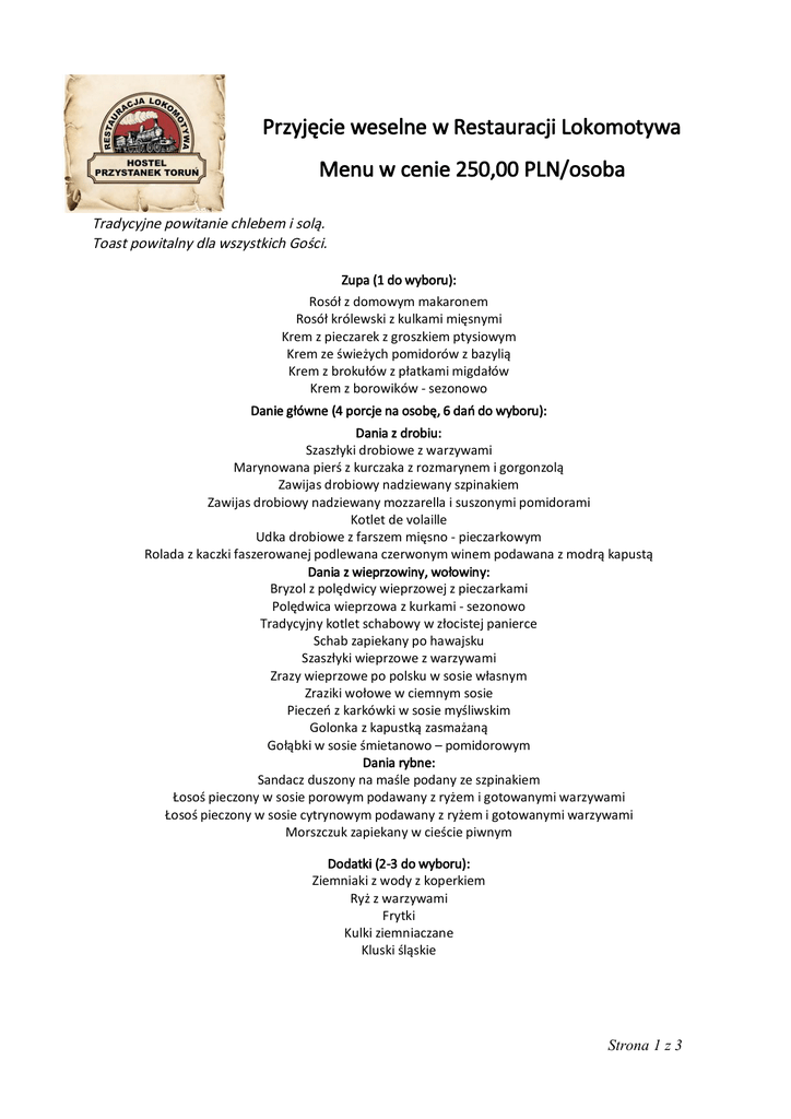 Przyjęcie weselne w Restauracji Lokomotywa Menu w cenie 250,00 PLN/osoba Tradycyjne powitanie chlebem i solą. Toast powitalny dla wszystkich Gości. Zupa (1 do wyboru): Rosół z domowym makaronem Rosół królewski z kulkami mięsnymi Krem z pieczarek z groszkiem ptysiowym Krem ze świeżych pomidorów z bazylią Krem z brokułów z płatkami migdałów Krem z borowików - sezonowo Danie główne (4 porcje na osobę, 6 dań do wyboru): Dania z drobiu: Szaszłyki drobiowe z warzywami Marynowana pierś z kurczaka z rozmarynem i gorgonzolą Zawijas drobiowy nadziewany szpinakiem Zawijas drobiowy nadziewany mozzarella i suszonymi pomidorami Kotlet de volaille Udka drobiowe z farszem mięsno - pieczarkowym Rolada z kaczki faszerowanej podlewana czerwonym winem podawana z modrą kapustą Dania z wieprzowiny, wołowiny: Bryzol z polędwicy wieprzowej z pieczarkami Polędwica wieprzowa z kurkami - sezonowo Tradycyjny kotlet schabowy w złocistej panierce Schab zapiekany po hawajsku Szaszłyki wieprzowe z warzywami Zrazy wieprzowe po polsku w sosie własnym Zraziki wołowe w ciemnym sosie Pieczeń z karkówki w sosie myśliwskim Golonka z kapustką zasmażaną Gołąbki w sosie śmietanowo – pomidorowym Dania rybne: Sandacz duszony na maśle podany ze szpinakiem Łosoś pieczony w sosie porowym podawany z ryżem i gotowanymi warzywami Łosoś pieczony w sosie cytrynowym podawany z ryżem i gotowanymi warzywami Morszczuk zapiekany w cieście piwnym Dodatki (2-3 do wyboru): Ziemniaki z wody z koperkiem Ryż z warzywami Frytki Kulki ziemniaczane Kluski śląskie Strona 1 z 3 Zestaw surówek Warzywa gotowane na parze okraszone bułką tartą Zakąski zimne (14 do wyboru, 9 porcji na osobę): Patery mięsna nr 1 (3 dania): - pasztet domowy z sosem żurawinowym - zawijany schabik z musem chrzanowym - kaczka faszerowana z morelami Patera mięsna nr 2 (3 dania): - galantyna z kurczaka z sosem tatarskim - karkówka nadziewana porem - pieczeń rzymska z jajkiem Półmisek mięs w galarecie (3 dania): Galantyna z kurczaka Schab po warszawsku Ruloniki z szynki ze szparagami Zimne nóżki w galarecie Galaretki drobiowe Cygara mięsne z sosami Klopsiki w occie Mix rybny w galarecie (pstrąg, łosoś) Patera rybna (3 dania): - rolada szpinakowa z łososiem - jajka dekorowane kawiorem -pstrąg wędzony Ławica śledzi (1 danie): Śledziki z cebulką w oleju Śledziki po japońsku Śledziki po kaszubsku Śledziki w sosie śmietanowo musztardowym Sałatki: Sałatka tradycyjna jarzynowa Sałatka chłopska Sałatka grecka Kokardki makaronowe z ananasem i kurczakiem curry Mix sałat z grillowanym kurczakiem Ryba po grecku Potrawy gorące podawane nocą (2 potrawy do wyboru: 1 danie mięsne, 1 zupa): Zraziki w sosie węgierskim z kopytkami Pieczeń z karkówki w sosie śmietanowo – grzybowym z kluskami śląskimi Żeberka na miodzie z pieczonymi ziemniakami Sznycelki z indyka z kopytkami i buraczkami zasmażanymi Żur na zakwasie z jajkiem i białą kiełbasą Barszcz czerwony z pasztecikiem Około 1:00 wjazd „płonącej” Lokomotywy : -udziec wieprzowy podawany z kaszą gryczaną i kapustą zasmażaną lub - pieczony indyk nadziewany kaszą jaglaną Wagon biesiadny: Kiełbasy i szynki wiejskie Wyroby podrobowe (salceson, kaszanka, pasztetowa) Smalec domowy z cebulką, ogórki kiszone, chleb wiejski Na ciepło podawany bigos staropolski lub flaczki drobiowe lub żurek lub misa pierogów Dodatki: Pieczywo, masło Napoje serwowane w sposób ciągły: kawa, herbata z dodatkami, woda mineralna niegazowana z cytryną lub miętą, soki owocowe. Napoje gazowane w ilości: 1 L/osobę Bufet deserowy w cenie: Różne rodzaje ciasta w ilości 3,5 porcji na osobę, piękna oprawa, profesjonalna prezentacja, dodatkowo wg ustaleń: babeczki owocowe, cukierki, słodkie pianki, pierniczki, owoce Fontanny czekoladowa, fontanna alkoholowa w cenie menu Strona 2 z 3 Możliwość dodatkowego zamówienia tortu weselnego, w tym jego uroczysty wjazd i oprawę Możliwość wynajęcia usługi „drink bar weselny” w cenie 1500-2000 zł Dodatkowo oferujemy: Pokój dla Pary Młodej gratis Promocyjne ceny pokoi dla Gości weselnych Bezpłatny parking Dzieci do 3 lat - gratis (bez własnego krzesła i zastawy) Dzieci do 10 lat - 50% ceny Obsługa wesela wynajęta przez Zleceniodawców: (zespół muzyczny, fotograf itp.) - 50% ceny KONTAKT Restauracja Lokomotywa ul. Chłopickiego 4 87-100 Toruń tel. kom. 665 818 188 [email protected] www.restauracjalokomotywa.pl Strona 3 z 3
