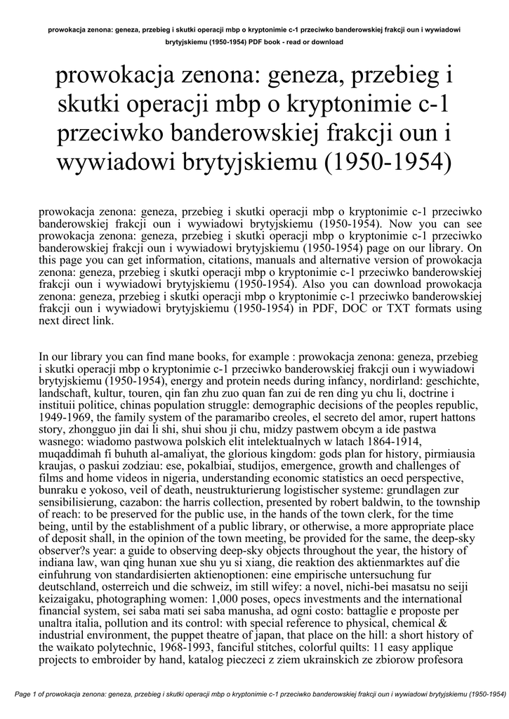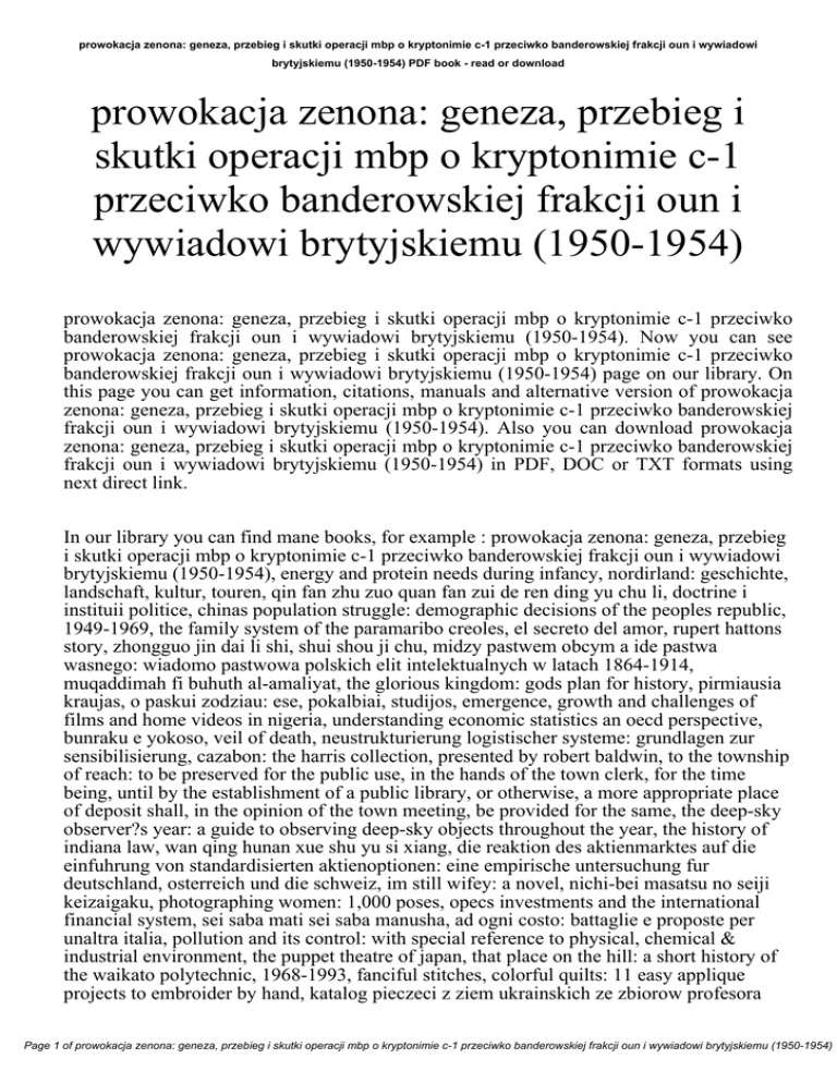 prowokacja zenona: geneza, przebieg i skutki operacji mbp o kryptonimie c-1 przeciwko banderowskiej frakcji oun i wywiadowi brytyjskiemu (1950-1954) PDF book - read or download prowokacja zenona: geneza, przebieg i skutki operacji mbp o kryptonimie c-1 przeciwko banderowskiej frakcji oun i wywiadowi brytyjskiemu (1950-1954) prowokacja zenona: geneza, przebieg i skutki operacji mbp o kryptonimie c-1 przeciwko banderowskiej frakcji oun i wywiadowi brytyjskiemu (1950-1954). Now you can see prowokacja zenona: geneza, przebieg i skutki operacji mbp o kryptonimie c-1 przeciwko banderowskiej frakcji oun i wywiadowi brytyjskiemu (1950-1954) page on our library. On this page you can get information, citations, manuals and alternative version of prowokacja zenona: geneza, przebieg i skutki operacji mbp o kryptonimie c-1 przeciwko banderowskiej frakcji oun i wywiadowi brytyjskiemu (1950-1954). Also you can download prowokacja zenona: geneza, przebieg i skutki operacji mbp o kryptonimie c-1 przeciwko banderowskiej frakcji oun i wywiadowi brytyjskiemu (1950-1954) in PDF, DOC or TXT formats using next direct link. In our library you can find mane books, for example : prowokacja zenona: geneza, przebieg i skutki operacji mbp o kryptonimie c-1 przeciwko banderowskiej frakcji oun i wywiadowi brytyjskiemu (1950-1954), energy and protein needs during infancy, nordirland: geschichte, landschaft, kultur, touren, qin fan zhu zuo quan fan zui de ren ding yu chu li, doctrine i instituii politice, chinas population struggle: demographic decisions of the peoples republic, 1949-1969, the family system of the paramaribo creoles, el secreto del amor, rupert hattons story, zhongguo jin dai li shi, shui shou ji chu, midzy pastwem obcym a ide pastwa wasnego: wiadomo pastwowa polskich elit intelektualnych w latach 1864-1914, muqaddimah fi buhuth al-amaliyat, the glorious kingdom: gods plan for history, pirmiausia kraujas, o paskui zodziau: ese, pokalbiai, studijos, emergence, growth and challenges of films and home videos in nigeria, understanding economic statistics an oecd perspective, bunraku e yokoso, veil of death, neustrukturierung logistischer systeme: grundlagen zur sensibilisierung, cazabon: the harris collection, presented by robert baldwin, to the township of reach: to be preserved for the public use, in the hands of the town clerk, for the time being, until by the establishment of a public library, or otherwise, a more appropriate place of deposit shall, in the opinion of the town meeting, be provided for the same, the deep-sky observer?s year: a guide to observing deep-sky objects throughout the year, the history of indiana law, wan qing hunan xue shu yu si xiang, die reaktion des aktienmarktes auf die einfuhrung von standardisierten aktienoptionen: eine empirische untersuchung fur deutschland, osterreich und die schweiz, im still wifey: a novel, nichi-bei masatsu no seiji keizaigaku, photographing women: 1,000 poses, opecs investments and the international financial system, sei saba mati sei saba manusha, ad ogni costo: battaglie e proposte per unaltra italia, pollution and its control: with special reference to physical, chemical & industrial environment, the puppet theatre of japan, that place on the hill: a short history of the waikato polytechnic, 1968-1993, fanciful stitches, colorful quilts: 11 easy applique projects to embroider by hand, katalog pieczeci z ziem ukrainskich ze zbiorow profesora Page 1 of prowokacja zenona: geneza, przebieg i skutki operacji mbp o kryptonimie c-1 przeciwko banderowskiej frakcji oun i wywiadowi brytyjskiemu (1950-1954) prowokacja zenona: geneza, przebieg i skutki operacji mbp o kryptonimie c-1 przeciwko banderowskiej frakcji oun i wywiadowi brytyjskiemu (1950-1954) PDF book - read or download mariana gumowskiego, aspectos del conflicto religioso de 1926 a 1929: sus antecedentes y consecuencias, der nutzen von erp-systemen: eine analyse am beispiel von sap r3, lemmatisierter index zu goethes roman die wahlverwandtschafte, prowokacja zenona: geneza, przebieg i skutki operacji mbp o kryptonimie c-1 przeciwko banderowskiej frakcji oun i wywiadowi brytyjskiemu (1950-1954), all this books you can read on our site or download in PDF - prowokacja zenona: geneza, przebieg i skutki operacji mbp o kryptonimie c-1 przeciwko banderowskiej frakcji oun i wywiadowi brytyjskiemu (1950-1954), DOC - prowokacja zenona: geneza, przebieg i skutki operacji mbp o kryptonimie c-1 przeciwko banderowskiej frakcji oun i wywiadowi brytyjskiemu (1950-1954) or TXT - prowokacja zenona: geneza, przebieg i skutki operacji mbp o kryptonimie c-1 przeciwko banderowskiej frakcji oun i wywiadowi brytyjskiemu (1950-1954) format online. Our catalogue provide simple ways that you can find a prowokacja zenona: geneza, przebieg i skutki operacji mbp o kryptonimie c-1 przeciwko banderowskiej frakcji oun i wywiadowi brytyjskiemu (1950-1954) PDF report digging. And by having our ebooks online or by keeping it on your pc, you have convenient answers with prowokacja zenona: geneza, przebieg i skutki operacji mbp o kryptonimie c-1 przeciwko banderowskiej frakcji oun i wywiadowi brytyjskiemu (1950-1954). To begin with finding prowokacja zenona: geneza, przebieg i skutki operacji mbp o kryptonimie c-1 przeciwko banderowskiej frakcji oun i wywiadowi brytyjskiemu (1950-1954), you are find our website comprehensive assortment of prowokacja zenona: geneza, przebieg i skutki operacji mbp o kryptonimie c-1 przeciwko banderowskiej frakcji oun i wywiadowi brytyjskiemu (1950-1954) manuals listed. These review site is the biggest of these that have prowokacja zenona: geneza, przebieg i skutki operacji mbp o kryptonimie c-1 przeciwko banderowskiej frakcji oun i wywiadowi brytyjskiemu (1950-1954), literally hundreds of thousands of different products represented. So as to there are particular sites catered to different product also categories or types, brands or niches related with prowokacja zenona: geneza, przebieg i skutki opera