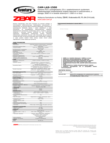CAM-LAS-1500 Kamera PTZ o powiększeniu 22x z opatentowanym systemem dalekosiężnego podświetlania wiązką laserowa w podczerwieni, o zasięgu 3000 m w świetle dziennym i 1500 m w nocy Wyłączny Dystrybutor na Polskę: ZBAR, Krakowska 60, PL-94-214 Łódź, www.zbar.com.pl Kamery typoszeregu LAS firmy Aventura są owocem postępu w technologiach wideomonitoringu. Dalekosiężne zobrazowanie w podczerwieni za pomocą lasera umożliwia obserwację, wykrywanie i automatyczne śledzenie obrazu i celów oddalonych o wiele kilometrów, ze szczegółowym odwzorowaniem obiektów. Opatentowana technologia niezależnego lasera umożliwia regulację skupienia i kierunku matrycy świetlnej (w tzw. technologii szperacza). Standardowa konfiguracja wyrobu obejmuje elektroniczne sterowanie zoomem oraz transmisję danych poprzez interfejs RS-485 za pomocą protokołów Pelco D/Extended. Dostępny w opcji system analizy treści obrazu wideo chroni przed zagrożeniami, zanim staną się wymierne. Okres gwarancji (obowiązuje od 1 stycznia 2009 r.) 1 rok DANE TECHNICZNE KAMERA W yko n a n ie S t a n d a rd s yg n a łu w id e o C z u j n ik o b ra z u Ro z d z ie lc z o ś c i w p iks e la c h Ro z d z ie lc z o ś ć w lin ia c h O b ie kt yw P o le w id z e n ia (H ) M in im a ln e n a t ę ż en ie o ś w ie t le n ia S t o s u n e k s yg n a ł/s z u m M ig a w ka e le kt ro n ic z n a S z e ro ki z a kre s d yn a m ic z n y Ko m p e ns a c j a p o d św ie t le n ia LASER S ku t e c z n y z a s ięg p o la w id z e n ia Z a s ila n ie la s e ra S o c z e w ka la se ra Ś w ia t ło la s e ro w e MECHANIZM (głowica PTZ) P o le o b s e rwa c j i P rę d ko ś ć o b ro tu w p io n ie /p o z io m ie Do kła d n o ś ć p o ło ż e n ia CECHY SYSTEMU P o łą c z e n ie z d a lne g o s t e ro w a n ia A u t o m a t yc z na g rz a łka P ro g ra m o wa ln e p rz e s z u kiw a n ie Z g o d n oś ć z P e lc o D P R ZED S TA WI E NIE OB RA ZU W yj ś c ie w id e o Z łą c z e s yg n a łu INTERFEJSY TC P /I P RS -2 3 2 WARUNKI PRACY Te m pe ra t u ra p rac y Te m pe ra t u ra p rz e c h ow yw a n ia A u t o m a t yc z ne o d s z ra n ia n ie s z yb ki M I L -S TD 8 1 0 E W ilg o t n o ś ć o t o c ze n ia p o d c za s p rac y S t o p ie ń o c h ro n y (I E C 60529) W yko n a n ie w o d o s zc z e lne W yt rz ym a ło ś ć n a w s t rz ą s y P o z o s t a łe PARAMETRY ELEKTRYCZNE Na p ię c ie z a s ila n ia Pobór mocy GABARYTY C ię ż a r W ym ia ry (s z e r. x w ys . x d ł. ) Tw o rz yw o o b u d o w y Ko lo r o b u d o w y S p o s ób m o c o w an ia ATESTY Atesty La s e ro w a ka me ra n o kt o w iz yj n a z re g u la c j ą o b ro t u w p io n ie i p o z io m ie NTS C /P A L C C D 1/2" ro z s z e rz o n y o p a s mo p o d c ze rw ie n i 752 x 582 540 23~ 500m m , 22x 18° ~ 1, 0° 0, 02 lu ks a (ko lo r), 0, 0009 lu x (c z /b ) ≥ 50 d B 1/50 -1/10 000 s , 16 -s t o p n io w a W ł. /W ył. W ł. /W ył. 1 500 m z a d n ia , 3 000 m w n o c y Dw u o b w o d ow e z re g u lac j ą n a p ięc ia i n a t ę że n ia , c z a s w łą c ze n ia 1 s , re g u la c j a z e w n ę t rz na ś w ia t ło c z u ła 20 x 50 m m s o c z e w ka la s e ro w a t e le fo t o g ra fic z n a f2, 0, w ie lo w a rs t w o w a p o w ło ka d la z a kre s u b lis kie g o p o d c ze rw ie n i, s p rzę ż e n ie la se ra > 9 5 % M o c : 8 W , d łu g o ś ć fa li: 810 n m , ką t o ś w ie t le n ia : 2 -17° , ś w ia t ło j e d n o ro d n e, la s e r a z o t o w y O b ró t o 355° w p o z io m ie o ra z w p io n ie + 6° ~ 90° ; P rę d ko ś ć : 1 -9° /s w p o z io m ie , 1 -4 ° /s w p io n ie 1 m ra d • 3000 m w świetle dziennym i 1500 m w nocy • Obiektyw zmiennoogniskowy 23~500 mm • Zoom lasera podczerwieni niezależny od kamery • Rozpoznawanie celu/obserwacja przez szkło • Rozdzielczość linowa 540, szeroki zakres dynamiczny • IP66 • Podświetlanie w trybie niewykrywalnym (opcja) • Większa oszczędność niż w przypadku kamer termowizyjnych DOSTĘPNE MODELE Nr kat. Opis CAM-LAS-1500 Kamera PTZ o powiększeniu 22x z opatentowanym systemem dalekosiężnego podświetlania wiązką laserową w podczerwieni; 3000 m w świetle dziennym i 1500 m w nocy RS -4 8 5 Ta k 32 p ro g ra m y n a 1 ś c ie ż kę P e lc o D/E xt e n d ed P ro t o c o l S yg n a ł c a łko w it y, 1, 0 V p -p /75 o m ó w W yj ś c ie w id e o B NC Opcja Opcja -25° C ~ 55° C ( -13° F ~ 131° F ) -40° C ~ 65°C ( -40° F ~ 149° F ) Nie O d p o rn oś ć n a o p ad y, p ia se k/p ył, u d a r i d rg a n ia M a ks . 90% I P 66 Ta k 4 g P ró b a m g ły w o d n e j p rze z 48 g o d z z pH 6 , 5 - 7, 2 24 V A C 30 - 85 W 30 kg (66 lb ) 190 x 260 x 600 m m (7, 5" x 10, 2 5 " x 23, 5") O s ło n a : S t o p a lu m in io w y, o b ra b ia n y p re c yz yj n ie ; S z kło : o p t yc z n e , m ikro lit yc z n e ; P o w ło ka : p rz e c iw o db la s ko w a Beżowy 4 o t w o ry m o n t a ż o w e CE, FCC, UL ZBAR PHU, Krakowska 60, PL-94-214 Łódź, www.zbar.com.pl Wszelkie prawa zastrzeżone: ZBAR PHU, Krakowska 60, PL-94-214 Łódź, www.zbar.com.pl Logo ZBAR i Aventura są zastrzeżonymi znakami towarowymi. Dane techniczne mogą ulec zmianie bez uprzedzenia. © Copyright 2012. Wszelkie prawa do niniejszego tłumaczenia posiada: ZBAR PHU, Krakowska 60, PL-94-214 Łódź, www.zbar.com.pl, żadna cześd tej pracy nie może byd powielana i rozpowszechniana, w jakiejkolwiek formie, bez pisemnej zgody ZBAR PHU. Strona 1
