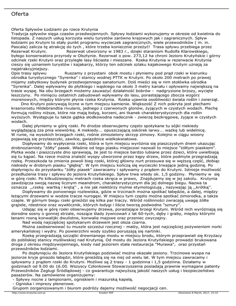 Oferta Oferta Spływów Łodziami po rzece Krutynia Tradycja spływów sięga czasów przedwojennych. Spływy łodziami wykonujemy w okresie od kwietnia do listopada. Z naszych usług korzysta wielu turystów zarówno krajowych jak i zagranicznych. Spływ łodziami po Krutyni to stały punkt programu wycieczek zagranicznych, wiele przewodników ( m. in. Pascala) zalicza tę atrakcję do tych , które trzeba koniecznie przeżyć! Trasa spływu przebiega przez Rezerwat Krutyni. Rezerwat utworzony w 1983 r., dzięki staraniom Rudolfa Klarowskiego, byłego konserwatora przyrody w Olsztynie. Rezerwat o pow. 273,12 ha chroni Jezioro Krutyńskie i górny odcinek rzeki Krutyni oraz przyległe lasy liściaste i mieszane. Rzeka Krutynia w rezerwacie Krutynia cieszy się uznaniem turystów i kajakarzy, którzy ten odcinek szlaku kajakowego Krutyni uznają za najatrakcyjniejszy. Opis trasy splywu Ruszamy z przystani obok mostu i płyniemy pod prąd rzeki w kierunku ośrodka turystycznego "Syrenka" i stanicy wodnej PTTK w Krutyni. Po około 200 metrach po prawej mijamy zabytkowy budynek przedwojennego sanatorium. Dziś mieści się w nim stołówka ośrodka "Syrenka". Dalej wpływamy do płytkiego i wąskiego na około 3 metry kanału i opływamy największą na trasie wyspę. Na obu brzegach możemy zauważyć działalność bobrów - nadgryzione brzozy, wycięte leszczyny. Po minięciu ostatnich zabudowań wpływamy do lasu, porastającego zbocza wzgórz morenowych, między którymi płynie rzeka Krutynia. Rzeka ujawnia osobliwości świata roślin i zwierząt. Dno Krutyni pokrywają liczne w tym miejscu kamienie. Większość Z nich pokryta jest plechami krasnorostu Hildebrandtia rivularis, jednego z czerwonych glonów, żyjących w czystych wodach. Plechę formują rośliny niższe, które nie mają łodyg, korzeni, ani tkanek charakterystycznych dla roślin wyższych. Występuje tu także gąbka słodkowodna nadecznik - zwierzę bezkręgowe, żyjące w czystych wodach. Dalej płyniemy w górę rzeki. Po drodze obserwujemy często spotykane tu sójki niekiedy wyglądającą zza pnia wiewiórkę. A niekiedy... opuszczającą oskórek larwy... ważkę lub widelnicę. W runie, na wysokich brzegach rzeki, rośnie zimozielony skrzyp zimowy. Kolejno w ciągu wiosny pojawiają się przylaszczki, zawilce, gwiazdnice wielkokwiatowe. Dopływamy do wypłycenia rzeki, która w tym miejscu wyróżnia się piaszczystym dnem ukazując drobnoziarnisty "żółty" pasek. Właśnie od tego piasku miejscowi nazwali to miejsce "żółtym piaskiem". Płytka woda i piaszczyste dno sprawiają, że jest to miejsce bardzo lubiane przez dzieci, które uwielbiają się tu kąpać. Na rzece można znaleźć wyspy utworzone przez kępy drzew, które podmyte przegradzają rzekę. Przeszkoda ta zmienia powoli bieg rzeki, której główny nurt przesuwa się w węższą część, żłobiąc niekiedy w drobnym piasku "głębię". W tym miejscu kończą się wycieczki trwające jedną godzinę. Po dopłynięciu do przystanku "żółty piasek" zawracamy i spływamy z prądem do Krutyni. Istnieje możliwość przedłużenia trasy i spływu do jeziora Krutyńskiego. Spływ trwa wtedy ok. 1,5 godziny. Płyniemy w się w górę rzeki. Po kilkudziesięciu metrach rzeka skręca w prawo, Znajdujemy się w jej zakolu. Krutynia zawdzięcza swoją nazwę licznym meandrom, charakterystycznym dla jej dolnego biegu. Nazwa ta oznacza ,,rzekę wartką i krętą'' , a nie jak niektórzy mylnie etymologizują , nazywając ją ,,krótką''. Dopływamy do ponownego rozlewiska, gdzie w trzcinach można spotkać łabędzie, a dalej, między leżącymi drzewami w wodzie tracze nurogęsi. W miejscu tym często można spotkać zimorodka, a także czaple. W górnym biegu rzeki gnieździ się kilka par traczy. Wśród roślinności zwracają uwagę żółte grążele, rdestnice oraz wywłócznik, których łodygi i liście tworzą podwodne "sznury". Udając się w górę rzeki obserwujemy drzewa, porastające brzegi Krutyni. Wśród nich wyróżniają się dorodne sosny o gonnej strzale, noszące ślady żywicowań z lat 60-tych, dęby i graby, między którymi łanami rosną konwalijki dwulistne, konwalie majowe oraz przeniec zwyczajny. Nad wodą najczęściej spotykanym drzewem jest olsza czarna. Można zaobserwować tu muszle szczeżui rzecznej - małży, która jest najczęściej pożywieniem norki amerykańskiej i wydry. Po powierzchni wody szybko poruszają się nartniki. Rzekę przegradzają szczątki drewnianego mostu w miejscu brodu, którym przeprawiali się Krzyżacy do pobliskiej stanicy myśliwskiej nad Krutynią. Od mostu do Jeziora Krutyńskiego prowadzi brukowana droga z okresu międzywojennego, kiedy nad jeziorem stała restauracja "Murawa", oraz przystań przewoźników łodziami. Po dopłynięciu do Jeziora Krutyńskiego podziwiać można okazałe jesiony. Trzcinowa wyspa na jeziorze kryje gniazdo łabędzi, które gnieżdżą się na niej od wielu lat. W tym miejscu zawracamy i spływamy z prądem rzeki do Krutyni. Możliwe są 2 trasy - 1 godzinna i 1,5 godzinna. Działamy w godzinach od 9.00 do 16.00. Wszyscy Członkowie Stowarzyszenia posiadają prawnie wymagane patenty Przewoźników Żeglugi Śródlądowej - co gwarantuje najwyższą jakość naszych usług i bezpieczeństwo pasażerów. Na zamówienie organizujemy: - Spływy nocne z lampionami, ogniskiem i mazurską kapelą. - Ogniska i imprezy plenerowe. Grupom zorganizowanym i biurom podróży dajemy możliwość negocjacji cen. http://www.krutynia.com.pl Kreator PDF Utworzono 8 March, 2017, 15:33 http://www.krutynia.com.pl Kreator PDF Utworzono 8 March, 2017, 15:33