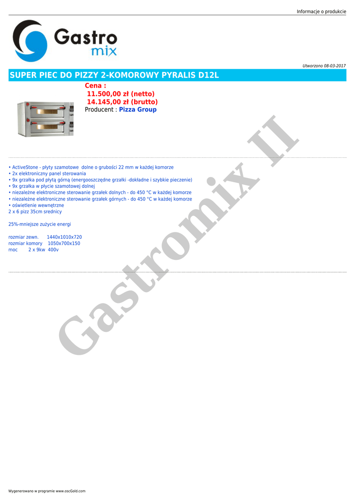 Informacje o produkcie Utworzono 08-03-2017 SUPER PIEC DO PIZZY 2-KOMOROWY PYRALIS D12L Cena : 11.500,00 zł (netto) 14.145,00 zł (brutto) m ix • ActiveStone - płyty szamotowe dolne o grubości 22 mm w każdej komorze • 2x elektroniczny panel sterowania • 9x grzałka pod płytą górną (energooszczędne grzałki -dokładne i szybkie pieczenie) • 9x grzałka w płycie szamotowej dolnej • niezależne elektroniczne sterowanie grzałek dolnych - do 450 °C w każdej komorze • niezależne elektroniczne sterowanie grzałek górnych - do 450 °C w każdej komorze • oświetlenie wewnętrzne 2 x 6 pizz 35cm srednicy II Producent : Pizza Group G as rozmiar zewn. 1440x1010x720 rozmiar komory 1050x700x150 moc 2 x 9kw 400v tr o 25%-mniejsze zużycie energi Wygenerowano w programie www.oscGold.com