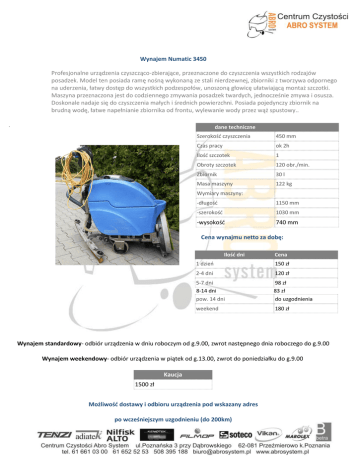 Wynajem Numatic 3450 Profesjonalne urządzenia czyszcząco-zbierające, przeznaczone do czyszczenia wszystkich rodzajów posadzek. Model ten posiada ramę nośną wykonaną ze stali nierdzewnej, zbiorniki z tworzywa odpornego na uderzenia, łatwy dostęp do wszystkich podzespołów, unoszoną głowicę ułatwiającą montaż szczotki. Maszyna przeznaczona jest do codziennego zmywania posadzek twardych, jednocześnie zmywa i osusza. Doskonale nadaje się do czyszczenia małych i średnich powierzchni. Posiada pojedynczy zbiornik na brudną wodę, łatwe napełnianie zbiornika od frontu, wylewanie wody przez wąż spustowy.. . dane techniczne Szerokość czyszczenia 450 mm Czas pracy ok 2h Ilość szczotek 1 Obroty szczotek 120 obr./min. Zbiornik 30 l Masa maszyny 122 kg Wymiary maszyny: -długość 1150 mm -szerokość 1030 mm -wysokość 740 mm Cena wynajmu netto za dobę: Ilość dni Cena 1 dzień 150 zł 2-4 dni 120 zł 5-7 dni 8-14 dni pow. 14 dni 98 zł 83 zł do uzgodnienia weekend 180 zł Wynajem standardowy- odbiór urządzenia w dniu roboczym od g.9.00, zwrot następnego dnia roboczego do g.9.00 Wynajem weekendowy- odbiór urządzenia w piątek od g.13.00, zwrot do poniedziałku do g.9.00 Kaucja 1500 zł Możliwość dostawy i odbioru urządzenia pod wskazany adres po wcześniejszym uzgodnieniu (do 200km)