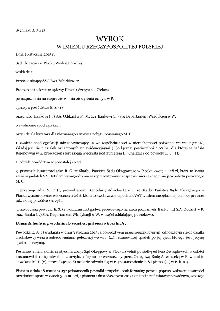Sygn. akt IC 31/13 WYROK W IMIENIU RZECZYPOSPOLITEJ POLSKIEJ Dnia 26 stycznia 2015 r. Sąd Okręgowy w Płocku Wydział Cywilny w składzie: Przewodniczący SSO Ewa Fabirkiewicz Protokolant sekretarz sądowy Urszula Szczęsna – Cichosz po rozpoznaniu na rozprawie w dniu 26 stycznia 2015 r. w P. sprawy z powództwa E. S. (1) przeciwko Bankowi (...) S.A. Oddział w P., M. C. i Bankowi (...) S.A Departament Windykacji w W. o zwolnienie spod egzekucji przy udziale kuratora dla nieznanego z miejsca pobytu pozwanego M. C. 1. zwalnia spod egzekucji udział wynoszący ¼ we współwłasności w nieruchomości położonej we wsi Ł.gm. S., składającej się z działek oznaczonych nr ewidencyjnymi (...)o łącznej powierzchni 2,60 ha, dla której w Sądzie Rejonowym w G. prowadzona jest księga wieczysta pod numerem (...), należący do powódki E. S. (1); 2. oddala powództwo w pozostałej części; 3. przyznaje kuratorowi adw. R. G. ze Skarbu Państwa Sądu Okręgowego w Płocku kwotę 4.428 zł, która to kwota zawiera podatek VAT tytułem wynagrodzenia za reprezentowanie w sprawie nieznanego z miejsca pobytu pozwanego M. C.; 4. przyznaje adw. M. F. (1) prowadzącemu Kancelarię Adwokacką w P. ze Skarbu Państwa Sądu Okręgowego w Płocku wynagrodzenie w kwocie 4.428 zł, która to kwota zawiera podatek VAT tytułem nieopłaconej pomocy prawnej udzielonej powódce z urzędu; 5. nie obciąża powódki E. S. (1) kosztami zastępstwa procesowego na rzecz pozwanych Banku (...) S.A. Oddział w P. oraz Banku (...) S.A. Departament Windykacji w W. w części oddalającej powództwo. Uzasadnienie w przedmiocie rozstrzygni ęcia o kosztach , Powódka E. S. (1) wystąpiła w dniu 3 stycznia 2013r z powództwem przeciwegzekucyjnym, odnoszącym się do działki siedliskowej wraz z zabudowaniami położonej we wsi (...)., stanowiącej spadek po jej ojcu, którego jest jedyną spadkobierczynią. Postanowieniem z dnia 14 stycznia 2013r Sąd Okręgowy w Płocku zwolnił powódkę od kosztów sądowych w całości i ustanowił dla niej adwokata z urzędu, który został wyznaczony przez Okręgową Radę Adwokacką w P. w osobie adwokata M. F. (2), prowadzącego Kancelarię Adwokacką w P. (postanowienie k. 8 i pismo (...) w P. k. 10). Pismem z dnia 18 marca 2013r pełnomocnik powódki uzupełnił brak formalny pozwu, poprzez wskazanie wartości przedmiotu sporu w kwocie 300.000 zł, a pismem z dnia 18 czerwca 2013r zmienił przedmiotowe powództwo, wnosząc na podstawie art. 841 k.p.c. o zwolnienie spod egzekucji nieruchomości położonej w miejscowości Ł. w gminie S. (pismo procesowe k. 78 - 81). Postanowieniem z dnia 20 lutego 2014r Sąd Okręgowy w Płocku zawiesił postępowanie w sprawie na mocy art. 177 § l pkt l k.p.c., do czasu zakończenia postępowania w sprawie IC 707/13, prowadzonego przez Sądem Rejonowym w G. o uzgodnienie treści księgi wieczystej w rzeczywistym stanem prawnym w/w nieruchomości (postanowienie k. 239). Prawomocnym wyrokiem z dnia 12 maja 2014r Sąd Rejonowy w G. uzgodnił treść księgi wieczystej prowadzonej w Sądzie Rejonowym w Gostyninie pod numerem PL1 (...), dla nieruchomości położonej we wsi Ł., gmina S., składającej się z działek oznaczonych numerami (...), o łącznej powierzchni 2,60 ha, w której to w dziale H, jako właściciel wpisany jest M. C., zaś w dziale IV hipoteka zwykła i kaucyjna, celem zabezpieczenia otrzymanego przez niego kredytu na rzecz Banku (...) Spółka Akcyjnai nakazał wpisanie powódki E. S. (1), jako współwłaścicielki nieruchomości w 1A części. Przyznał adwokatowi M. F. (1)wynagrodzenie za pomoc prawną świadczoną powódce z urzędu w kwocie 3.600 zł. powiększoną o należny podatek Vat i nakazał jego wypłatę ze Skarbu Państwa (odpis wyroku k. 257 - 258 i notatka urzędowa k. 270). Postępowanie w sprawie niniejszej zostało podjęte w dniu 4 grudnia 2014r (postanowienie k. 271). Na rozprawie w dniu 26 stycznia 2015r pełnomocnik powódki adwokat M. F. (1) poparł powództwo w całości i wniósł o zasądzenie kosztów pomocy prawnej udzielonej powódce z urzędu, według norm przepisanych wraz z podatkiem Vat, oświadczając, że nie zostały one uiszczone w całości, ani w części (protokół k. 281 v). Nieprawomocnym wyrokiem z dnia 26 stycznia 2015r Sąd Okręgowy w Płocku w sprawie IC 31/13 zwolnił spod egzekucji udział wynoszący 1A we współwłasności nieruchomości położonej we wsi Ł.gmina S., składającej się z działek oznaczonych numerami (...), o łącznej powierzchni 2,60 ha, dla której w Sądzie Rejonowy w G.prowadzona jest księga wieczysta pod numerem (...), należący do powódki E. S. (1)i oddalił powództwo w pozostałej części. Przyznał ze Skarbu Państwa adwokatowi M. F. (2)wynagrodzenie w kwocie 4.428 zł wraz z podatkiem Vat, tytułem nieopłaconej pomocy prawnej udzielonej powódce z urzędu (wyrok k. 282). S ąd ustalił, co następuje: Stosownie do § 19 pkt l rozporządzenia Ministra Sprawiedliwości z dnia 28 września 2002r w sprawie opłat za czynności adwokackie oraz ponoszenia przez Skarb Państwa kosztów nieopłaconej pomocy prawnej z urzędu (tj. Dz.U. z 2013r, póz. 461) - koszty nieopłaconej pomocy prawnej ponoszone przez Skarb Państwa obejmują opłatę w wysokości nie wyższej, niż 150% stawek minimalnych, o których mowa w rozdziałach 3-5. Stawki .minimalne w sprawach cywilnych, ze stosunku pracy i ubezpieczeń społecznych ustalane są od wartości przedmiotu sprawy (§ 6 cyt. rozporządzenia). Wartość przedmiotu sporu wyznacza wysokość opłaty od pozwu. W sprawach o roszczenia pieniężne oznacza ona kwotę pieniężną dochodzoną pozwem, w pozostałych sprawach majątkowych powód oznacza wartość przedmiotu sporu kwotą pieniężną, uwzględniając reguły zawarte w art. 20 - 24 k.p.c. Jeżeli Sąd poweźmie wątpliwości, co do prawidłowości określenia wartości przedmiotu sporu, ma możliwość jej sprawdzenia (art. 25 k.p.c.). Wa