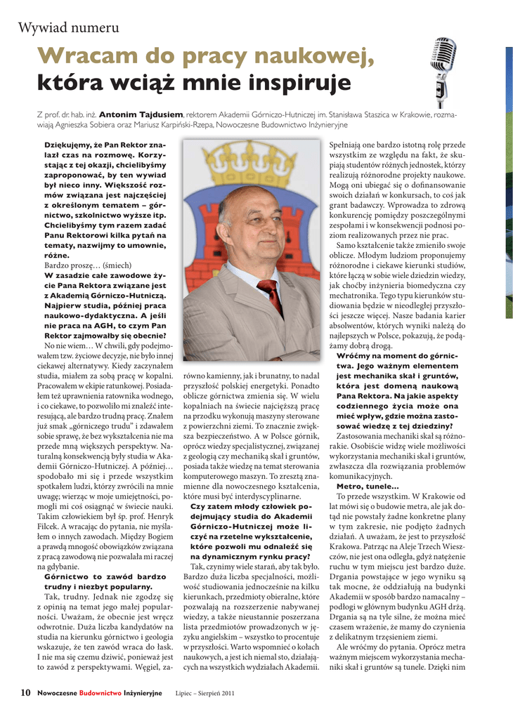Wywiad numeru Wracam do pracy naukowej, która wciąż mnie inspiruje Z prof. dr. hab. inż. Antonim Tajdusiem, rektorem Akademii Górniczo-Hutniczej im. Stanisława Staszica w Krakowie, rozmawiają Agnieszka Sobiera oraz Mariusz Karpiński-Rzepa, Nowoczesne Budownictwo Inżynieryjne Dziękujęmy, że Pan Rektor znalazł czas na rozmowę. Korzystając z tej okazji, chcielibyśmy zaproponować, by ten wywiad był nieco inny. Większość rozmów związana jest najczęściej z określonym tematem – górnictwo, szkolnictwo wyższe itp. Chcielibyśmy tym razem zadać Panu Rektorowi kilka pytań na tematy, nazwijmy to umownie, różne. Spełniają one bardzo istotną rolę przede wszystkim ze względu na fakt, że skupiają studentów różnych jednostek, którzy realizują różnorodne projekty naukowe. Mogą oni ubiegać się o dofinansowanie swoich działań w konkursach, to coś jak grant badawczy. Wprowadza to zdrową konkurencję pomiędzy poszczególnymi zespołami i w konsekwencji podnosi poziom realizowanych przez nie prac. Samo kształcenie także zmieniło swoje oblicze. Młodym ludziom proponujemy różnorodne i ciekawe kierunki studiów, które łączą w sobie wiele dziedzin wiedzy, jak choćby inżynieria biomedyczna czy mechatronika. Tego typu kierunków studiowania będzie w nieodległej przyszłości jeszcze więcej. Nasze badania karier absolwentów, których wyniki należą do najlepszych w Polsce, pokazują, że podążamy dobrą drogą. Bardzo proszę… (śmiech) W zasadzie całe zawodowe życie Pana Rektora związane jest z Akademią Górniczo-Hutniczą. Najpierw studia, później praca naukowo-dydaktyczna. A jeśli nie praca na AGH, to czym Pan Rektor zajmowałby się obecnie? No nie wiem… W chwili, gdy podejmowałem tzw. życiowe decyzje, nie było innej ciekawej alternatywy. Kiedy zaczynałem studia, miałem za sobą pracę w kopalni. Pracowałem w ekipie ratunkowej. Posiadałem też uprawnienia ratownika wodnego, i co ciekawe, to pozwoliło mi znaleźć interesującą, ale bardzo trudną pracę. Znałem już smak „górniczego trudu” i zdawałem sobie sprawę, że bez wykształcenia nie ma przede mną większych perspektyw. Naturalną konsekwencją były studia w Akademii Górniczo-Hutniczej. A później… spodobało mi się i przede wszystkim spotkałem ludzi, którzy zwrócili na mnie uwagę; wierząc w moje umiejętności, pomogli mi coś osiągnąć w świecie nauki. Takim człowiekiem był śp. prof. Henryk Filcek. A wracając do pytania, nie myślałem o innych zawodach. Między Bogiem a prawdą mnogość obowiązków związana z pracą zawodową nie pozwalała mi raczej na gdybanie. Górnictwo to zawód bardzo trudny i niezbyt popularny. Tak, trudny. Jednak nie zgodzę się z opinią na temat jego małej popularności. Uważam, że obecnie jest wręcz odwrotnie. Duża liczba kandydatów na studia na kierunku górnictwo i geologia wskazuje, że ten zawód wraca do łask. I nie ma się czemu dziwić, ponieważ jest to zawód z perspektywami. Węgiel, za- 10 Nowoczesne Budownictwo Inżynieryjne równo kamienny, jak i brunatny, to nadal przyszłość polskiej energetyki. Ponadto oblicze górnictwa zmienia się. W wielu kopalniach na świecie najcięższą pracę na przodku wykonują maszyny sterowane z powierzchni ziemi. To znacznie zwiększa bezpieczeństwo. A w Polsce górnik, oprócz wiedzy specjalistycznej, związanej z geologią czy mechaniką skał i gruntów, posiada także wiedzę na temat sterowania komputerowego maszyn. To zresztą znamienne dla nowoczesnego kształcenia, które musi być interdyscyplinarne. Czy zatem młody człowiek podejmujący studia do Akademii Górniczo-Hutniczej może liczyć na rzetelne wykształcenie, które pozwoli mu odnaleźć się na dynamicznym rynku pracy? Tak, czynimy wiele starań, aby tak było. Bardzo duża liczba specjalności, możliwość studiowania jednocześnie na kilku kierunkach, przedmioty obieralne, które pozwalają na rozszerzenie nabywanej wiedzy, a także nieustannie poszerzana lista przedmiotów prowadzonych w języku angielskim – wszystko to procentuje w przyszłości. Warto wspomnieć o kołach naukowych, a jest ich niemal sto, działających na wszystkich wydziałach Akademii. Lipiec – Sierpień 2011 Wróćmy na moment do górnictwa. Jego ważnym elementem jest mechanika skał i gruntów, która jest domeną naukową Pana Rektora. Na jakie aspekty codziennego życia może ona mieć wpływ, gdzie można zastosować wiedzę z tej dziedziny? Zastosowania mechaniki skał są różnorakie. Osobiście widzę wiele możliwości wykorzystania mechaniki skał i gruntów, zwłaszcza dla rozwiązania problemów komunikacyjnych. Metro, tunele… To przede wszystkim. W Krakowie od lat mówi się o budowie metra, ale jak dotąd nie powstały żadne konkretne plany w tym zakresie, nie podjęto żadnych działań. A uważam, że jest to przyszłość Krakowa. Patrząc na Aleje Trzech Wieszczów, nie jest ona odległa, gdyż natężenie ruchu w tym miejscu jest bardzo duże. Drgania powstające w jego wyniku są tak mocne, że oddziałują na budynki Akademii w sposób bardzo namacalny – podłogi w głównym budynku AGH drżą. Drgania są na tyle silne, że można mieć czasem wrażenie, że mamy do czynienia z delikatnym trzęsieniem ziemi. Ale wróćmy do pytania. Oprócz metra ważnym miejscem wykorzystania mechaniki skał i gruntów są tunele. Dzięki nim Wywiad numeru Wizualizacja Akademickiego Centrum Materiałów i Nanotechnologii AGH można rozwiązać problemy choćby z modernizacją zakopianki. Przypuszczam, że kwoty, które przeznaczy się na wykupienie działek od prywatnych właścicieli, umożliwiłyby na sfinansowanie budowy tuneli w jej najbardziej newralgicznych punktach. Oczywiście, zarówno metro, jak i tunele to inwestycje kosztowne, ale w nieodległej perspektywie nie będzie innej alternatywy. A potencjał wiedzy, jaki mamy obecnie w AGH, oraz możliwości techniczne, którym 