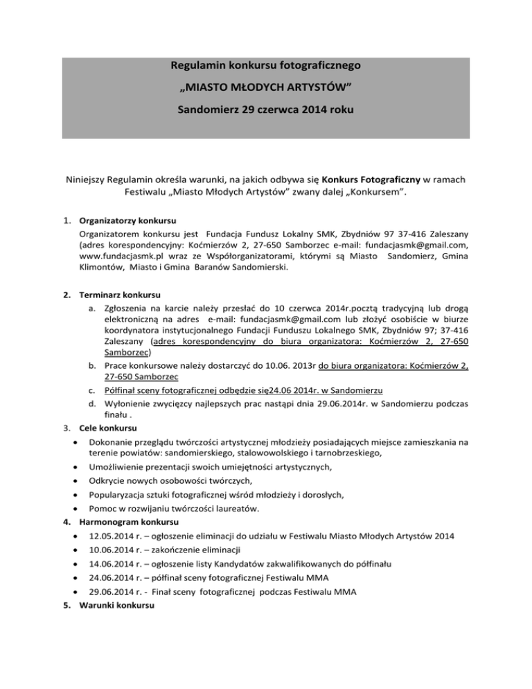 Regulamin konkursu fotograficznego „MIASTO MŁODYCH ARTYSTÓW” Sandomierz 29 czerwca 2014 roku Niniejszy Regulamin określa warunki, na jakich odbywa się Konkurs Fotograficzny w ramach Festiwalu „Miasto Młodych Artystów” zwany dalej „Konkursem”. 1. Organizatorzy konkursu Organizatorem konkursu jest Fundacja Fundusz Lokalny SMK, Zbydniów 97 37-416 Zaleszany (adres korespondencyjny: Kodmierzów 2, 27-650 Samborzec e-mail: [email protected], www.fundacjasmk.pl wraz ze Współorganizatorami, którymi są Miasto Sandomierz, Gmina Klimontów, Miasto i Gmina Baranów Sandomierski. 2. Terminarz konkursu a. Zgłoszenia na karcie należy przesład do 10 czerwca 2014r.pocztą tradycyjną lub drogą elektroniczną na adres e-mail: [email protected] lub złożyd osobiście w biurze koordynatora instytucjonalnego Fundacji Funduszu Lokalnego SMK, Zbydniów 97; 37-416 Zaleszany (adres korespondencyjny do biura organizatora: Kodmierzów 2, 27-650 Samborzec) b. Prace konkursowe należy dostarczyd do 10.06. 2013r do biura organizatora: Kodmierzów 2, 27-650 Samborzec c. Półfinał sceny fotograficznej odbędzie się24.06 2014r. w Sandomierzu d. Wyłonienie zwycięzcy najlepszych prac nastąpi dnia 29.06.2014r. w Sandomierzu podczas finału . 3. Cele konkursu Dokonanie przeglądu twórczości artystycznej młodzieży posiadających miejsce zamieszkania na terenie powiatów: sandomierskiego, stalowowolskiego i tarnobrzeskiego, Umożliwienie prezentacji swoich umiejętności artystycznych, Odkrycie nowych osobowości twórczych, Popularyzacja sztuki fotograficznej wśród młodzieży i dorosłych, Pomoc w rozwijaniu twórczości laureatów. 4. Harmonogram konkursu 12.05.2014 r. – ogłoszenie eliminacji do udziału w Festiwalu Miasto Młodych Artystów 2014 10.06.2014 r. – zakooczenie eliminacji 14.06.2014 r. – ogłoszenie listy Kandydatów zakwalifikowanych do półfinału 24.06.2014 r. – półfinał sceny fotograficznej Festiwalu MMA 29.06.2014 r. - Finał sceny fotograficznej podczas Festiwalu MMA 5. Warunki konkursu a. Konkurs skierowany jest do uczestników mieszczących się w przedziale wiekowym 13-25 lat mieszkających na terenie powiatu sandomierskiego, tarnobrzeskiego i stalowowolskiego, b. Każdy Kandydat przedstawia link na jeden krótki film (2-4 min) lub prezentację multimedialną (15-20 slajdów) zamieszczoną na dowolnym portalu społecznościom (Facebook, You Tube, etc.). Prezentacja przedstawia artystę i jego pasję np. wydarzenia artystyczne z jego udziałem, artysta i jego warsztat pracy, multimedialna prezentacja innych prac, etc) c. Każdy kandydat, zamierzający ubiegad się o główną nagrodę – stypendium artystyczne w kwocie 3.500,00 złotych składa wniosek (wzór - załącznik nr 2) d. Jeden autor może przesład maksymalnie 5 fotografii w formacie 24 x 30cm e. Na odwrocie fotografii należy umieścid: imię i nazwisko, wiek, adres, nr kontaktowy autora, oraz tytuł wykonanej pracy f. W przypadku dużej ilości zgłoszonych uczestników, zostaną przeprowadzone wstępne eliminacje, by wyłonid 20 autorów najlepszych prac do prezentacji przy scenie festiwalowej. Po ocenie i wyborze najlepszych prac uczestnicy zostaną powiadomieni osobiście; g. Każdy uczestnik, po zakwalifikowaniu się do sceny festiwalowej ma obowiązek w ciągu 3 dni dostarczyd krótką notatkę promo (do połowy A4) o swoich dotychczasowych artystycznych dokonaniach oraz pakiet/portfolio 1-3 zdjęd (ewentualnie malarstwa dla sceny malarskiej lub wiersz dla sceny literackiej) h. Nominowani do sceny fotograficznej uczestniczą w plenerze fotograficznym dn. 24.06. br na rynku Starego Miasta w Sandomierzu Uwaga! Uczestnicy zapewniają sobie wszystkie materiały niezbędne do pracy. Uczestnikom pleneru organizatorzy zapewniają opiekę artystyczną. . 6. Kryteria oceny Oceny nadesłanych prac konkursowych dokona komisja konkursowa powołana przez organizatora imprezy. Prace zostaną poddane ocenie według poniższych kryteriów: Etap I – Eliminacje do grona Laureatów FMMA o Temat i treśd dzieła, o Ogólny wyraz artystyczny, Etap II – Półfinał – Grant Rozwojowy Zgodnośd nadesłanych prac z regulaminem Konkursu; Temat prac; Inwencja twórcza wykonującego; Umiejętności fotograficzne; Etap III – Finał, Stypendia Artystyczne o Ogólna ocena twórczości, o Ocena predyspozycji i potencjału Laureata na tle innych artystów, Przedstawiony plan wykorzystania stypendium artystycznego 7. Nagrody a. Laureat konkursu sceny fotograficznej otrzymuje Artystyczny Grant Rozwojowy w kwocie 1 tys. PLN, b. Każdy uczestnik finału konkursu fotograficznego 29 czerwca br. otrzyma dyplom laureata II Festiwalu Miasto Młodych Artystów, c. Wybrane prace laureatów zostaną zamieszczone w katalogu i/lub filmie pofestiwalowym oraz na oficjalnym portalu festiwalowym www.miastomlodychartystow.pl; d. Ponadto wśród laureatów 7 scen artystycznych konkursu teatralnego, muzycznego, plastycznego, fotograficznego, literackiego, tanecznego, filmowego zostaną przyznane 3 stypendia artystyczne w kwocie od 3.000,00 do 3.500,00 PLN. e. Jeden laureat może otrzymad max. jeden grant rozwojowy. W przypadku otrzymania stypendium artystycznego grant rozwojowy zalicza się na poczet Stypendium. f. Wśród laureatów wszystkich scen artystycznych, którzy nie otrzymali Artystycznego Grantu czy Stypendium Rozwojowego zostaną rozlosowane 3 nagrody finansowe, każda w kwocie 500 PLN. Uwaga: stypendia mogą dotyczyd jedynie osoby fizycznej co oznacza, iż w przypadku laureatów – grup artystycznych stypendium może otrzymad wiodący artysta. Dotyczy to takich scen artystycznych jak: teatr, taniec, muzyka. 8. Ustalenia końcowe a. Organizator nie bierze odpowiedzialności za ewentualne uszkodzenia przesyłek nadesłanych drogą pocztową oraz nie ponosi kosztów transportu prac. b. Prace zbiorowe będą wykluczane z Konkursu. c. Udział w konkursie jest równoznaczny z wyrażeniem zgody na przetwarzanie danych o