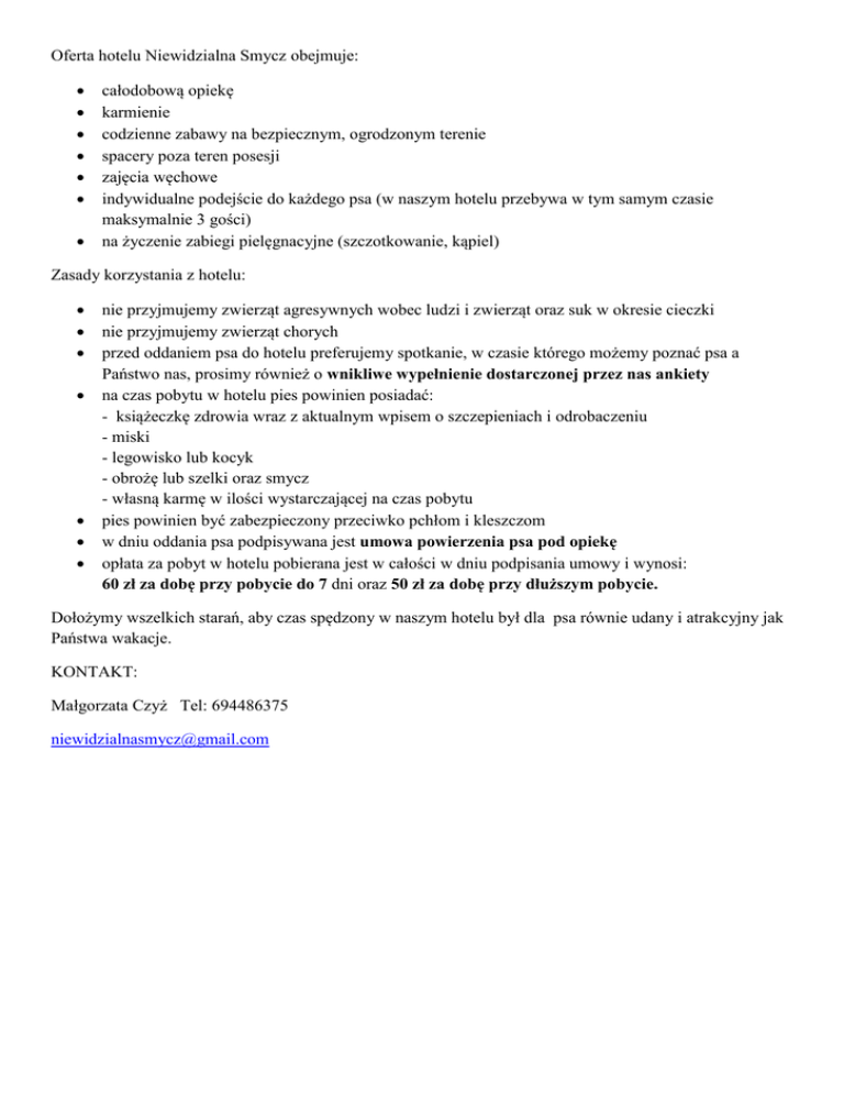 Oferta hotelu Niewidzialna Smycz obejmuje: całodobową opiekę karmienie codzienne zabawy na bezpiecznym, ogrodzonym terenie spacery poza teren posesji zajęcia węchowe indywidualne podejście do każdego psa (w naszym hotelu przebywa w tym samym czasie maksymalnie 3 gości) na życzenie zabiegi pielęgnacyjne (szczotkowanie, kąpiel) Zasady korzystania z hotelu: nie przyjmujemy zwierząt agresywnych wobec ludzi i zwierząt oraz suk w okresie cieczki nie przyjmujemy zwierząt chorych przed oddaniem psa do hotelu preferujemy spotkanie, w czasie którego możemy poznać psa a Państwo nas, prosimy również o wnikliwe wypełnienie dostarczonej przez nas ankiety na czas pobytu w hotelu pies powinien posiadać: - książeczkę zdrowia wraz z aktualnym wpisem o szczepieniach i odrobaczeniu - miski - legowisko lub kocyk - obrożę lub szelki oraz smycz - własną karmę w ilości wystarczającej na czas pobytu pies powinien być zabezpieczony przeciwko pchłom i kleszczom w dniu oddania psa podpisywana jest umowa powierzenia psa pod opiekę opłata za pobyt w hotelu pobierana jest w całości w dniu podpisania umowy i wynosi: 60 zł za dobę przy pobycie do 7 dni oraz 50 zł za dobę przy dłuższym pobycie. Dołożymy wszelkich starań, aby czas spędzony w naszym hotelu był dla psa równie udany i atrakcyjny jak Państwa wakacje. KONTAKT: Małgorzata Czyż Tel: 694486375 [email protected]