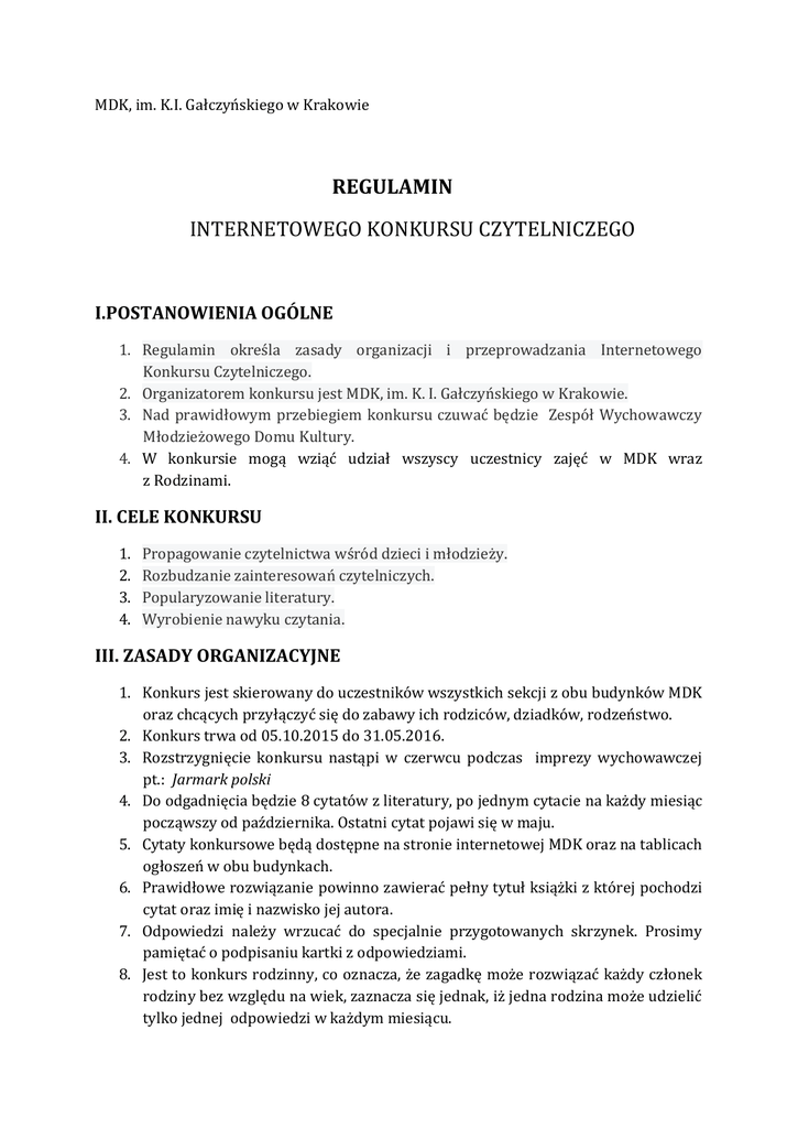 MDK, im. K.I. Gałczyńskiego w Krakowie REGULAMIN INTERNETOWEGO KONKURSU CZYTELNICZEGO I.POSTANOWIENIA OGÓLNE 1. Regulamin określa zasady organizacji i przeprowadzania Internetowego Konkursu Czytelniczego. 2. Organizatorem konkursu jest MDK, im. K. I. Gałczyńskiego w Krakowie. 3. Nad prawidłowym przebiegiem konkursu czuwać będzie Zespół Wychowawczy Młodzieżowego Domu Kultury. 4. W konkursie mogą wziąć udział wszyscy uczestnicy zajęć w MDK wraz z Rodzinami. II. CELE KONKURSU 1. 2. 3. 4. Propagowanie czytelnictwa wśród dzieci i młodzieży. Rozbudzanie zainteresowań czytelniczych. Popularyzowanie literatury. Wyrobienie nawyku czytania. III. ZASADY ORGANIZACYJNE 1. Konkurs jest skierowany do uczestników wszystkich sekcji z obu budynków MDK oraz chcących przyłączyć się do zabawy ich rodziców, dziadków, rodzeństwo. 2. Konkurs trwa od 05.10.2015 do 31.05.2016. 3. Rozstrzygnięcie konkursu nastąpi w czerwcu podczas imprezy wychowawczej pt.: Jarmark polski 4. Do odgadnięcia będzie 8 cytatów z literatury, po jednym cytacie na każdy miesiąc począwszy od października. Ostatni cytat pojawi się w maju. 5. Cytaty konkursowe będą dostępne na stronie internetowej MDK oraz na tablicach ogłoszeń w obu budynkach. 6. Prawidłowe rozwiązanie powinno zawierać pełny tytuł książki z której pochodzi cytat oraz imię i nazwisko jej autora. 7. Odpowiedzi należy wrzucać do specjalnie przygotowanych skrzynek. Prosimy pamiętać o podpisaniu kartki z odpowiedziami. 8. Jest to konkurs rodzinny, co oznacza, że zagadkę może rozwiązać każdy członek rodziny bez względu na wiek, zaznacza się jednak, iż jedna rodzina może udzielić tylko jednej odpowiedzi w każdym miesiącu. 9. Każdy z cytatów dostępny będzie tylko przez jeden miesiąc, co oznacza, że rozwiązania zagadki październikowej wrzucamy do skrzynek do końca października. Rozwiązania zagadki listopadowej do końca listopada itd. Po upływie miesiąca cytaty nie będą dostępne. 10. Maksymalna ilość punktów do zdobycie to 8. 11. Zwycięzcą zostanie osoba/rodzina, która uzyska największą ilość punktów. IV. POSTANOWIENIA KOŃCOWE 1. Regulamin dostępny będzie na stronie internetowej MDK przez cały czas trwania konkursu. 2. Organizator zastrzega sobie prawo do zmian w Regulaminie w razie wystąpienia przyczyn od niego niezależnych. 3. Wszelkie kwestie sporne dotyczące Regulaminu rozstrzyga Organizator.