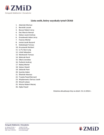 Lista osób, który uzyskały tytuł CIIA® 1. 2. 3. 4. 5. 6. 7. 8. 9. 10. 11. 12. 13. 14. 15. 16. 17. 18. 19. 20. 21. 22. 23. 24. 25. 26. Adamiak Mariusz Barański Leszek Boczar Robert Jerzy Dec Marcin Henryk Dekarz Jacek Andrzej Drozdowski Adam Jerzy Ficenes Michał Janiuk Jacek Ryszard Kołodziejak Tomasz Kruszewski Norbert Le Tu Quo Lung Liński Sebastian Markowski Tomasz Matczak Karol Obara Jarosław Puślecki Andrzej Rabiej Michał Sukacz Dawid Szklarski Piotr Szymko Adam Śliwiński Mariusz Trzaska Paweł Bernard Wojdanowicz Dariusz Jacek Wosch Łukasz Woźny Robert Maciej Zięba Paweł Ostatnia aktualizacja listy na dzień: 31.12.2016 r.