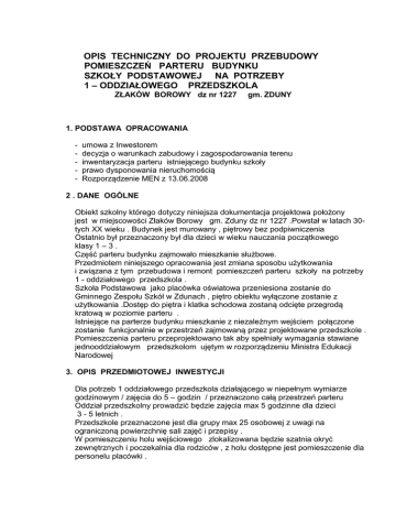 OPIS TECHNICZNY DO PROJEKTU PRZEBUDOWY POMIESZCZEŃ PARTERU BUDYNKU SZKOŁY PODSTAWOWEJ NA POTRZEBY 1 – ODDZIAŁOWEGO PRZEDSZKOLA ZŁAKÓW BOROWY dz nr 1227 gm. ZDUNY 1. PODSTAWA OPRACOWANIA - umowa z Inwestorem decyzja o warunkach zabudowy i zagospodarowania terenu inwentaryzacja parteru istniejącego budynku szkoły prawo dysponowania nieruchomością Rozporządzenie MEN z 13.06.2008 2 . DANE OGÓLNE Obiekt szkolny którego dotyczy niniejsza dokumentacja projektowa położony jest w miejscowości Złaków Borowy gm. Zduny dz nr 1227 .Powstał w latach 30tych XX wieku . Budynek jest murowany , piętrowy bez podpiwniczenia Ostatnio był przeznaczony był dla dzieci w wieku nauczania początkowego klasy 1 – 3 . Część parteru budynku zajmowało mieszkanie służbowe. Przedmiotem niniejszego opracowania jest zmiana sposobu użytkowania i związana z tym przebudowa i remont pomieszczeń parteru szkoły na potrzeby 1 - oddziałowego przedszkola . Szkoła Podstawowa jako placówka oświatowa przeniesiona zostanie do Gminnego Zespołu Szkół w Zdunach , piętro obiektu wyłączone zostanie z użytkowania .Dostęp do piętra i klatka schodowa zostaną odcięte przegrodą kratową w poziomie parteru . Istniejące na parterze budynku mieszkanie z niezależnym wejściem połączone zostanie funkcjonalnie w przestrzeń zajmowaną przez projektowane przedszkole . Pomieszczenia parteru przeprojektowano tak aby spełniały wymagania stawiane jednooddziałowym przedszkolom ujętym w rozporządzeniu Ministra Edukacji Narodowej 3. OPIS PRZEDMIOTOWEJ INWESTYCJI Dla potrzeb 1 oddziałowego przedszkola działającego w niepełnym wymiarze godzinowym / zajęcia do 5 – godzin / przeznaczono całą przestrzeń parteru Oddział przedszkolny prowadzić będzie zajęcia max 5 godzinne dla dzieci 3 - 5 letnich . Przedszkole przeznaczone jest dla grupy max 25 osobowej z uwagi na ograniczoną powierzchnię sali zajęć i przepisy . W pomieszczeniu holu wejściowego zlokalizowana będzie szatnia okryć zewnętrznych i poczekalnia dla rodziców , z holu dostępne jest pomieszczenie dla personelu placówki . Na terenie pomieszczeń przeznaczonych dla oddziału przedszkolnego zaprojektowano niezbędne pomieszczenia sanitarne , zaplecze kuchenne i pomieszczenia pomocnicze magazynowe . Dla dzieci zapewniono salę zabaw i dostępne z niej sanitariaty . Zaprojektowano niewielką kuchenkę zapewniająca podawanie ciepłego posiłku dostarczanego do placówki na zasadach cateringu . Z sali zapewniono również dostęp do małego zaplecza magazynowego służącego do przechowywania pomocy i sprzętu wykorzystywanego podczas zajęć W celu dostosowania pomieszczeń do nowych potrzeb niezbędne jest wykonanie prac budowlanych takich jak : - wyburzenie części zbędnych ścian oznakowanych na rysunku wyburzeń - zerwanie starych posadzek drewnianych i wykonanie nowych na podłożu betonowym z ociepleniem ze styropianu - wykonanie nowych podziałów pomieszczeń z zastosowaniem płyt G - K i częściowo ścian murowanych . - naprawa i uzupełnienie tynków ściennych we wszystkich pomieszczeniach - osadzenie nowych drzwi do projektowanych pomieszczeń - wykonanie drzwi zewnętrznych , ewakuacyjnych z sali zajęć - osadzenie nowego dodatkowego okna w pomieszczeniu projektowanej kuchni - rozprowadzenie nowych instalacji elektrycznych oświetleniowych zasadniczych i awaryjnych i gniazd wtykowych - doprowadzenie wody i odbioru ścieków z nowych pomieszczeń sanitarnych i zaplecza kuchennego 4. OPIS PRAC BUDOWLANYCH Na rysunku nr 2 w części budowlanej oznakowano niezbędne wyburzenia Z uwagi na położenie parteru około 50 cm npp zaprojektowano nowe , zewnętrzne schody wyposażone w balustrady i dostosowane wysokościowo dla małych dzieci Obok wejścia głównego zaprojektowano pochylnię umożliwiającą dostęp osobom z ograniczeniami ruchowymi . Ścianki działowe dla uzyskania nowych pomieszczeń kuchennych i pomieszczeń sanitarnych należy wykonać zgodnie z usytuowaniem podanym na rzucie parteru . W nowych ściankach należy osadzić nowe drzwi do pomieszczeń o szerokościach wykazanych na rysunku . Drzwi wewnętrzne płycinowe białe z ościeżnicami drewnianymi . Drzwi do sanitariatów z szybą bezpieczną . Kabiny sanitarne należy oddzielić ścianką z płyty GHL o grubości około 18 mm. Drzwi kabin typu ,, kowbojki ,,o wysokości 140 cm Pomieszczenia sanitarne dla dzieci należy wyposażyć w urządzenia sanitarne dostosowane dla potrzeb dzieci . Woda ciepła z instalacji z mieszaczem Ze względów higienicznych w pomieszczeniu należy zamontować dozowniki mydła i ręczników jednorazowych . Drzwi wejściowe zewnętrzne i wewnętrzne wiatrołapu zaprojektowano z aluminium Drzwi zewnętrzne z szybami zespolonymi , bezpiecznymi i panelami ciepłymi , wyposażyć należy w szczotkę dolną . Wszystkie pomieszczenia należy podłączyć do kanałów wentylacyjnych istniejących kominów według oznakowań na rysunku rzutu . Na kanałach wentylacyjnych umywalni , kuchenki i zmywalni i pom. porządkowego należy osadzić wentylatorki kanałowe sprzężone z oświetleniem pomieszczeń . 5. ZAKRES DZIALNOŚCI PRZEDSZKOLA Projektowane 1- oddziałowe przedszkole prowadzić będzie zajęcia dydaktyczne dla dzieci w wieku 3-5 lat . Oddział działać będzie w niepełnym wymiarze godzin / zajęcia 5 godzinne / Z uwagi na wielkość pomieszczeń przewidywana grupa 25 dzieci + dwie osoby personelu . Zajęcia dydaktyczno - zabawowe prowadzone będą na 2 salach zajęć połączonych ze sobą . Wygrodzenie w postaci drzwi przesuwnych daje możliwość organizowania zajęć w podgrupach wiekowych . Dla potrzeb zajęć ruchowych na zewnątrz istnieje możliwość zorganizowania placu zabaw . Z uwagi na niepełny wymiar godzin pracy w oddziale nie będą przygotowywane posiłki . Dzieci otrzymywać będą potrawy dostarczane z zewnątrz na zasadach cateringu . Dostawy do kuchni odbywać się będą poprzez wydzielone wej