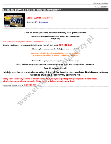 Informacje o produkcie Utworzono 08-03-2017 Lizaki na patyku pingwin, kwiatki, emotikony Cena : 3,80 zł (netto: 3,09 zł) Dostępność : Dostępny Lizak na patyku pingwiny, kwiatki emotikony. Cała gama kształtów Lizaki sprzedajemy w specjalnych kartonach --ekspozytorach ---po 25 szt. Kuźnia Lizaków --- ręczna produkcja lizaków Poznań tel. + 48 rz y. pl Słodki lizak w kształcie radosnej buźki, patyk drewniany Waga 50g 602 248 265 ki et yd la pi ek a Lizaki wykonujemy ręcznie. Pakujemy w woreczki PP Dodatkowo lizaki charakteryzują się pysznym smakiem, a to nie zawsze idzie w parze z ładnym wyglądem! Doskonałe na przyjęcia, eventy, imprezy i inne okazje Lizaki świetni wyglądają, pięknie prezentują się na żywo, kuszą zapachem i smakiem. Cena KP dotyczy 1 sztuki Istnieje możliwość zamówienia różnych kształtów lizaków oraz smaków. Dodatkowo możemy wykonać etykietę z logo firmy, sponsora itd. Każdy lizak pakowany osobno w przeźroczystą folię, zamykany profesjonalną zamykarką z mozliwością wielokrotnego zamykania woreczka ( jako jedyni w Polsce tak pakujemy lizaki) ty 602 248 265 w w w .e Zamówienia, pytania tel. + 48