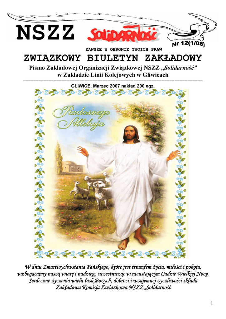 NSZZ ZAWSZE W OBRONIE TWOICH PRAW ZWIĄZKOWY BIULETYN ZAKŁADOWY Pismo Zakładowej Organizacji Związkowej NSZZ „Solidarność” w Zakładzie Linii Kolejowych w Gliwicach ====================================================================== GLIWICE, Marzec 2007 nakład 200 egz. W dniu Zmartwychwstania Pańskiego, które jest triumfem życia, miłości i pokoju, wzbogacajmy naszą wiarę i nadzieję, uczestnicząc w nieustającym Cudzie Wielkiej Nocy. Serdeczne życzenia wielu łask Bożych, dobroci i wzajemnej życzliwości składa Zakładowa Komisja Związkowa NSZZ „Solidarność 1 Podwyżki płac na zakładzie Od 01 lutego 2008r. w naszym zakładzie zostały wprowadzone podwyżki płac w wysokości średnio 220 zł do uposażenia zasadniczego na jeden etat. Są do największe podwyżki, jakie miały miejsce na PKP. Należy tutaj podkreślić, iż szczególnym osiągnięciem związków zawodowych jest wywalczony w naszym Zakładzie próg najniższej podwyżki 200 zł w uposażeniu zasadniczym (z wyłączeniem nielicznych przypadków). Maksymalna wysokość podwyżki została ustalona to 250 zł w uposażeniu zasadniczym a w szczególnych uzasadnionych przypadkach 275 zł w uposażeniu zasadniczym. Wdrożona podwyżka daje wzrost wynagrodzeń w PKP PLK na poziomie 21,27%. Kulisy negocjacji podwyżek płac w PKP PLK S.A. Celem Związku Zawodowego NSZZ „Solidarność” jest osiągniecie w tym roku jak największych podwyżek dla naszych pracowników. Niestety droga dojścia do tego celu podzieliła związki zawodowe w PKP PLK S.A. W negocjacjach płacowych odbywających się dnia 25.02.2008r. Związek Pracodawców Kolejowych zgodził się na wprowadzenie podwyżki od 01-go lutego 2008r. w wysokości 220 zł w trzech spółkach grupy PKP tj. Polskich Liniach Kolejowych, Cargo i Przewozach Regionalnych. Była to maksymalna kwota, jaką można było wynegocjować w sposób ugodowy (bez akcji strajkowej). Przewodniczący SKK NSZZ „Solidarność” oraz przewodniczący prawie wszystkich central związkowych w grupie PKP podpisali porozumienie wdrażające podwyżkę od pierwszego lutego w wynegocjowanej kwocie. Decyzję podjęto biorąc pod uwagę: wielkość osiągniętej kwoty, zagrożenie dalszego przeciągania się negocjacji a co za tym idzie znacznego opóźnienia akcji podwyżkowej, groźbą wycofania złożonej przez pracodawcę oferty podwyżki płac, gdy akcja strajkowa przyniesie straty dla spółek grupy PKP. W porozumieniu zapisano, że kolejne rozmowy na temat wzrostu wynagrodzeń odbędą się do dnia 20 lipca 2007r. Porozumienia nie podpisały jedynie centrale związkowe zrzeszone w Konfederacji Kolejowych Związków Zawodowych (Związek Zawodowy Maszynistów, Związek Zawodowy Dyżurnych Ruchu PKP, Związek Zawodowy Dyspozytorów, Związek Zawodowy Drużyn Konduktorskich). Konfederacja pod przewodnictwem Prezydenta Związku Zawodowego Maszynistów Leszka Miętka ogłosiła na 6 marca strajk ostrzegawczy i rozpoczęcie referendum strajkowego. Jednakże na ostatnich rozmowach 04.03.2008r. z ministrem Grabarczykiem nic nie uzyskali a na dodatek wycofali się z strajku ostrzegawczego. Ponadto PKP podważyła legalność prowadzonego referendum, ponieważ spór zbiorowy prowadzony jest o sprawy płacowe a w referendum pytanie numer 2 dotyczy w ogóle czegoś innego. Dlaczego konfederacja nie podpisała porozumienia podwyżkowego? Dlatego że nie chciał tego prezydent maszynistów Leszek Miętek. Dla maszynistów ważniejsze od podwyżek jest teraz to, aby ich nie rozdzielono pomiędzy spółkami przewozowymi, świadczy o tym drugie pytanie w referendum i to jest głównym celem prowadzonej obecnie przez nich akcji strajkowej. Maszyniści nadal chcą być wszyscy w Cargo i utrzymać raz zdobyte przywileje oraz status najlepiej zarabiającej grupy zawodowej na PKP. Niezmiernie się też cieszą, że znalazły się związki zawodowe, którymi będą za nich o to walczyć a oni będą nimi sterować. Prezydent Leszek Miętek doskonale wie, że strajk najłatwiej i najlepiej wykonać przy pomocy dyżurnych ruchu, bo wtedy uderzy to w Polskie Linie Kolejowe a nie w PKP Cargo. PLK musi płacić karę umowną w wysokości 8 zł za każdą minutę opóźnienia pociągu, który został rozkładowo uruchomiony przez przewoźnika. Gdyby dyżurni ruchu zatrzymali pociągi PLK musiałaby dla Cargo zapłacić ogromne odszkodowanie. Sytuacja finansowa PLK by się drastycznie pogorszyła a Cargo otrzymałoby duże pieniądze z kar umownych. Wszyscy doskonale zdajemy sobie sprawę, że wysokość tegorocznych podwyżek w dużej mierze zależy od możliwości finansowych spółki i dziwi nas bardzo, że niektóre związki zawodowe w PLK walczą o interesy obcych spółek naszym kosztem. Związek Zawodowy Dyżurnych Ruchu zamiast wraz z innymi związkami w naszej spółce stanąć do jednolitego frontu w walce o płace dla naszych 2 pracowników daje się prowadzać na pasku maszynistom. Jeśli związek ZZDR uważa, że jest tak silny i prężny to niech pokaże i wywalczy, choć złotówkę dla naszych pracowników (nie dla maszynistów z Cargo) przed lipcowymi rozmowami pozostałych central zawodowych z pracodawcą. Na razie jedynie, co potrafią to opluwać wszystkich tych, co wywalczyli obecne podwyżki. Brudne zagrywki W związku z tym, iż osiągnięte porozumienie płacowe jest w głównej mierze zasługą przewodniczącego SKK H. Grymla spadły na jego osobę ataki pozostałych działaczy związkowych. Ponadto w miesiącu lutym członkowie prezydium SKK zostali powołani do rad nadzorczych w spółkach PKP Cargo Wagon oraz PKP Intercity zgodnie z przyjętą zasadą, że w radach nadzorczych zasiadają przedstawiciele załogi. Każdy liczący się związek zawodowy ma swoich przedstawicieli w radach nadzorczych, aby mieć nadzór nad działalnością spółek. Prezydent maszynistów Leszek Miętek i jego poplecznicy z ZZDR z zazdrości, że sami niczego nie osiągnęli, zaczęli nisz
