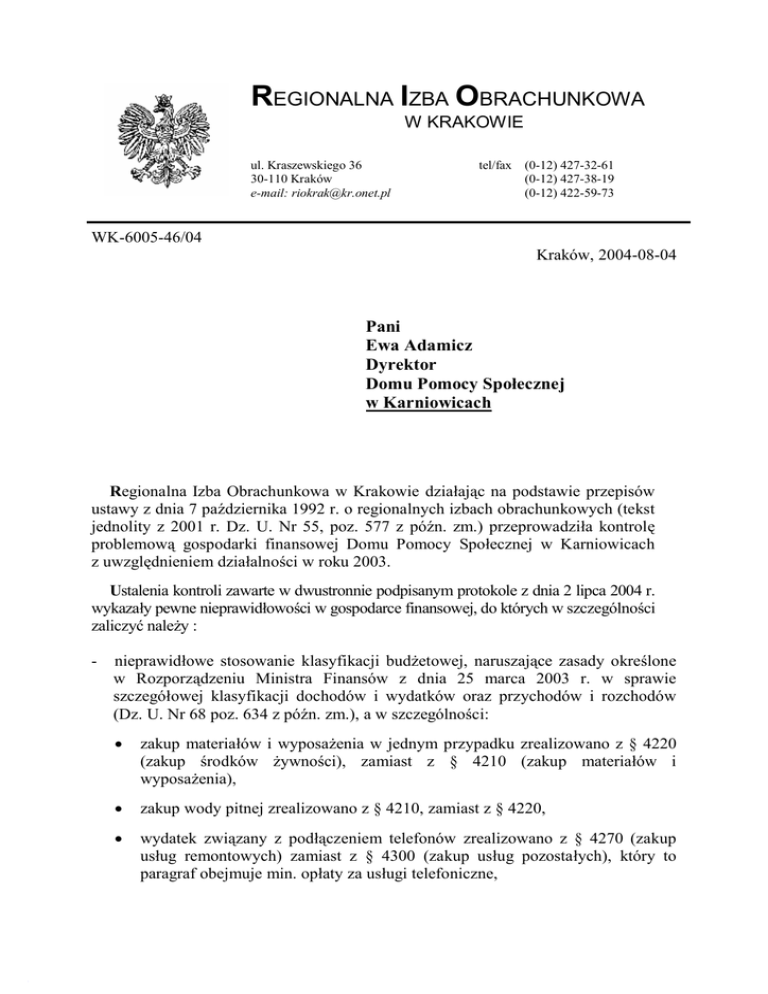 REGIONALNA IZBA OBRACHUNKOWA W KRAKOWIE ul. Kraszewskiego 36 30-110 Kraków e-mail: [email protected] tel/fax (0-12) 427-32-61 (0-12) 427-38-19 (0-12) 422-59-73 WK-6005-46/04 Kraków, 2004-08-04 Pani Ewa Adamicz Dyrektor Domu Pomocy Społecznej w Karniowicach Regionalna Izba Obrachunkowa w Krakowie działając na podstawie przepisów ustawy z dnia 7 października 1992 r. o regionalnych izbach obrachunkowych (tekst jednolity z 2001 r. Dz. U. Nr 55, poz. 577 z późn. zm.) przeprowadziła kontrolę problemową gospodarki finansowej Domu Pomocy Społecznej w Karniowicach z uwzględnieniem działalności w roku 2003. Ustalenia kontroli zawarte w dwustronnie podpisanym protokole z dnia 2 lipca 2004 r. wykazały pewne nieprawidłowości w gospodarce finansowej, do których w szczególności zaliczyć należy : - nieprawidłowe stosowanie klasyfikacji budżetowej, naruszające zasady określone w Rozporządzeniu Ministra Finansów z dnia 25 marca 2003 r. w sprawie szczegółowej klasyfikacji dochodów i wydatków oraz przychodów i rozchodów (Dz. U. Nr 68 poz. 634 z późn. zm.), a w szczególności: • zakup materiałów i wyposażenia w jednym przypadku zrealizowano z § 4220 (zakup środków żywności), zamiast z § 4210 (zakup materiałów i wyposażenia), • zakup wody pitnej zrealizowano z § 4210, zamiast z § 4220, • wydatek związany z podłączeniem telefonów zrealizowano z § 4270 (zakup usług remontowych) zamiast z § 4300 (zakup usług pozostałych), który to paragraf obejmuje min. opłaty za usługi telefoniczne, • - zakup materiałów, wyposażenia i żywności, zrealizowany na podstawie jednej faktury zaklasyfikowano w całości § 4210, nieprzestrzeganie obowiązujących wewnętrznych, polegające na: w kontrolowanej jednostce uregulowań • nieprowadzeniu ewidencji kart drogowych, co narusza postanowienia Instrukcji ewidencji druków ścisłego zarachowania, • nierespektowaniu postanowień Zarządzenia Nr 4/2001 Dyrektora DPS w sprawie zasad odpłatności za pobyt czasowy, odnośnie wysokości stawki za jeden dzień pobytu w DPS, - realizowanie wydatków w kasie na podstawie dowodów nie sprawdzonych pod względem merytorycznym, formalnym lub rachunkowym i nie zatwierdzonych do wypłaty, co narusza postanowienia Instrukcji kasowej, - dokonywanie zapisów w księgach rachunkowych na podstawie dowodów niespełniających wymagań art. 21 i art. 22 ustawy z dnia 29 września 1994 r. o rachunkowości (Dz. U. Nr 121 poz. 591 z późn. zm.), w szczególności poprzez: • błędne wskazanie sposobu ujęcia dowodu w księgach rachunkowych – dotyczy to faktur wystawionych z tytułu zakupu materiałów, wyposażenia i żywności, • brak dekretacji na dowodzie księgowym, - nanoszenie poprawek na dowodach księgowych w sposób niezgodny z art. 25 ust. 1 pkt 1 ustawy o rachunkowości, tj. przez zamalowywanie błędnych zapisów korektorem lub długopisem, - nieterminowe przekazywanie środków na rachunek zakładowego funduszu świadczeń socjalnych, naruszające postanowienia ustawy z dnia 04 marca 1994 r. o zakładowym funduszu świadczeń socjalnych (tekst jednolity: Dz. U. z 1996 r. Nr 70 poz. 335 z późn. zm.). Do dnia 30 września 2003 r. nieprzelano całości rocznego odpisu na ZFŚS, co jest wymagane przez art. 6 ust. 2 ww. ustawy, - wypłata w 2003 r. ryczałtu za jazdy lokalne w zaniżonej wysokości, na skutek zastosowania innej stawki za 1 km przebiegu, niż wynikająca z umowy o używaniu samochodu prywatnego do celów służbowych, - nienaliczanie odsetek za zwłokę w wypadku nieterminowego wnoszenia przez pensjonariuszy wpłat z tytułu pobytu czasowego w DPS, pomimo iż w umowach o „pobyt komercyjny” zapisano, że w przypadku opóźnienia zapłaty. DPS ma prawo naliczania odsetek ustawowych, - przeznaczanie wydatków środka specjalnego na pokrycie wydatków bieżących, takich jak np. opłaty za gaz, czyli na cele inne niż poprawa standardu usług świadczonych przez DPS, co narusza art. 47c ust. 3 ustawy z dnia 29 listopada 1990 r. o pomocy społecznej (tekst jednolity: Dz. U. z 1998 r. Nr 64 poz. 414 z późn. zm.), 2 - dokonywanie wydatków budżetowych powyżej kwot ustalonych w planie finansowym niezgodnie z art. 129 ust 1 w związku z art. 92 punkt 3 ustawy o finansach publicznych (Dz. U. Nr 155 poz. 1014 z późn. zm.), np. na dzień 30.12.2003 r. przekroczono planowane wydatki w dz. 853 rozdz. 85302 o kwotę 6.073,20 zł. Plan wydatków został zmieniony z opóźnieniem w dniu 31.12.2003 r., - nieterminowe odprowadzanie w niektórych przypadkach zaliczki na podatek dochodowy od osób fizycznych oraz składek na ZUS i FP co narusza art. 38 ust 1 ustawy z dnia 26 lipca 1991r. o podatku dochodowym od osób fizycznych (tekst jednolity Dz. U. z 2000r. Nr 14, poz. 176 z późn. zm.) oraz art. 47 ust 1 punkt 2 ustawy o systemie ubezpieczeń społecznych (Dz. U. Nr 137, poz. 887 z późn. zm.), • zaliczkę na podatek dochodowy za miesiąc czerwiec odprowadzono w dniu 25.07.2003 r. zamiast w dniu 21.07.2003 r., • składkę ZUS i FP za maj 2003 r. odprowadzono w dniu 06.06.2003 r. zamiast w dniu 05.06.2003 r. a składkę za czerwiec 2003 r. odprowadzono w dniu 08.07.2003 r. zamiast w dniu 07.07.2003 r. Odpowiedzialność za powstanie nieprawidłowości ponoszą Dyrektor Domu Pomocy Społecznej w Karniowicach i Główny Księgowy. Przedstawiając powyższe ustalenia Regionalna Izba Obrachunkowa w Krakowie prosi o podjęcie skutecznych działań zmierzających do usunięcia ujawnionych nieprawidłowości poprzez realizację następujących wniosków pokontrolnych: 1. Zaliczanie wydatków publicznych do właściwych podziałek klasyfikacji określonej rozporządzeniem Ministra Finansów z dnia 25 marca 2003 r. w sprawie szczegółowej klasyfikacji dochodów i wydatków oraz przychodów i rozchodów (Dz. U. z 2003 r. Nr 68 poz. 634, zmieniona Dz. U. z 2003 r. Nr 137 poz. 1307). 2. Przestrzeganie obowiązujących w DPS uregulowań wewnętrznych z za