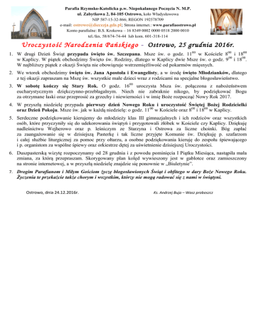 Parafia Rzymsko-Katolicka p.w. Niepokalanego Poczęcia N. M.P. ul. Zabytkowa 2, 84-105 Ostrowo, koło Władysławowa NIP 587-15-32-866; REGON 192578709 e-mail: [email protected]; Strona internet.: www.parafiaostrowo.pl Konto parafialne: B.S. Krokowa – 16 8349 0002 0000 0518 2000 0010 tel./fax. 58/674-74-44 lub kom. 601-318-114 Uroczystość Narodzenia Pańskiego - Ostrowo, 25 grudnia 2016r. 1. W drugi Dzień Świąt przypada święto św. Szczepana. Msze św. o godz. 1100 w Kościele 800 i 1800 w Kaplicy. W piątek obchodzimy Święto św. Rodziny, dlatego w Kaplicy dwie Msze św. o godz. 9 00 i 1800. W najbliższy piątek z okazji Święta nie obowiązuje wstrzemięźliwość od pokarmów mięsnych. 2. We wtorek obchodzimy święto św. Jana Apostoła i Ewangelisty, a w środę święto Młodzianków, dlatego z tej okazji zapraszam na Mszę św. wszystkie małe dzieci wraz z rodzicami na specjalne błogosławieństwo. 3. W sobotę kończy się Stary Rok. O godz. 1600 uroczysta Msza św. połączona z nabożeństwem eucharystycznym dziękczynno-przebłagalnym. Niech nie zabraknie nikogo, by podziękować Bogu za otrzymane łaski oraz przeprosić za grzechy i niewierności i w imię Boże rozpocząć Nowy Rok 2017. 4. W przyszłą niedzielę przypada pierwszy dzień Nowego Roku i uroczystość Świętej Bożej Rodzicielki oraz Dzień Pokoju. Msze św. jak w każdą niedzielę: o godz. 1100 w Kościele oraz 800 i 1800 w Kaplicy. 5. Serdeczne podziękowanie kierujemy do młodzieży klas III gimnazjalnych i ich rodziców oraz wszystkich osób, które przyczyniły się do udekorowania świątyń i przygotowali żłóbek w Kościele czy Kaplicy. Dziękuję nadleśnictwu Wejherowo oraz p. leśniczym ze Starzyna i Ostrowa za liczne choinki. Bóg zapłać za zaangażowanie się w dzisiejszą Pasterkę i tak liczne przyjęte Komunie św. Dziękuję p. szafarzom i całej służbie liturgicznej za pomoc przy ołtarzu, a osobne podziękowania kieruję do zespołu śpiewającego i p. organistom za wspólne śpiewy oraz orkiestrze dętej za uświetnienie dzisiejszej Uroczystości. 6. Duszpasterską wizytę rozpoczynamy od 28 grudnia i z powodu pominięcia I Piątku Miesiąca, nastąpiła mała zmiana, za którą przepraszam. Skorygowany plan kolęd wywieszony jest w gablotce oraz zamieszczony na stronie internetowej, a w przyszłą niedzielę znajdzie się ponownie w „Biuletynie”. 7. Drogim Parafianom i Miłym Gościom życzę błogosławionych Świąt i obfitego w dary Boże Nowego Roku. Życzenia te przekażcie także chorym i wszystkim, którzy nie mogą radować się z nami w świątyni. Ostrowo, dnia 24.12.2016r. Ks. Andrzej Buja – Wasz proboszcz