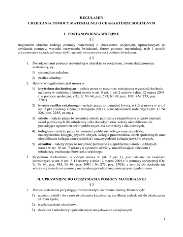 REGULAMIN UDZIELANIA POMOCY MATERIALNEJ O CHARAKTERZE SOCJALNYM I. POSTANOWIENIA WSTĘPNE §1 Regulamin określa: rodzaje pomocy materialnej o charakterze socjalnym, uprawnionych do uzyskania pomocy, warunki otrzymania świadczeń, formy pomocy materialnej, tryb i sposób przyznawania świadczeń oraz tryb i sposób wstrzymywania i cofania świadczeń. §2 1. Świadczeniami pomocy materialnej o charakterze socjalnym, zwaną dalej pomocą materialną, są: 1) stypendium szkolne; 2) zasiłek szkolny. 2. Ilekroć w regulaminie jest mowa o: 1) kryterium dochodowym – należy przez to rozumieć miesięczną wysokość dochodu na osobę w rodzinie, o której mowa w art. 8 ust. 1 pkt 2 ustawy z dnia 12 marca 2004 r. o pomocy społecznej (Dz. U. Nr 64, poz. 593, Nr 99, poz. 1001 i Nr 273, poz. 2703). 2) kwocie zasiłku rodzinnego – należy przez to rozumieć kwotę, o której mowa w art. 6 ust. 2 pkt 2 ustawy z dnia 28 listopada 2003 r. o świadczeniach rodzinnych (Dz. U. Nr 228, poz. 2255, ze zm.). 3) szkole – należy przez to rozumieć szkoły publiczne i niepubliczne o uprawnieniach szkół publicznych dla młodzieży i dla dorosłych oraz szkoły niepubliczne nie posiadające uprawnień szkół publicznych dla młodzieży i dla dorosłych, 4) kolegium – należy przez to rozumieć publiczne kolegia nauczycielskie, nauczycielskie kolegia języków obcych, kolegia pracowników służb społecznych oraz niepubliczne kolegia nauczycielskie i nauczycielskie kolegia języków obcych, 5) ośrodku – należy przez to rozumieć publiczne i niepubliczne ośrodki, o których mowa w art. 16 ust. 7 ustawy o systemie oświaty, umożliwiające dzieciom i młodzieży, realizację obowiązku szkolnego, 3. Kryterium dochodowe, o którym mowa w ust. 2 pkt 1), jest ustalane na zasadach określonych w art. 8 ust. 3-13 ustawy z dnia 12 marca 2004 r. o pomocy społecznej (Dz. U. Nr 64, poz. 593, Nr 99, poz. 1001 i Nr 273, poz. 2703), z tym że do dochodu nie wlicza się świadczeń pomocy materialnej przydzielanej niniejszym regulaminem. II. UPRAWNIENI DO OTRZYMANIA POMOCY MATERIALNEJ §3 1. Pomoc materialna przysługuje zamieszkałym na terenie Gminy Brańszczyk: 1) uczniom szkół - do czasu ukończenia kształcenia, nie dłużej jednak niż do ukończenia 24 roku życia, 2) wychowankom ośrodków, 3) dzieciom i młodzieży upośledzonym umysłowo ze sprzężonymi 1 niepełnosprawnościami - do czasu ukończenia realizacji obowiązku nauki, 4) słuchaczom kolegiów - do czasu ukończenia kształcenia, nie dłużej jednak niż do ukończenia 24 roku życia, zwanym dalej uprawnionymi. III. WARUNKI OTRZYMANIA POMOCY MATERIALNEJ §4 1. Pomoc materialną może otrzymać uprawniony znajdujący się w trudnej sytuacji materialnej, wynikającej z niskich dochodów na osobę w rodzinie, a w szczególności, gdy w rodzinie występuje: 1) 2) 3) 4) 5) 6) 7) 8) bezrobocie, niepełnosprawność, ciężka lub długotrwała choroba, wielodzietność, brak umiejętności wypełniania funkcji opiekuńczo -wychowawczych, alkoholizm lub narkomania, rodzina jest niepełna, lub wystąpiło zdarzenie losowe. 2. Za trudną sytuację materialną, o której mowa w ust. 1 uważa się sytuację, gdy miesięczna wysokość dochodu na osobę w rodzinie nie przekracza kryterium dochodowego. §5 1. Stypendium szkolne jest przyznawane na okres nie dłuższy niż od września do czerwca w danym roku szkolnym, a w przypadku słuchaczy kolegiów - na okres nie dłuższy niż od października do czerwca w danym roku szkolnym. 2. Jeżeli forma stypendium szkolnego tego wymaga, stypendium szkolne może być realizowane w okresach innych niż miesięczne lub jednorazowo, z tym że wartość stypendium szkolnego w danym roku szkolnym nie może przekroczyć łącznie dwudziestokrotności kwoty zasiłku rodzinnego, a w przypadku słuchaczy kolegiów osiemnastokrotności kwoty zasiłku rodzinnego. §6 1. Stypendium szkolne nie przysługuje uprawnionemu, który otrzymuje inne stypendium o charakterze socjalnym ze środków publicznych, z zastrzeżeniem ust. 2. 2. Uprawniony, który otrzymuje inne stypendium o charakterze socjalnym ze środków publicznych, może otrzymać stypendium szkolne w wysokości, która łącznie z innym stypendium o charakterze socjalnym ze środków publicznych nie przekracza dwudziestokrotności kwoty zasiłku rodzinnego, a w przypadku słuchaczy kolegiów osiemnastokrotności kwoty zasiłku rodzinnego. §7 1. Zasiłek szkolny może być przyznany uprawnionemu znajdującemu się przejściowo w trudnej sytuacji materialnej z powodu zdarzenia losowego. 2. O zasiłek szkolny można ubiegać się w terminie nie dłuższym niż dwa miesiące od wystąpienia zdarzenia uzasadniającego przyznanie tego zasiłku. 2 IV. FORMY POMOCY MATERIALNEJ §8 1. Stypendium szkolne może być udzielane uprawnionym w formie: 1) całkowitego lub częściowego pokrycia kosztów udziału w zajęciach edukacyjnych, w tym wyrównawczych, wykraczających poza zajęcia realizowane w szkole w ramach planu nauczania, 2) całkowitego lub częściowego pokrycia kosztów udziału w zajęciach edukacyjnych realizowanych poza szkołą, 3) pomocy rzeczowej o charakterze edukacyjnym, w tym w szczególności zakupu podręczników, dofinansowania do zakupu pomocy, itp. 2. Stypendium szkolne może być udzielane uprawnionym szkół ponadgimnazjalnych oraz słuchaczom kolegiów, także w formie całkowitego lub częściowego pokrycia kosztów związanych z pobieraniem nauki poza miejscem zamieszkania. 3. Stypendium szkolne może być także udzielone w formie świadczenia pieniężnego, jeżeli Wójt Gminy uzna, że udzielenie stypendium w formach, o których mowa w ust. 1 i 2, nie jest możliwe albo nie jest celowe. 4. Stypendium szkolne może być udzielone w jednej lub kilku formach jednocześnie. §9 1. Stypendium szkolne nie może być niższe miesięcznie niż 80 % kwoty zasiłku rodzinnego i nie może przekraczać miesięcznie 200 % tej kwoty. § 10 1. Zasi