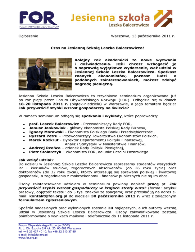 Ogłoszenie Warszawa, 13 października 2011 r. Czas na Jesienną Szkołę Leszka Balcerowicza! Kolejny rok akademicki to nowe wyzwania i doświadczenia. Jeśli chcesz wzbogacić je o naprawdę wyjątkowe wydarzenie, weź udział w Jesiennej Szkole Leszka Balcerowicza. Spotkasz znanych ekonomistów, poznasz ludzi o podobnych zainteresowaniach, możesz zdobyć nagrodę pieniężną. Jesienna Szkoła Leszka Balcerowicza to trzydniowe seminarium organizowane już po raz piąty przez Forum Obywatelskiego Rozwoju (FOR). Odbędzie się w dniach 18-20 listopada 2011 r. (piątek-niedziela) w Warszawie, a jego tematem będzie: Jak przywrócić szybki wzrost gospodarczy na świecie? W ramach seminarium odbędą się spotkania i wykłady, które poprowadzą: prof. Leszek Balcerowicz - Przewodniczący Rady FOR, Janusz Jankowiak - główny ekonomista Polskiej Rady Biznesu, Ignacy Morawski - Ekonomista Polskiego Banku Przedsiębiorczości, Ryszard Petru – Przewodniczący Towarzystwa Ekonomistów Polskich, Marek Rozkrut - Dyrektor Departamentu Polityki Finansowej, Analiz i Statystyki w Ministerstwie Finansów, Andrzej Rzońca – członek Rady Polityki Pieniężnej, Piotr Stolarczyk – ekonomista FOR, adiunkt Uczelni Łazarskiego. Jak wziąć udział? Do udziału w Jesiennej Szkole Leszka Balcerowicza zapraszamy studentów wszystkich lat i kierunków studiów, tegorocznych absolwentów (do 26 roku życia) oraz doktorantów (do 32 roku życia), którzy interesują się sprawami polskiej i światowej gospodarki, a zagadnienia z makroekonomii i finansów publicznych nie są im obce. Osoby zainteresowane udziałem w seminarium powinny napisać pracę pt. Jak przywrócić szybki wzrost gospodarczy w krajach strefy euro? (forma: artykuł prasowy, objętość tekstu: do 5 tys. znaków ze spacjami) oraz przesłać ją na adres email: [email protected] do niedzieli 30 października 2011 r. wraz z załączonym formularzem zgłoszeniowym. Spośród nadesłanych prac wyłonionych zostanie 30 najlepszych, a ich autorzy wezmą udział w Jesiennej Szkole Leszka Balcerowicza. Osoby zakwalifikowane zostaną poinformowane o wynikach mailowo i telefonicznie do 11 listopada 2011 r. Forum Obywatelskiego Rozwoju (FOR) Al. J. Ch. Szucha 2/4 lok. 20, 00-582 Warszawa tel. +48 22 427 40 10, fax +48 22 213 37 85 e-mail: [email protected] www.for.org.pl Jakie są nagrody? Wszyscy uczestnicy seminarium otrzymają dyplomy, a autorzy najlepszych prac zostaną nagrodzeni: I nagroda - 2000 zł, II nagroda – 1000 zł, III nagroda – 500 zł. Nagrody ufundowała firma BIOFARM Sp. z o.o. z Poznania. Jakie są warunki uczestnictwa? Udział w Jesiennej Szkole Leszka Balcerowicza jest bezpłatny. Organizator zapewnia wyżywienie, a osobom spoza Warszawy zwraca koszty dojazdu (do 100 zł) oraz zapewnia nocleg w hotelu, w którym będzie odbywało się seminarium. W tegorocznym seminarium nie mogą wziąć udziału osoby, które uczestniczyły w poprzednich edycjach Wiosennej i Jesiennej Szkoły Leszka Balcerowicza. Każdy uczestnik powinien zapoznać się z regulaminem. Więcej informacji: http://www.for.org.pl/pl/Jesienna-Szkola-Leszka-Balcerowicza-2011 Forum Obywatelskiego Rozwoju (FOR) zostało założone przez prof. Leszka Balcerowicza. Misją FOR jest zmieniać świadomość Polaków oraz obowiązujące i planowane prawo w kierunku wolnościowym. Naszym celem jest zwiększenie obywatelskiego zaangażowania w działania przyczyniające się do rozwoju kraju. Pomóż nam chronić Twoją wolność oraz promować prawdę i zdrowy rozsądek w dyskursie publicznym. Już dziś obdarz nas swoim wsparciem i zaufaniem. Twój dar umożliwi nam działalność oraz potwierdzi słuszność i skuteczność naszych działań. Zachęcamy do dokonywania nawet niewielkich, lecz regularnych wpłat (nr konta FOR: 68 1090 1883 0000 0001 0689 0629). www.for.org.pl Forum Obywatelskiego Rozwoju (FOR) Al. J. Ch. Szucha 2/4 lok. 20, 00-582 Warszawa tel. +48 22 427 40 10, fax +48 22 213 37 85 e-mail: [email protected] www.for.org.pl