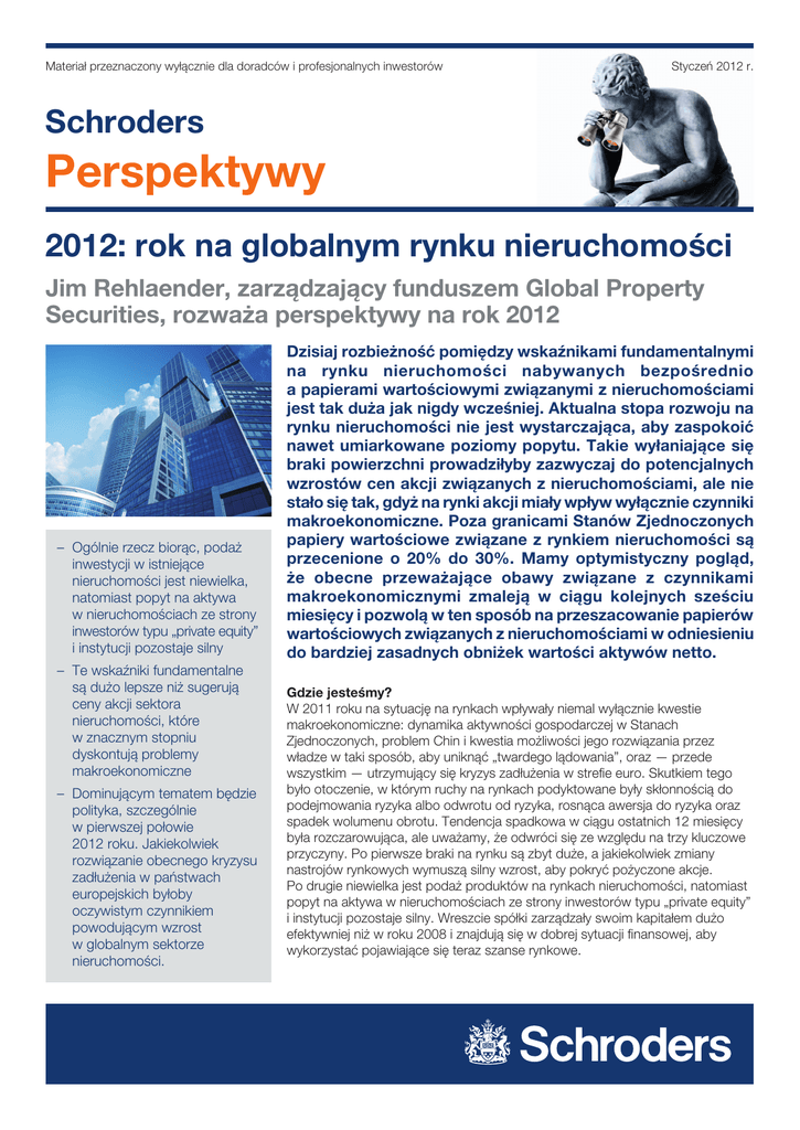 Materiał przeznaczony wyłącznie dla doradców i profesjonalnych inwestorów Styczeń 2012 r. Schroders Perspektywy 2012: rok na globalnym rynku nieruchomości Jim Rehlaender, zarządzający funduszem Global Property Securities, rozważa perspektywy na rok 2012 –– Ogólnie rzecz biorąc, podaż inwestycji w istniejące nieruchomości jest niewielka, natomiast popyt na aktywa w nieruchomościach ze strony inwestorów typu „private equity” i instytucji pozostaje silny –– Te wskaźniki fundamentalne są dużo lepsze niż sugerują ceny akcji sektora nieruchomości, które w znacznym stopniu dyskontują problemy makroekonomiczne –– Dominującym tematem będzie polityka, szczególnie w pierwszej połowie 2012 roku. Jakiekolwiek rozwiązanie obecnego kryzysu zadłużenia w państwach europejskich byłoby oczywistym czynnikiem powodującym wzrost w globalnym sektorze nieruchomości. Dzisiaj rozbieżność pomiędzy wskaźnikami fundamentalnymi na rynku nieruchomości nabywanych bezpośrednio a papierami wartościowymi związanymi z nieruchomościami jest tak duża jak nigdy wcześniej. Aktualna stopa rozwoju na rynku nieruchomości nie jest wystarczająca, aby zaspokoić nawet umiarkowane poziomy popytu. Takie wyłaniające się braki powierzchni prowadziłyby zazwyczaj do potencjalnych wzrostów cen akcji związanych z nieruchomościami, ale nie stało się tak, gdyż na rynki akcji miały wpływ wyłącznie czynniki makroekonomiczne. Poza granicami Stanów Zjednoczonych papiery wartościowe związane z rynkiem nieruchomości są przecenione o 20% do 30%. Mamy optymistyczny pogląd, że obecne przeważające obawy związane z czynnikami makroekonomicznymi zmaleją w ciągu kolejnych sześciu miesięcy i pozwolą w ten sposób na przeszacowanie papierów wartościowych związanych z nieruchomościami w odniesieniu do bardziej zasadnych obniżek wartości aktywów netto. Gdzie jesteśmy? W 2011 roku na sytuację na rynkach wpływały niemal wyłącznie kwestie makroekonomiczne: dynamika aktywności gospodarczej w Stanach Zjednoczonych, problem Chin i kwestia możliwości jego rozwiązania przez władze w taki sposób, aby uniknąć „twardego lądowania”, oraz — przede wszystkim — utrzymujący się kryzys zadłużenia w strefie euro. Skutkiem tego było otoczenie, w którym ruchy na rynkach podyktowane były skłonnością do podejmowania ryzyka albo odwrotu od ryzyka, rosnąca awersja do ryzyka oraz spadek wolumenu obrotu. Tendencja spadkowa w ciągu ostatnich 12 miesięcy była rozczarowująca, ale uważamy, że odwróci się ze względu na trzy kluczowe przyczyny. Po pierwsze braki na rynku są zbyt duże, a jakiekolwiek zmiany nastrojów rynkowych wymuszą silny wzrost, aby pokryć pożyczone akcje. Po drugie niewielka jest podaż produktów na rynkach nieruchomości, natomiast popyt na aktywa w nieruchomościach ze strony inwestorów typu „private equity” i instytucji pozostaje silny. Wreszcie spółki zarządzały swoim kapitałem dużo efektywniej niż w roku 2008 i znajdują się w dobrej sytuacji finansowej, aby wykorzystać pojawiające się teraz szanse rynkowe. Perspektywy na rok 2012: rok na globalnym rynku nieruchomości „Zignorowanie mediów pozwoli dojrzeć otoczenie inwestycyjne, które jest najlepsze od wielu lat pod względem jakości nieruchomości, realistycznych założeń dotyczących zwrotów oraz właścicieli/operatorów dysponujących odpowiednim kapitałem”. „Mamy optymistyczny pogląd, że obecne przeważające obawy związane z czynnikami makroekonomicznymi zmaleją w ciągu kolejnych sześciu miesięcy i pozwolą w ten sposób na przeszacowanie papierów wartościowych związanych z nieruchomościami w odniesieniu do bardziej zasadnych obniżek wartości aktywów netto”. „Chociaż nie oczekujemy stuprocentowych skoków, które obserwowaliśmy w 2008 roku, wciąż bardzo prawdopodobne są znaczne wzrosty cen akcji”. Obawy makroekonomiczne usuwają w cień świetne otoczenie dla inwestycji w nieruchomości Krytyczne kwestie dla sektora nieruchomości znajdują się dzisiaj w dużym stopniu na poziomie makroekonomicznym, ponieważ rynki nieruchomości na całym świecie są ogólnie w dobrym stanie. Wiele kluczowych rynków ucierpi wkrótce z powodu braku podaży, ponieważ banki i inne instytucje finansowe unikają tego sektora, co w ogromnym stopniu utrudnia deweloperom zaspokajanie obecnego i przyszłego popytu. Ponadto popyt na nieruchomości ze strony inwestorów znacznie prześcignął podaż, a ceny szybko podniosły się z minimalnych poziomów z roku 2008. Rynkowe wskaźniki fundamentalne są dużo lepsze niż sugerują ceny akcji nieruchomości, które w znacznym stopniu dyskontują problemy makroekonomiczne. W rzeczywistości zignorowanie mediów pozwoli dojrzeć otoczenie inwestycyjne, które jest najlepsze od wielu lat pod względem jakości nieruchomości, realistycznych założeń dotyczących zwrotów oraz właścicieli/operatorów dysponujących odpowiednim kapitałem. Azja: Chiny i Hongkong gotowe do odbicia się z kryzysu Niskie wolumeny i krótkie pozycje wyolbrzymiły negatywne ruchy cen na całym świecie w 2011 roku, ale nigdzie nie było to tak duże zjawisko jak w Hongkongu i Chinach. Średnia dźwignia finansowa dla spółek w sektorze nieruchomości w Azji wynosiła około 20%, a więc była niższa niż w Europie i Stanach Zjednoczonych, natomiast ceny akcji związanych z nieruchomościami kształtowały się na poziomie niższym o średnio 50% od wartości aktywów netto. Pomimo funkcjonowania w silnie rosnących gospodarkach rozbieżność wartości pomiędzy cenami akcji a wskaźnikami fundamentalnymi spółek z sektora nieruchomości jest tak duża jak w roku 2008. W 2009 roku rozbieżność ta znikła w ciągu od sześciu do dziewięciu miesięcy po okresie, kiedy wystąpiły poziomy minimalne, i — chociaż zakładamy ustąpienie przeciwności makroekonomicznych — nie będzie dla nas zaskocz