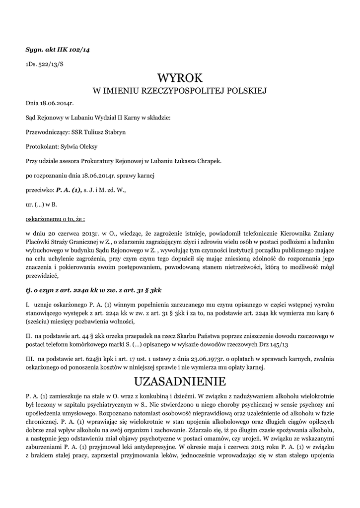 Sygn. akt IIK 102/14 1Ds. 522/13/S WYROK W IMIENIU RZECZYPOSPOLITEJ POLSKIEJ Dnia 18.06.2014r. Sąd Rejonowy w Lubaniu Wydział II Karny w składzie: Przewodniczący: SSR Tuliusz Stabryn Protokolant: Sylwia Oleksy Przy udziale asesora Prokuratury Rejonowej w Lubaniu Łukasza Chrapek. po rozpoznaniu dnia 18.06.2014r. sprawy karnej przeciwko: P. A. (1), s. J. i M. zd. W., ur. (...) w B. oskarżonemu o to, że : w dniu 20 czerwca 2013r. w O., wiedząc, że zagrożenie istnieje, powiadomił telefonicznie Kierownika Zmiany Placówki Straży Granicznej w Z., o zdarzeniu zagrażającym zżyci i zdrowiu wielu osób w postaci podłożeni a ładunku wybuchowego w budynku Sądu Rejonowego w Z. , wywołując tym czynności instytucji porządku publicznego mające na celu uchylenie zagrożenia, przy czym czynu tego dopuścił się mając zniesioną zdolność do rozpoznania jego znaczenia i pokierowania swoim postępowaniem, powodowaną stanem nietrzeźwości, którą to możliwość mógł przewidzieć, tj. o czyn z art. 224a kk w zw. z art. 31 § 3kk I. uznaje oskarżonego P. A. (1) winnym popełnienia zarzucanego mu czynu opisanego w części wstępnej wyroku stanowiącego występek z art. 224a kk w zw. z art. 31 § 3kk i za to, na podstawie art. 224a kk wymierza mu karę 6 (sześciu) miesięcy pozbawienia wolności, II. na podstawie art. 44 § 2kk orzeka przepadek na rzecz Skarbu Państwa poprzez zniszczenie dowodu rzeczowego w postaci telefonu komórkowego marki S. (...) opisanego w wykazie dowodów rzeczowych Drz 145/13 III. na podstawie art. 624§1 kpk i art. 17 ust. 1 ustawy z dnia 23.06.1973r. o opłatach w sprawach karnych, zwalnia oskarżonego od ponoszenia kosztów w niniejszej sprawie i nie wymierza mu opłaty karnej. UZASADNIENIE P. A. (1) zamieszkuje na stałe w O. wraz z konkubiną i dziećmi. W związku z nadużywaniem alkoholu wielokrotnie był leczony w szpitalu psychiatrycznym w S.. Nie stwierdzono u niego choroby psychicznej w sensie psychozy ani upośledzenia umysłowego. Rozpoznano natomiast osobowość nieprawidłową oraz uzależnienie od alkoholu w fazie chronicznej. P. A. (1) wprawiając się wielokrotnie w stan upojenia alkoholowego oraz długich ciągów opilczych dobrze znał wpływ alkoholu na swój organizm i zachowanie. Zdarzało się, iż po długim czasie spożywania alkoholu, a następnie jego odstawieniu miał objawy psychotyczne w postaci omamów, czy urojeń. W związku ze wskazanymi zaburzeniami P. A. (1) przyjmował leki antydepresyjne. W okresie maja i czerwca 2013 roku P. A. (1) w związku z brakiem stałej pracy, zaprzestał przyjmowania leków, jednocześnie wprowadzając się w stan stałego upojenia alkoholowego. W połowie czerwca 2013 roku przestał pić w związku, z czym nasiliły się u niego objawy złego samopoczucia, bezsenności i urojeń. W dniu 20 czerwca 2013 roku P. A. (1) spożył alkohol w postaci dwóch piw, po czym około godziny 3.00 w nocy w dniu 21 czerwca 2013 roku zadzwonił ze swojego telefonu komórkowego do dyżurnego Placówki Straży Granicznej w Z., informując go, iż mężczyzna o pseudonimie (...) zamierza podłożyć bombę własnej produkcji w Sądzie Rejonowym w Z.. Dowód: wyjaśnienia oskarżonego P. A. k. 490, 27-30, 32; dokumentacja przekazana przez PSG w Z. k. 43-46; opinia sądowo psychiatryczna k. 47-49. Dyżurny Placówki Straży Granicznej w Z. uzyskawszy informację o zamachu bombowym wdrożył stosowna procedurę mając zapobiec takiej ewentualności. O powyższy powiadomił Komendę Wojewódzką Policji we W., Komendę Powiatową Policji w Z., Departament Zwalczania Terroryzmu ABW, Delegaturę ABW we W. oraz Dyrektora Zarządu Granicznego Komendy Głównej Straży Granicznej w W.. W wyniku złożonego zawiadomienia P. A. (1), podjęto działania zmierzające do wykrycia ładunku wybuchowego, polegające na przeszukaniu budynków Sądu Rejonowego w Z. położonych przy ul. (...), zarządzając jednocześnie natychmiastową ewakuację pracowników przedmiotowej placówki. W toku przeprowadzonych czynności sprawdzających nie ujawniono materiałów wybuchowych ani innych substancji zagrażających życiu lub zdrowiu. Dowód: dokumentacja przekazana przez PSG w Z. k. 43-46; dokumentacja z przeprowadzonych działań minersko-pirotechnicznych k. 6, 62-69, 72. P. A. (1) w chwili zdarzenia miał zniesioną zdolność rozpoznania znaczenia zarzucanego mu czynu i pokierowania swoim postępowaniem, jednakże sprawca wprawił się w stan nietrzeźwości dobrowolnie, znając wpływ alkoholu na jego organizm i zachowanie, w związku, z czym mógł przewidzieć wystąpienie zaburzeń o charakterze psychotycznym. Tym samym ma do niego zastosowanie przepis art. 31 § 3 kk. P. A. (1) był uprzednio wielokrotnie karany. Dowód: opinia sądowo psychiatryczna k. 47-49; informacja z KRK k. 84-85; odpisy wyroków k. 94-96. Oskarżony P. A. (1) przyznał się do popełnienia zarzucanego mu czynu. W swoich wyjaśnieniach wskazał na okoliczności zaistniałego zdarzenia. Przedstawiona przez niego wersja koreluje z zebranym materiałem dowodowym, a w szczególności z opinią sądowo psychiatryczną, dokumentacją przekazaną przez PSG w Z., dokumentacją z przeprowadzonych działań minersko-pirotechnicznych, tworząc jedną logiczna całość. W tym stanie rzeczy Sąd uznał, iż wyjaśnienia oskarżonego, który przyznał się do popełnienia zarzucanego mu czynnie nie budzą żadnych wątpliwości, w związku, z czym zachodzą przesłanki określone w art. 388 kpk skutkujące ograniczeniem postępowania dowodowego, czemu nie przeciwstawiły się obecne strony. Mając powyższe na uwadze Sąd uznał, iż oskarżony P. A. (1) swoim zachowaniem wyczerpał ustawowe znamiona zarzucanego mu czynu z art. 224a kk. Wiedząc o tym, iż żadne niebezpieczeństwo nie istniej, zawiadomił dyżurnego PSG w Z. o podłożeniu bomby w budynku Sądu Rejonowego w Z., czym wywołał działania instytucji porządku publicznego zmierzające do uchylen