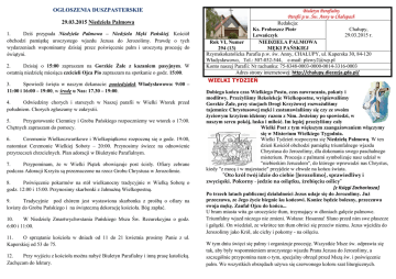 OGŁOSZENIA DUSZPASTERSKIE 29.03.2015 Niedziela Palmowa 1. Dziś przypada Niedziela Palmowa – Niedziela Męki Pańskiej. Kościół obchodzi pamiątkę uroczystego wjazdu Jezusa do Jerozolimy. Prawdę o tych wydarzeniach wspominamy dzisiaj przez poświęcenie palm i uroczystą procesję do świątyni. 2. Dzisiaj o 15:00 zapraszam na Gorzkie Żale z kazaniem pasyjnym. W ostatnią niedzielę miesiąca czcicieli Ojca Pio zapraszam na spotkanie o godz. 15:00. 3. Spowiedź święta w naszym dekanacie: poniedziałek Władysławowo: 9:00 – 11:00 i 16:00 – 19:00, w środę u Nas: 17.30 – 19:00. 4. Odwiedziny chorych i starszych w Naszej parafii w Wielki Wtorek przed południem. Chorych zgłaszamy w zakrystii. 5. Przygotowanie Ciemnicy i Grobu Pańskiego rozpoczniemy we wtorek o 17:00. Chętnych zapraszam do pomocy. 6. Ceremonie Wielkoczwartkowe i Wielkopiątkowe rozpoczną się o godz. 19:00, natomiast Ceremonie Wielkiej Soboty – 20:00. Przynosimy świece na odnowienie przyrzeczeń chrzcielnych. Plan adoracji w Biuletynie Parafialnym. 7. Przypominam, że w Wielki Piątek obowiązuje post ścisły. Ofiary zebrane podczas Adoracji Krzyża są przeznaczone na rzecz Grobu Chrystusa w Jerozolimie. 8. Poświęcenie pokarmów na stół wielkanocny tradycyjnie w Wielką Sobotę o godz. 12:00 i 15:00. Przynosimy skarbonki z Jałmużną Wielkopostną. 9. Tradycyjnie pod chórem jest wystawiona skarbonka z prośbą o ofiary na kwiaty do Grobu Pańskiego i na świąteczną dekorację kościoła. Bóg zapłać. 10. W Niedzielę Zmartwychwstania Pańskiego Msza Św. Rezurekcyjna o godz. 6:00 i 11:00. 11. O sprzątanie kościoła w dniach od 11 do 21 kwietnia prosimy Panie z ul. Kaperskiej od 53 do 75. 12. Przy wyjściu z kościoła można nabyć Biuletyn Parafialny i inną prasę katolicką. Zachęcam do lektury. Biuletyn Parafialny Parafii p.w. Św. Anny w Chałupach Redakcja: Chałupy, Ks. Proboszcz Piotr 29.03.2015 r. Lewańczyk Rok VI, Numer NIEDZIELA PALMOWA 294 (13) MĘKI PAŃSKIEJ Rzymskokatolicka Parafia p.w. św. Anny, CHAŁUPY, ul. Kaperska 30, 84-120 Władysławowo, Tel.: 507-032-544, e-mail: [email protected] Konto naszej Parafii: Nr rachunku: 75-8348-0003-0000-0014-3316-0003 Adres strony internetowej: http://chalupy.diecezja.gda.pl/ WIELKI TYDZIEŃ Dobiega końca czas Wielkiego Postu, czas nawracania, pokuty i modlitwy. Przeżyliśmy Rekolekcje Wielkopostne, wyśpiewaliśmy Gorzkie Żale, przy stacjach Drogi Krzyżowej rozważaliśmy tajemnice Chrystusowej męki i zastanawialiśmy się czy ze swoim życiowym krzyżem idziemy razem z Nim. Jesteśmy po spowiedzi, w naszym sercu pokój, łaska i miłość. Im lepiej przeżyliśmy cały Wielki Post z tym większym zaangażowaniem włączymy się w Misterium Wielkiego Tygodnia. Wielki Tydzień rozpoczyna się Niedzielą Palmową. W ten dzień Kościół obchodzi pamiątkę triumfalnego wjazdu Chrystusa do Jerozolimy, dla dokonania swego paschalnego misterium. Procesja z palmami symbolizuje nasz udział w "niebieskim Jeruzalem", do którego wprowadzi nas Chrystus, kiedy "z mocą i w majestacie" przyjdzie w chwale na końcu świata. "Oto król twój idzie do ciebie [Jerozolimo], sprawiedliwy i zwycięski. Pokorny - jedzie na oślątku, źrebięciu oślicy" [z Księgi Zachariasza] Po trzech latach publicznej działalności Jezus udaje się do Jerozolimy. Już przeczuwa, ze Jego życie biegnie ku końcowi. Koniec będzie bolesny, przeczuwa swoja mękę. Zaufał Ojcu do końca... U bram miasta wita go uroczyście tłum, trzymający w dłoniach gałęzie palmowe. Triumfalny wjazd niczego nie zmieni. Wołano: Hosanna! Słano przed nim swe płaszcze i gałązki. On wiedział, ze wkrótce ten tłum obróci się przeciw niemu. Jezus wjeżdża do Jerozolimy jako Król, ale cichy i pokorny - na oślęciu. W tym dniu święci się palmy i organizuje procesję. Wszystkie Msze św. odprawia się tak, aby były wspomnieniem uroczystego wjazdu Prana Jezusa do Jerozolimy, a szczególnie przypomina nam o tym, specjalny obrzęd przed Mszą św. i poświęcenie palm. We wszystkich obrzędach używa się czerwonego koloru szat liturgicznych. Słowo „ PASCHA” pochodzi od hebrajskiego pesach, czyli przejście. Tak określane jest najważniejsze święto żydowskie obchodzone na pamiątkę wyjścia Izraelitów z Egiptu i przejście przez Morze Czerwone. Wydarzenia te były zapowiedzią wyzwolenia z niewoli grzechu, którego miał dokonać Jezus Chrystus. Triduum Paschalne, Triduum Sacrum (z łac. triduum - trzy dni) – najważniejsze wydarzenie w roku liturgicznym katolików oraz starokatolików, którego istotą jest celebracja Misterium paschalnego: męki, śmierci i zmartwychwstania Chrystusa. Rozpoczyna się wieczorną Mszą w Wielki Czwartek (Msza Wieczerzy Pańskiej), kończy zaś drugimi nieszporami po południu Niedzieli wielkanocnej. Wielki Czwartek Najstarszy dokument opisujący liturgię Wielkiego Tygodnia w Jerozolimie z IV wieku, mówi o dwóch Mszach św. w Wielki Czwartek. Dwie Msze św. w tym dniu odprawia się kościołach katedralnych. Rano biskup koncelebruje, razem ze wszystkimi kapłanami z całej diecezji uroczystą Mszę św. z poświęceniem Krzyżma (oliwa zmieszana z balsmem, używane w sakramencie bierzmowania i sakramencie chrztu) i oleju chorych. We wszystkich innych kościołach wolno w tym dniu odprawić tylko jedną Mszę św. w godzinach wieczornych. Nazywamy ją "Mszą Wieczerzy Pańskiej". Rozpoczyna ona Triduum Paschalne, które stanowi Wielki Piątek, Wielką Sobotę i Niedzielę Zmartwychwstania. Ostatnia wieczerza miała miejsce w nocy z czwartku na piątek i należała według żydowskiej rachuby czasu do piątku. Doba trwała od zachodu, do zachodu słońca. Dlatego, dniem zarówno pierwszej Ofiary Eucharystycznej jak i Ofiary Krzyża, jest ten sam dzień - Wielki Piątek. I tu widzimy ścisły związek Krzyża, Zmartwychwstania i Eucharystii. Wielki Piątek W tym dniu gromadzimy się na sprawowaniu pamiątki męki i śm