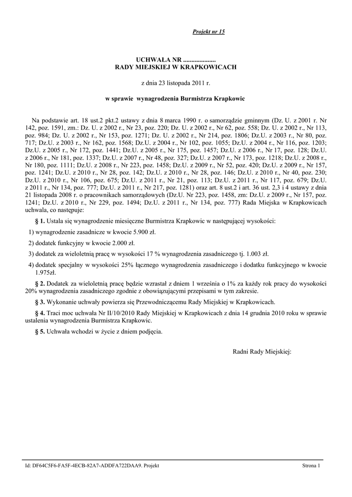 Projekt nr 15 UCHWAŁA NR .................... RADY MIEJSKIEJ W KRAPKOWICACH z dnia 23 listopada 2011 r. w sprawie wynagrodzenia Burmistrza Krapkowic Na podstawie art. 18 ust.2 pkt.2 ustawy z dnia 8 marca 1990 r. o samorządzie gminnym (Dz. U. z 2001 r. Nr 142, poz. 1591, zm.: Dz. U. z 2002 r., Nr 23, poz. 220; Dz. U. z 2002 r., Nr 62, poz. 558; Dz. U. z 2002 r., Nr 113, poz. 984; Dz. U. z 2002 r., Nr 153, poz. 1271; Dz. U. z 2002 r., Nr 214, poz. 1806; Dz.U. z 2003 r., Nr 80, poz. 717; Dz.U. z 2003 r., Nr 162, poz. 1568; Dz.U. z 2004 r., Nr 102, poz. 1055; Dz.U. z 2004 r., Nr 116, poz. 1203; Dz.U. z 2005 r., Nr 172, poz. 1441; Dz.U. z 2005 r., Nr 175, poz. 1457; Dz.U. z 2006 r., Nr 17, poz. 128; Dz.U. z 2006 r., Nr 181, poz. 1337; Dz.U. z 2007 r., Nr 48, poz. 327; Dz.U. z 2007 r., Nr 173, poz. 1218; Dz.U. z 2008 r., Nr 180, poz. 1111; Dz.U. z 2008 r., Nr 223, poz. 1458; Dz.U. z 2009 r., Nr 52, poz. 420; Dz.U. z 2009 r., Nr 157, poz. 1241; Dz.U. z 2010 r., Nr 28, poz. 142; Dz.U. z 2010 r., Nr 28, poz. 146; Dz.U. z 2010 r., Nr 40, poz. 230; Dz.U. z 2010 r., Nr 106, poz. 675; Dz.U. z 2011 r., Nr 21, poz. 113; Dz.U. z 2011 r., Nr 117, poz. 679; Dz.U. z 2011 r., Nr 134, poz. 777; Dz.U. z 2011 r., Nr 217, poz. 1281) oraz art. 8 ust.2 i art. 36 ust. 2,3 i 4 ustawy z dnia 21 listopada 2008 r. o pracownikach samorządowych (Dz.U. Nr 223, poz. 1458, zm: Dz.U. z 2009 r., Nr 157, poz. 1241; Dz.U. z 2010 r., Nr 229, poz. 1494; Dz.U. z 2011 r., Nr 134, poz. 777) Rada Miejska w Krapkowicach uchwala, co następuje: § 1. Ustala się wynagrodzenie miesięczne Burmistrza Krapkowic w następującej wysokości: 1) wynagrodzenie zasadnicze w kwocie 5.900 zł. 2) dodatek funkcyjny w kwocie 2.000 zł. 3) dodatek za wieloletnią pracę w wysokości 17 % wynagrodzenia zasadniczego tj. 1.003 zł. 4) dodatek specjalny w wysokości 25% łącznego wynagrodzenia zasadniczego i dodatku funkcyjnego w kwocie 1.975zł. § 2. Dodatek za wieloletnią pracę będzie wzrastał z dniem 1 września o 1% za każdy rok pracy do wysokości 20% wynagrodzenia zasadniczego zgodnie z obowiązującymi przepisami w tym zakresie. § 3. Wykonanie uchwały powierza się Przewodniczącemu Rady Miejskiej w Krapkowicach. § 4. Traci moc uchwała Nr II/10/2010 Rady Miejskiej w Krapkowicach z dnia 14 grudnia 2010 roku w sprawie ustalenia wynagrodzenia Burmistrza Krapkowic. § 5. Uchwała wchodzi w życie z dniem podjęcia. Radni Rady Miejskiej: Id: DF64C5F6FA5F4ECB82A7ADDFA722DAA9. Projekt Strona 1 Uzasadnienie do projektu uchwały w sprawie wynagrodzenia Burmistrza Krapkowic 1) Cel podjęcia. Zgodnie z obowiązującymi przepisami kodeksu pracy pracownikowi przysługuje wynagrodzenie za pracę, wypłacane, co najmniej raz w miesiącu. Zgodnie z przepisami ustawy z dnia 21 listopada 2008 r. o pracownikach samorządowych czynności z zakresu prawa pracy wobec Burmistrza związane z nawiązaniem i rozwiązaniem stosunku pracy, w tym ustaleniem wynagrodzenia wykonuje Przewodniczący Rady w oparciu o podjętą przez Radę Miejską uchwałę. 2) Opis stanu faktycznego. W myśl art. 36 ust. 24 ustawy o pracownikach samorządowych na wynagrodzenie składają się: wynagrodzenie zasadnicze, dodatek za wieloletnią pracę, dodatek specjalny i dodatek funkcyjny. Wysokość tych składników określa rozporządzenie Rady Ministrów z dnia 18 marca 2009 r. w sprawie wynagradzania pracowników samorządowych. Obecne wynagrodzenie Burmistrza Krapkowic zostało ustalone uchwałą Nr II/10/2010 Rady Miejskiej w Krapkowicach z dnia 14 grudnia 2010 r. w sprawie wynagrodzenia miesięcznego Burmistrza Krapkowic. 3) Różnice pomiędzy dotychczasowym a nowym stanem prawnym. Przy ustalaniu wynagrodzenia Burmistrza należy mieć na uwadze ograniczenie maksymalnej wysokości łącznego wynagrodzenia miesięcznego wynikające z art. 37 ust. 3 ustawy o pracownikach samorządowych, które nie może przekroczyć siedmiokrotności kwoty bazowej określonej w ustawie budżetowej dla osób zajmujących kierownicze stanowiska państwowe na podstawie przepisów ustawy z dnia 23 grudnia 1999r. o kształtowaniu wynagrodzeń państwowej sferze budżetowej oraz o zmianie niektórych ustaw (Dz. U. Nr 110 poz. 1255 z późniejszymi zmianami). Ustawa budżetowa z dnia 20 stycznia 2011r. w art. 13 ust. 1 pkt 2 lit. a ustala tę kwotę w wysokości 1.766,46 zł, co wyznacza wspomniany próg na poziomie 12.365,22 zł. Wynagrodzenie Burmistrza Krapkowic ustalone ww. uchwałą Rady Miejskiej w Krapkowicach w § 1 pkt.3 ustala dodatek za wysługę lat na poziomie 16 % i obecnie jest sprzeczne z brzmieniem art. 38 ust. 1 ustawy z dnia 21 listopada 2008r. o pracownikach samorządowych, gdyż od dnia 01.09.2011r. burmistrz nabył prawo do dodatku za wieloletnią pracę w wysokości 17%. Proponuje się stawkę wynagrodzenia zasadniczego w wysokości 5.900 zł. dodatek funkcyjny do wysokości 2.000 zł, co łącznie daje kwotę 7.900 zł jako podstawę do wyliczenia dodatku specjalnego w wysokości 25%, tj. 1.975 zł. Ponadto na wynagrodzenie składa się dodatek za wieloletnią pracę w wysokości 17% wynagrodzenia zasadniczego, tj.1.003zł. Łączne wynagrodzenie Burmistrza Krapkowic wynosić będzie 10.878 zł. i nie przekroczy określonego maksymalnego progu. Uchwała zastąpi dotychczas obowiązującą uchwałę Nr II/10/2010 Rady Miejskiej w Krapkowicach z dnia 14 grudnia 2010 r. w sprawie ustalenia wynagrodzenia Burmistrza Krapkowic. Id: DF64C5F6FA5F4ECB82A7ADDFA722DAA9. Projekt Strona 1