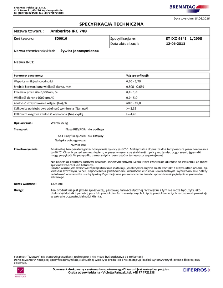 Brenntag Polska Sp. z.o.o. ul. J. Bema 21, 47-224 Kędzierzyn-Koźle tel (48/77)4721500, fax (48/77)4721600 Data wydruku: 15.06.2016 SPECYFIKACJA TECHNICZNA Nazwa towaru: Amberlite IRC 748 Kod towaru: 500010 Nazwa chemiczna\skład: Specyfikacja nr: Data aktualizacji: ST-IXO 9143 - 1/2008 12-06-2013 Żywica jonowymienna Nazwa INCI: Parametr oznaczony: Wg specyfikacji: Współczynnik jednorodności 0,00 - 1,70 Średnia harmoniczna wielkość ziarna, mm 0,500 - 0,650 Przesiew przez sito 0,300mm, % 0,0 - 1,0 Wielkość ziaren >1000 µm, % 0,0 - 5,0 Zdolność utrzymywania wilgoci (Na), % 60,0 - 65,0 Całkowita objetościowa zdolność wymienna (Na), eq/l >= 1,35 Całkowita wagowa zdolność wymienna (Na), eq/kg >= 4,45 Opakowania: Worek 25 kg Transport: Przechowywanie: Klasa RID/ADR: nie podlega Kod klasyfikacji ADR: nie dotyczy Nalepka ostrzegawcza: Numer UN: Minimalną temperaturą przechowywania żywicy jest 0°C. Maksymalna dopuszczalna temperatura przechowywania to 60 °C. Chronić przed zamarznięciem; w przeciwnym razie stabilność żywicy może ulec pogorszeniu (granulki mogą popękać). W przypadku zamarznięcia rozmrażać w temepraturze pokojowej. Nie napełniać kolumny suchymi żywicami jonowymiennymi. Suche złoża zwiększają objętość po zwilżeniu, co może spowodować rozbicie kolumny. Bardzo ważne jest właściwe zaprojektowanie instalacji, jeżeli żywica będzie miała kontakt z silnym utleniaczem, np. kwasem azotowym, w celu zapobieżenia gwałtownemu wzrostowi ciśnienia i ewentualnym wybuchom. Nie należy załadować wymiennika suchą żywicą. Pęcznieje ona po namoczeniu i może spowodować pęknięcie wymiennika szklanego. Okres ważności: 1825 dni Uwagi: Ten produkt nie jest jakości spożywczej, paszowej, farmaceutycznej. W związku z tym nie może być użyty jako dodatek/składnik żywności, pasz lub produktów farmaceutycznych. Użycie produktu do tych zastosowań pozostaje w zakresie odpowiedzialności klienta. Parametr "typowy" nie stanowi specyfikacji technicznej i nie może być podstawą do reklamacji Dane zawarte w niniejszej specyfikacji wynikają z aktualnej wiedzy o produkcie i nie zastępują badań wykonywanych przez odbiorcę przy dostawie. Dokument drukowany z systemu komputerowego Diferros i jest ważny bez podpisu. Osoba odpowiedzialna - Violetta Pańczyk, tel. +48 77 4721538