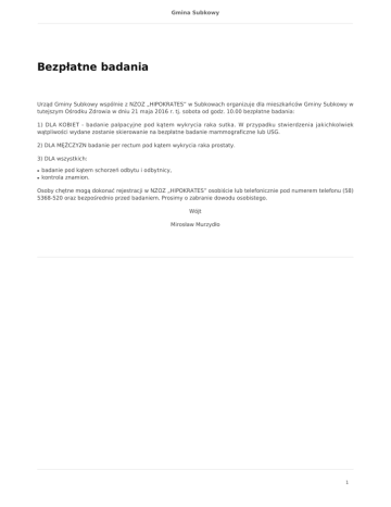 Gmina Subkowy Bezpłatne badania Urząd Gminy Subkowy wspólnie z NZOZ „HIPOKRATES” w Subkowach organizuje dla mieszkańców Gminy Subkowy w tutejszym Ośrodku Zdrowia w dniu 21 maja 2016 r. tj. sobota od godz. 10.00 bezpłatne badania: 1) DLA KOBIET - badanie palpacyjne pod kątem wykrycia raka sutka. W przypadku stwierdzenia jakichkolwiek wątpliwości wydane zostanie skierowanie na bezpłatne badanie mammograficzne lub USG. 2) DLA MĘŻCZYZN badanie per rectum pod kątem wykrycia raka prostaty. 3) DLA wszystkich: ● ● badanie pod kątem schorzeń odbytu i odbytnicy, kontrola znamion. Osoby chętne mogą dokonać rejestracji w NZOZ „HIPOKRATES” osobiście lub telefonicznie pod numerem telefonu (58) 5368-520 oraz bezpośrednio przed badaniem. Prosimy o zabranie dowodu osobistego. Wójt Mirosław Murzydło 1