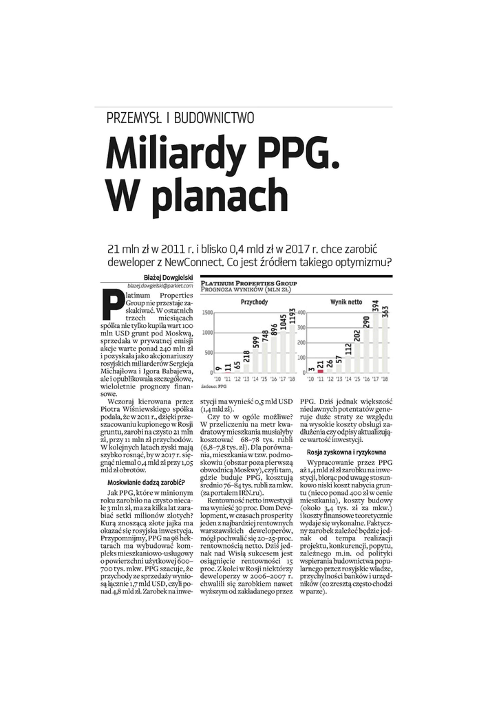 PRZEMYŚL I BUDOWNICTWO Miliardy PPG W planach 21 mln zł w 2011 r. i blisko 0,4 mld zł w 2017 r. chce zarobić deweloper z NewConnect. Co jest źródłem takiego optymizmu? Błażej Dowgielski P blazej.dowgielskilSiparkiet.com PLATTNITM PROPERTIES GROUP PROGNOZA WYNIKÓW (MLN ZL) latinum Properties Group nie przestaje za skakiwać. W ostatnich trzech miesiącach spółka nie tylko kupiła wart 100 mln USD grunt pod Moskwą, sprzedała w prywatnej emisji akcje warte ponad 240 mln zł i pozyskałajako akcjonariuszy rosyjskich miliarderów Sergieja Michajłowa i Igora Babajewa, ale i opublikowała szczegółowe, wieloletnie prognozy finan sowe. Wczoraj kierowana przez Piotra Wiśniewskiego spółka podała, że w 2011 r., dzięki prze szacowaniu kupionego w Rosji gruntu, zarobi na czysto 21 mln zl, przy 11 mln zl przychodów. W kolejnych latach zyski mają szybko rosnąć, by w 2017 r. się gnąć niemal 0 4 mld zl przy 1,05 mld zl obrotów. Moskwianie dadzą zarobić? Jak PPG, które w minionym roku zarobiło na czysto nieca łe 3 mln zl, ma za kilka lat zara biać setki milionów złotych? Kurą znoszącą złote jajka ma okazać się rosyjska inwestycja. Przypomnijmy, PPG na 98 hek tarach ma wybudować kom pleks mieszkaniowo-uslugowy o powierzchni użytkowej 600700 tys. mkw. PPG szacuje, że przychody ze sprzedaży wynio są łącznie 1,7 mld USD, czyli po nad 4,8 mld zł. Zarobek na inwe- Przychody Wynik netto 5 10 '11 '12 '13 '14 '15 '14 '17 '« '10 "11 '12 13 'H 15 1 * 17 IB :KJ 'M'J stycji ma wynieść 0,5 mld USD (14mld zł). Czy to w ogóle możliwe? W przeliczeniu na metr kwa dratowy mieszkania musiałyby kosztować 68-78 tys. rubli (6,8-7,8 tys. zł). Dla porówna nia, mieszkaniawtzw. podmoskowiu (obszar poza pierwszą obwodnicą Moskwy), czyli tam, gdzie buduje PPG, kosztują średnio 76-84 tys. rubli za mkw. (za portalem IRN.ru). Rentowność netto inwestycji ma wynieść 30 proc. Dom Deve lopment, w czasach prosperity jeden z najbardziej rentownych warszawskich deweloperów, mógł pochwalić się 20-25-proc. rentownością netto. Dziś jed nak nad Wisłą sukcesem jest osiągnięcie rentowności 15 proc. Z kolei w Rosji niektórzy deweloperzy w 2006-2007 r. chwalili się zarobkiem nawet wyższym od zakładanego przez PPG. Dziś jednak większość niedawnych potentatów gene ruje duże straty ze względu na wysokie koszty obsługi za dłużenia czy odpisy aktualizują ce wartość inwestycji. Rosja zyskowna i ryzykowna Wypracowanie przez PPG aż 14 mld zł zł zarobku na inwe stycji, biorąc pod uwagę stosun kowo niski koszt nabycia grun tu (nieco ponad 400 zł w cenie mieszkania), koszty budowy (około 3,4 tys. zł za mkw.) i koszty finansowe teoretycznie wydaje się wykonalne. Faktycz ny zarobek zależeć będzie jed nak od tempa realizacji projektu, konkurencji, popytu, zależnego m.in. od polityki wspierania budownictwa popu larnego przez rosyjskie władze, przychylności banków i urzęd ników (co zresztą często chodzi w parze).